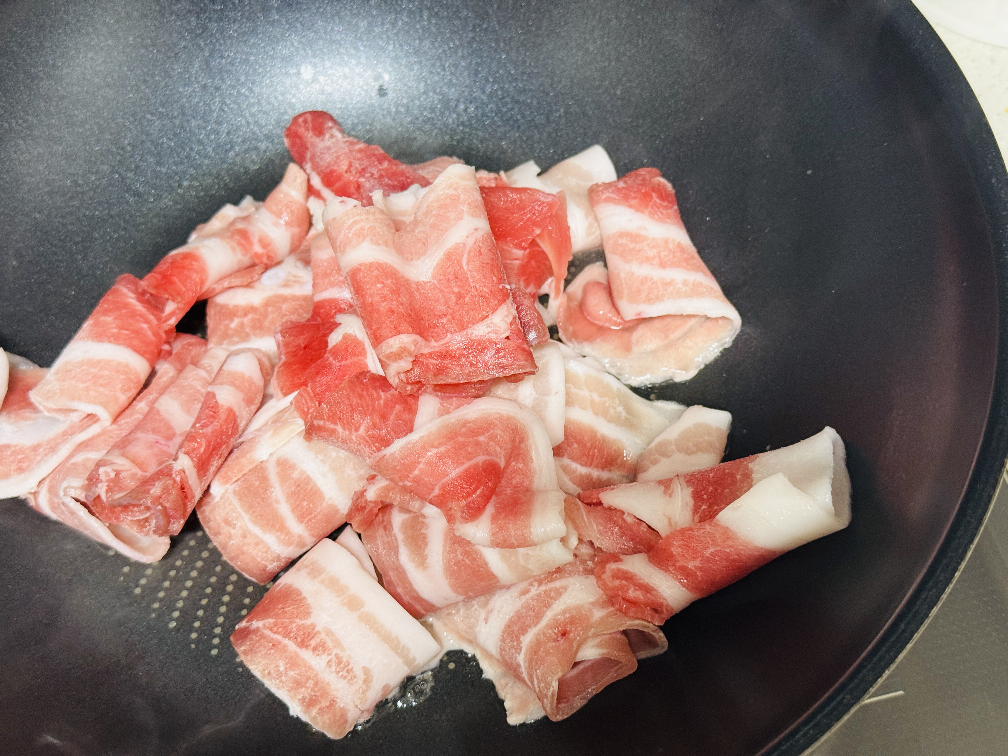 달군 팬에 대패 삼겹살을 먼저 구워주세요.