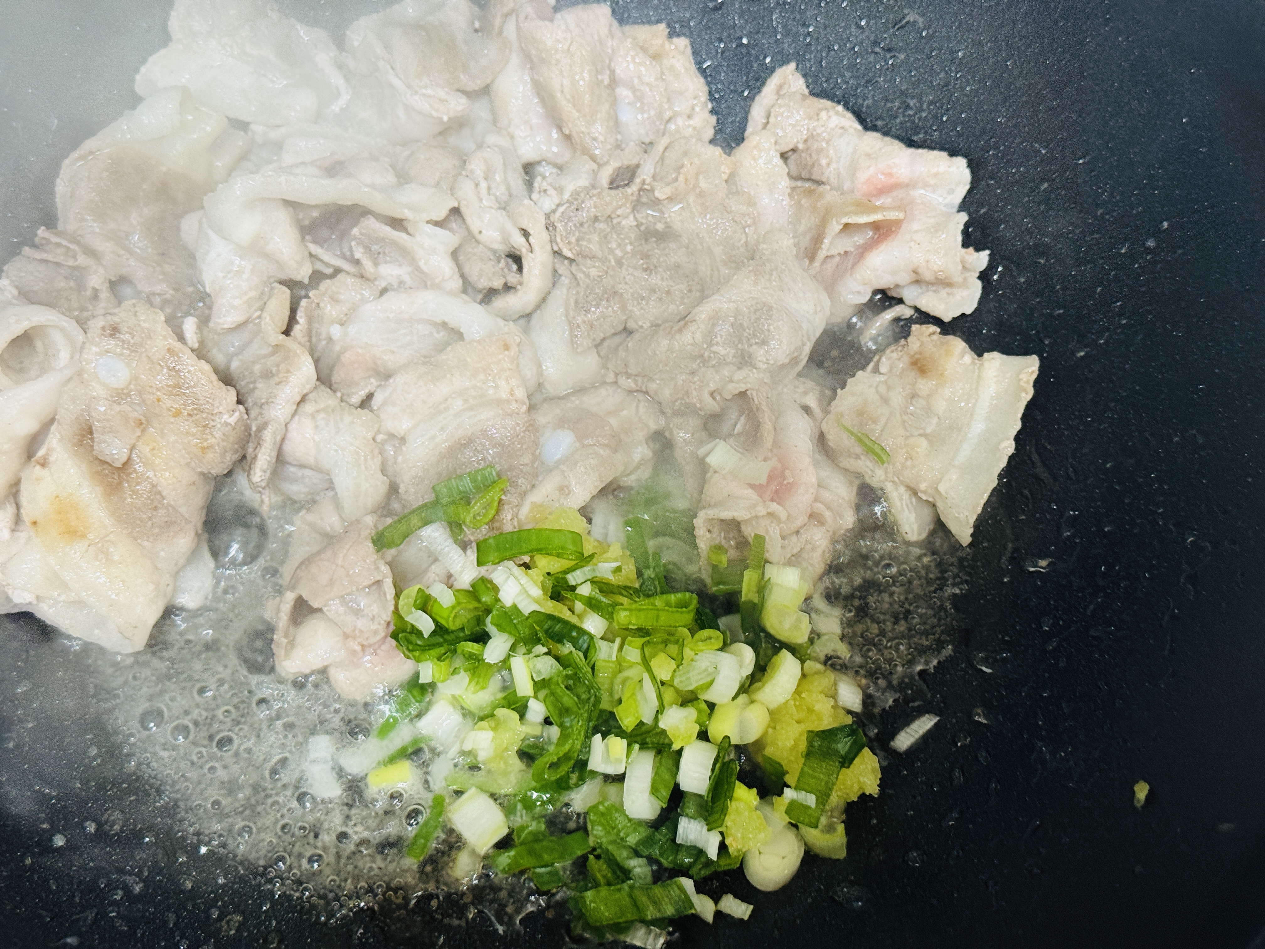 대패 삼겹살에서 기름이 나오면 다짐 파와 마늘 넣어 향을 내줍니다.