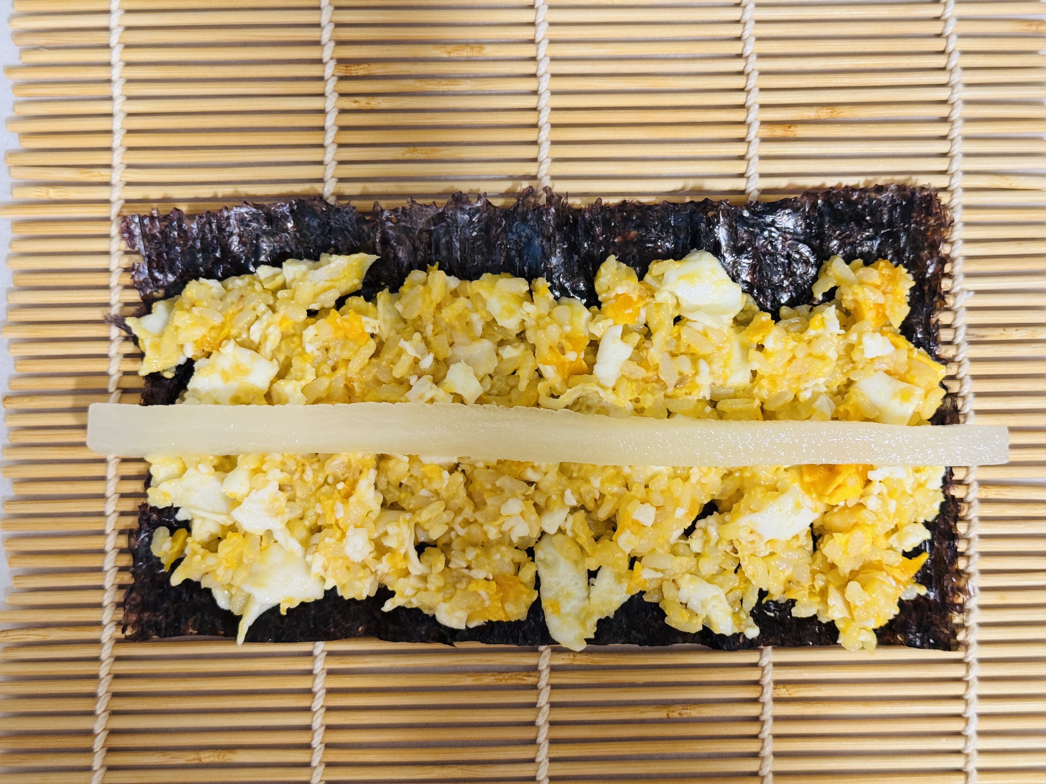 김 반으로 잘라 밥 올려주고 단무지 하나 넣어 말아주면 끝입니다ㅎ 너무 간단하죵ㅎ