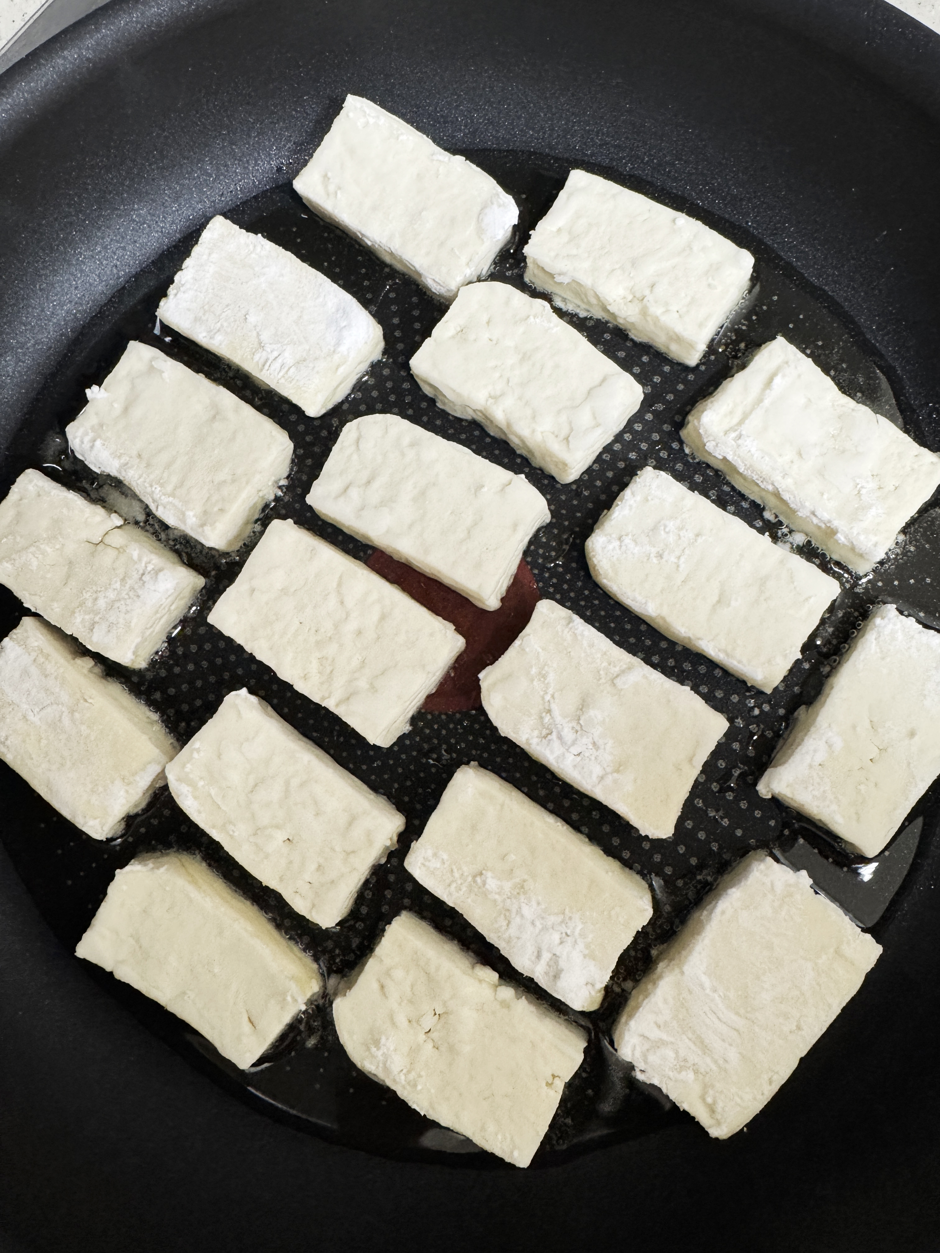 달궈진 팬에 기름을 두르고 두부를 올려주세요.