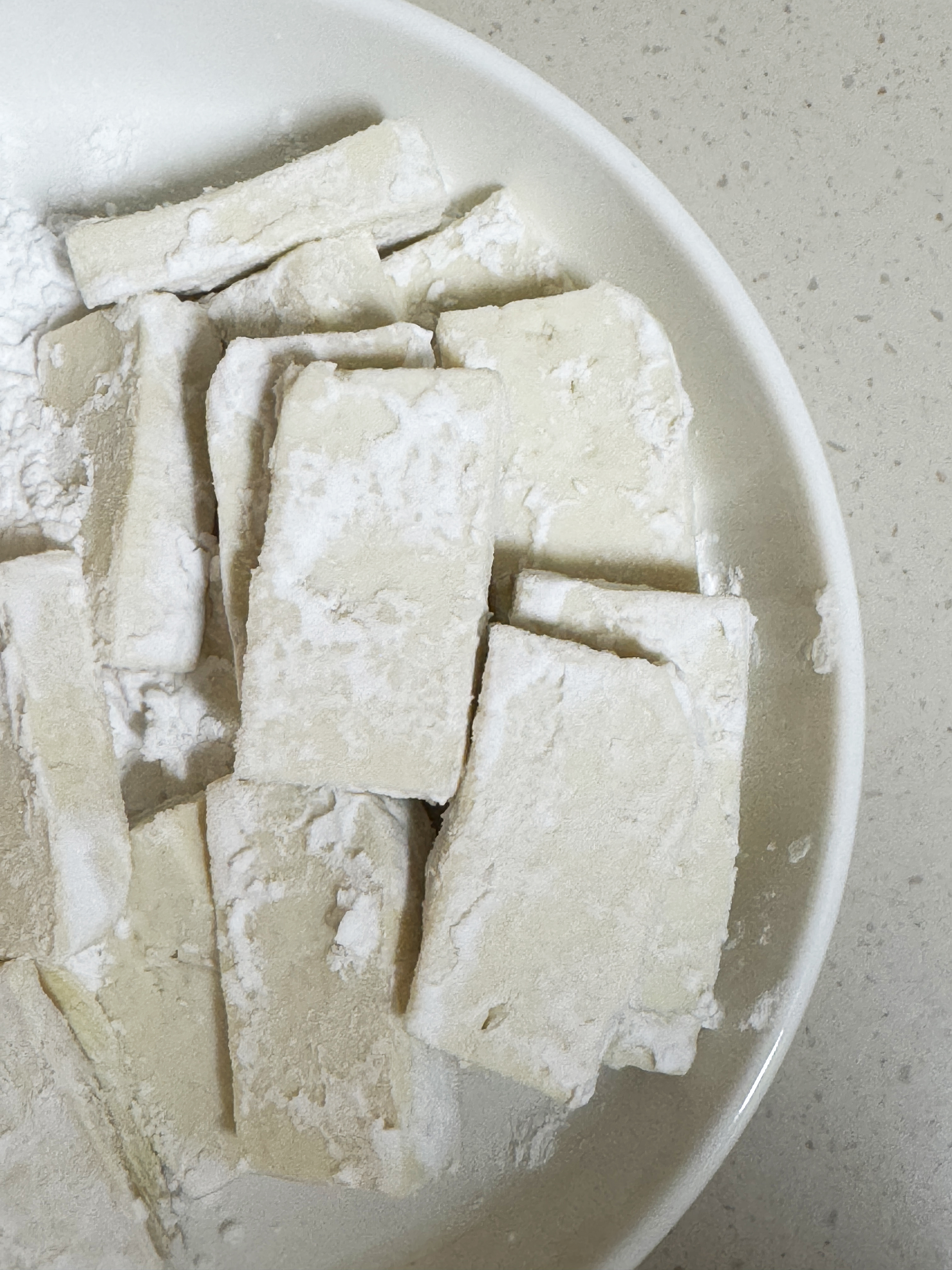 그 사이 물기가 잘 빠진 두부는 전분가루를 골고루 뭍혀