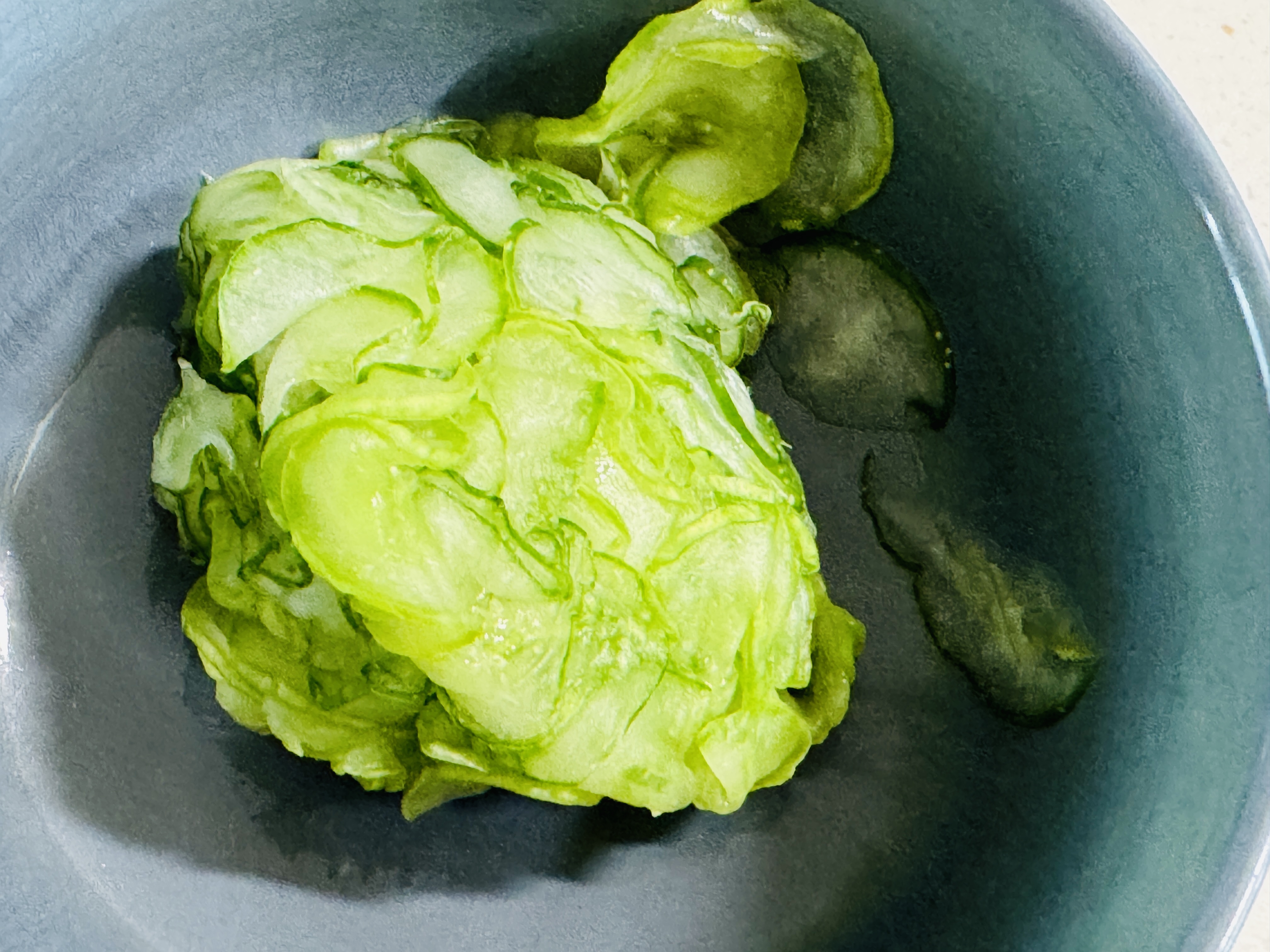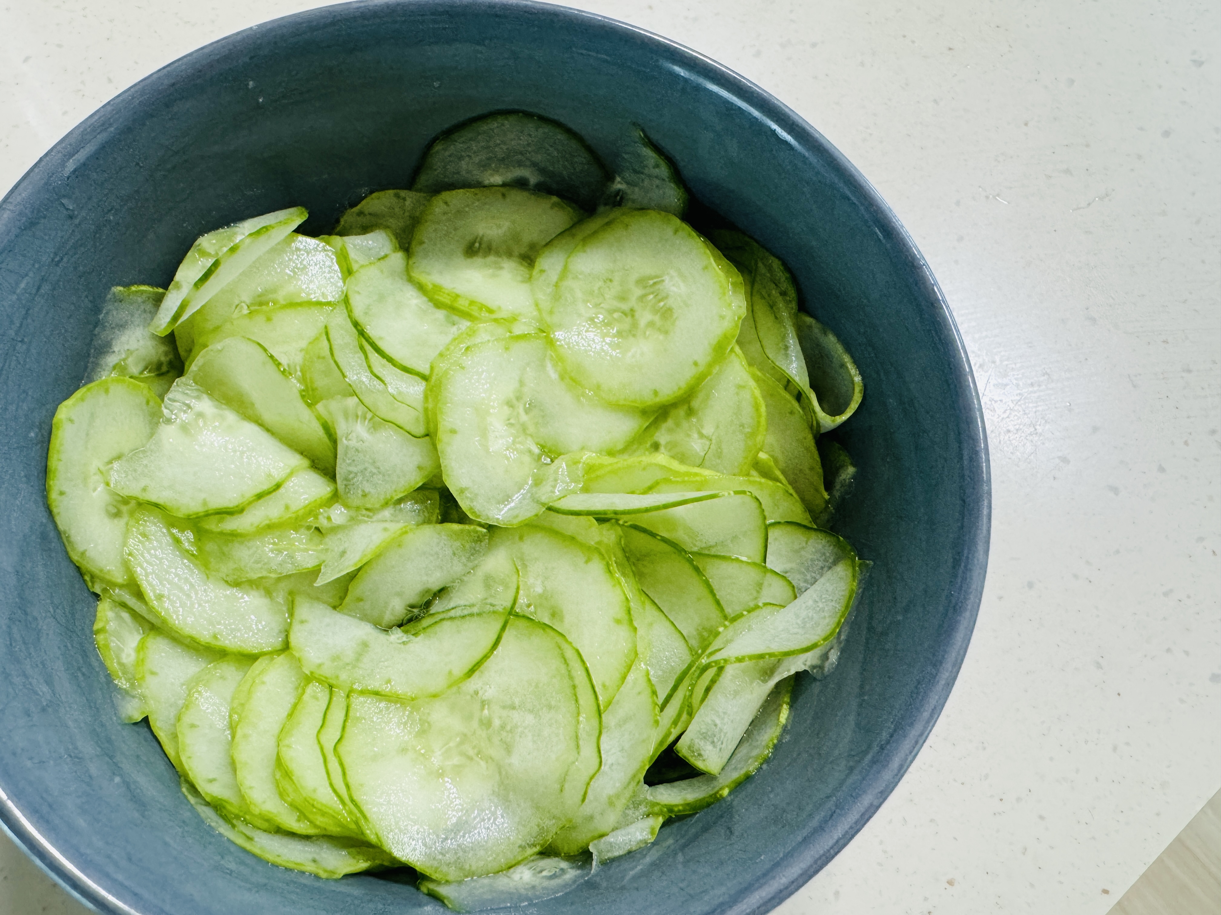 오이는 얇게 썰어 소금에 10분정도 절여준뒤 물기를 꽉 짜서 준비해주세요.