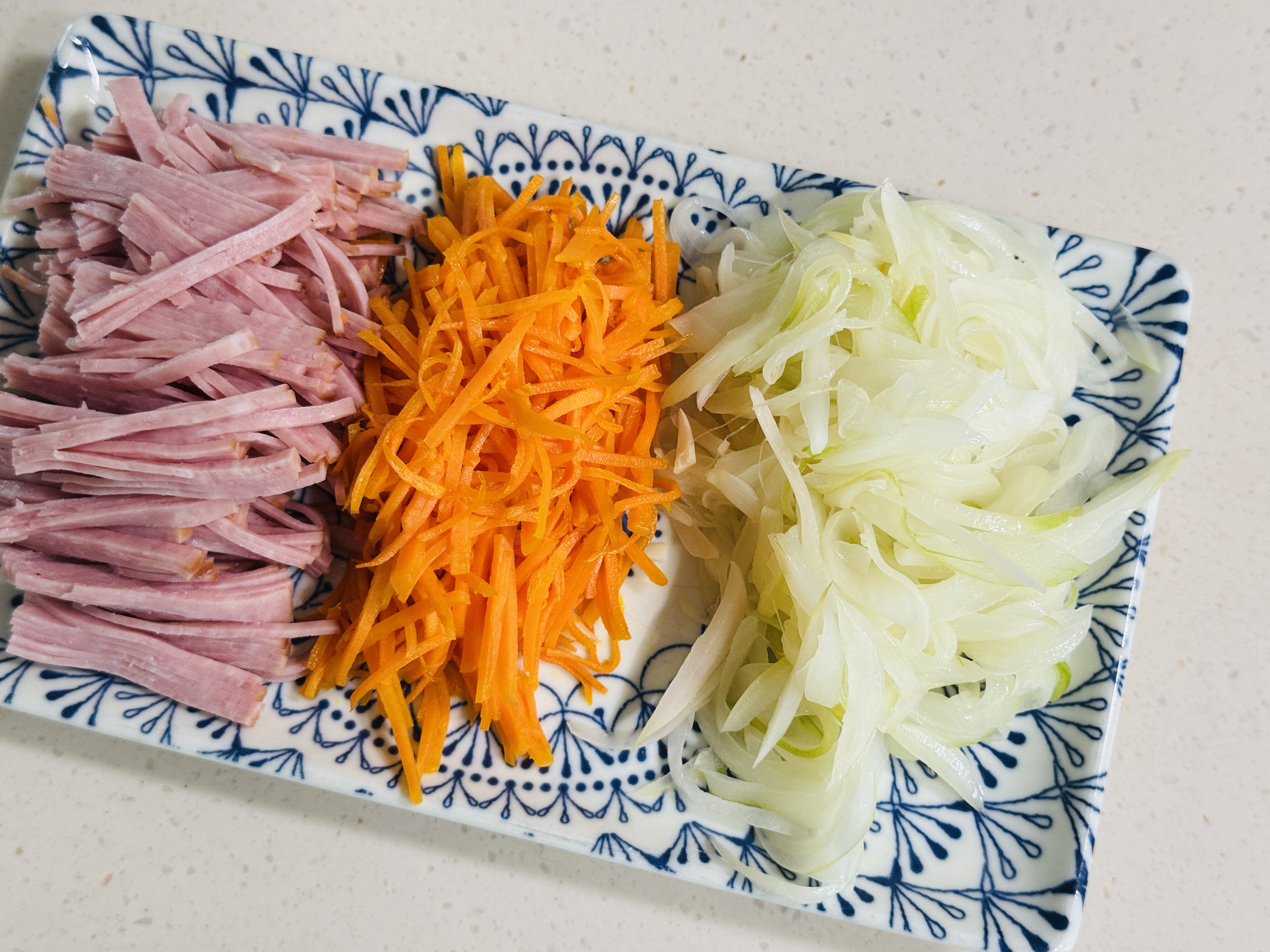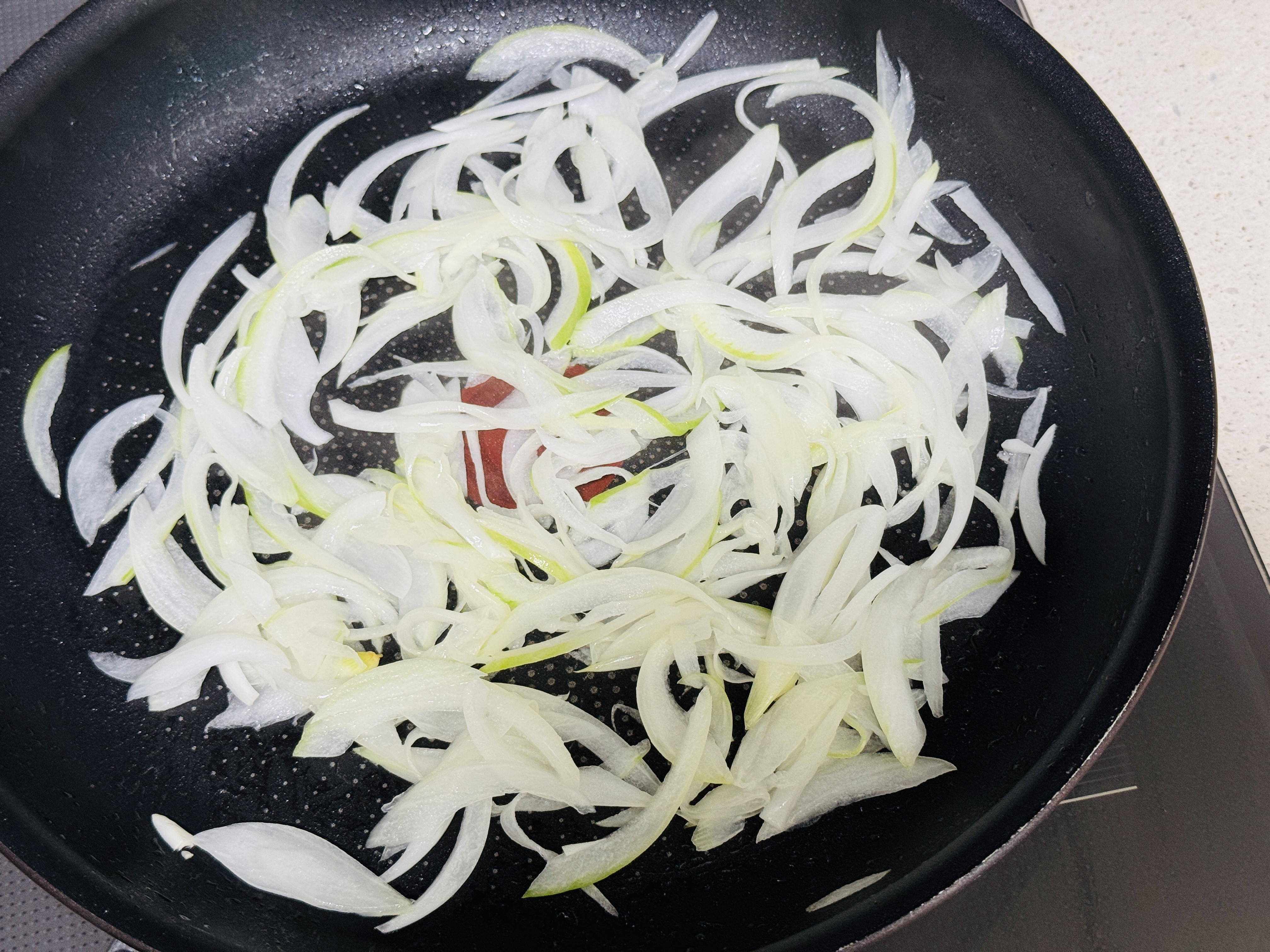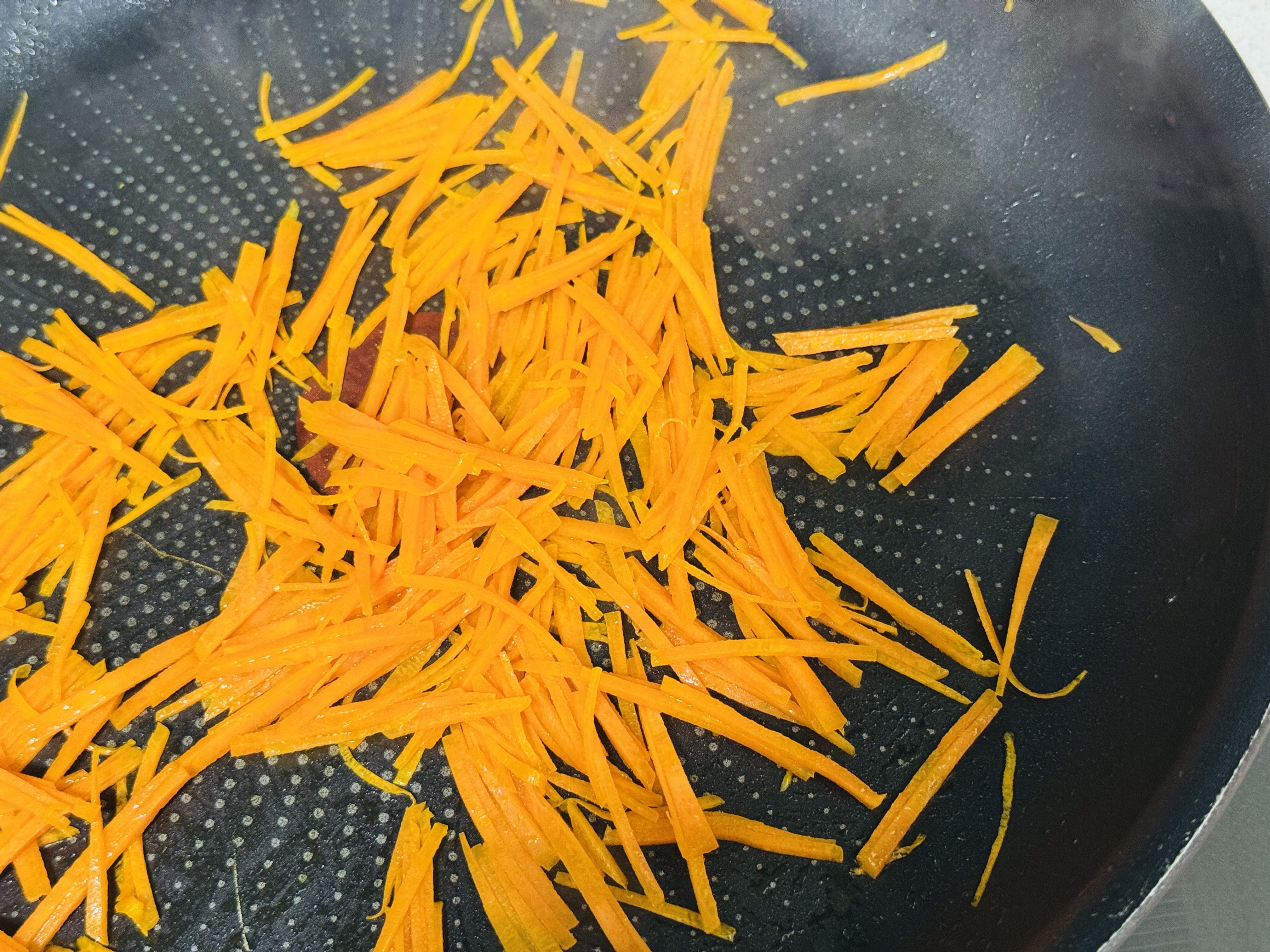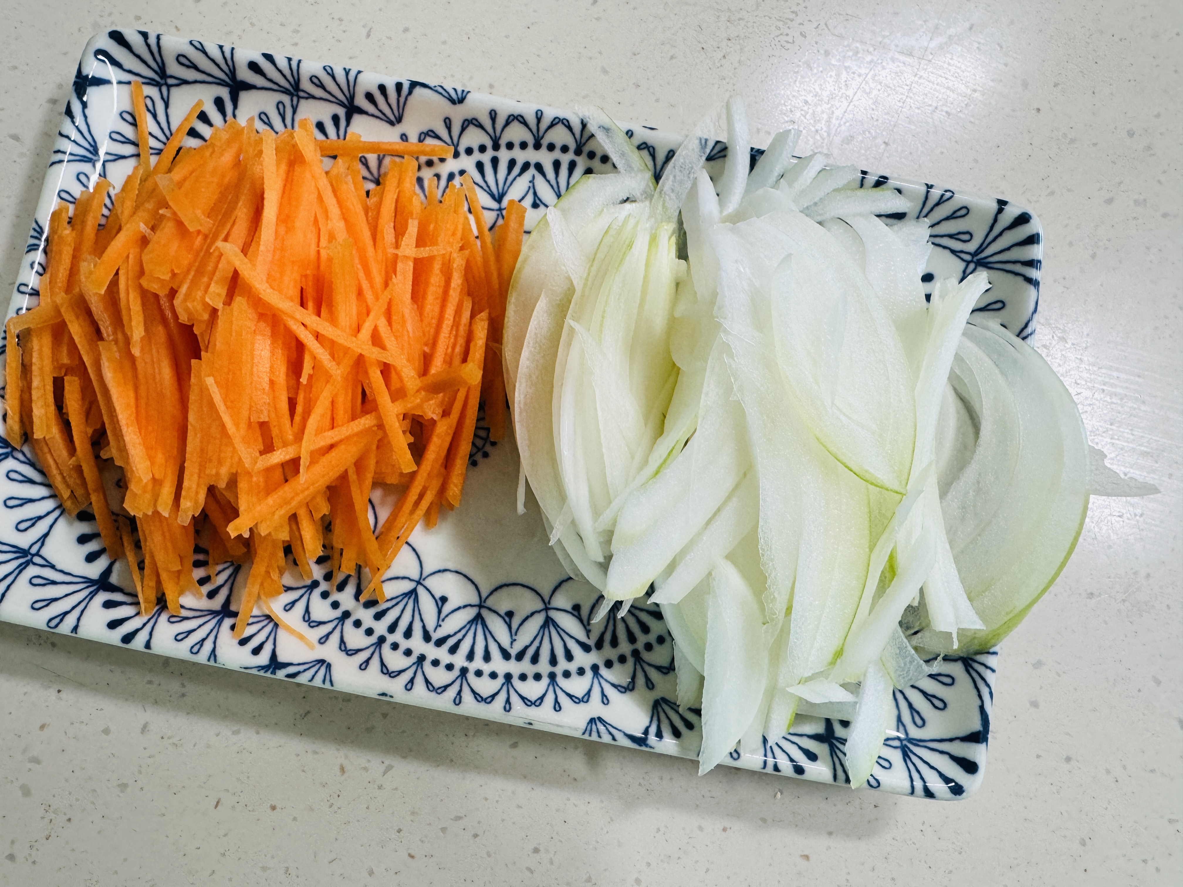 양파, 당근은 가늘게 채썰어 팬에 가볍게 볶아 준비해 주세요. 볶을때 소금간 해주세요:)