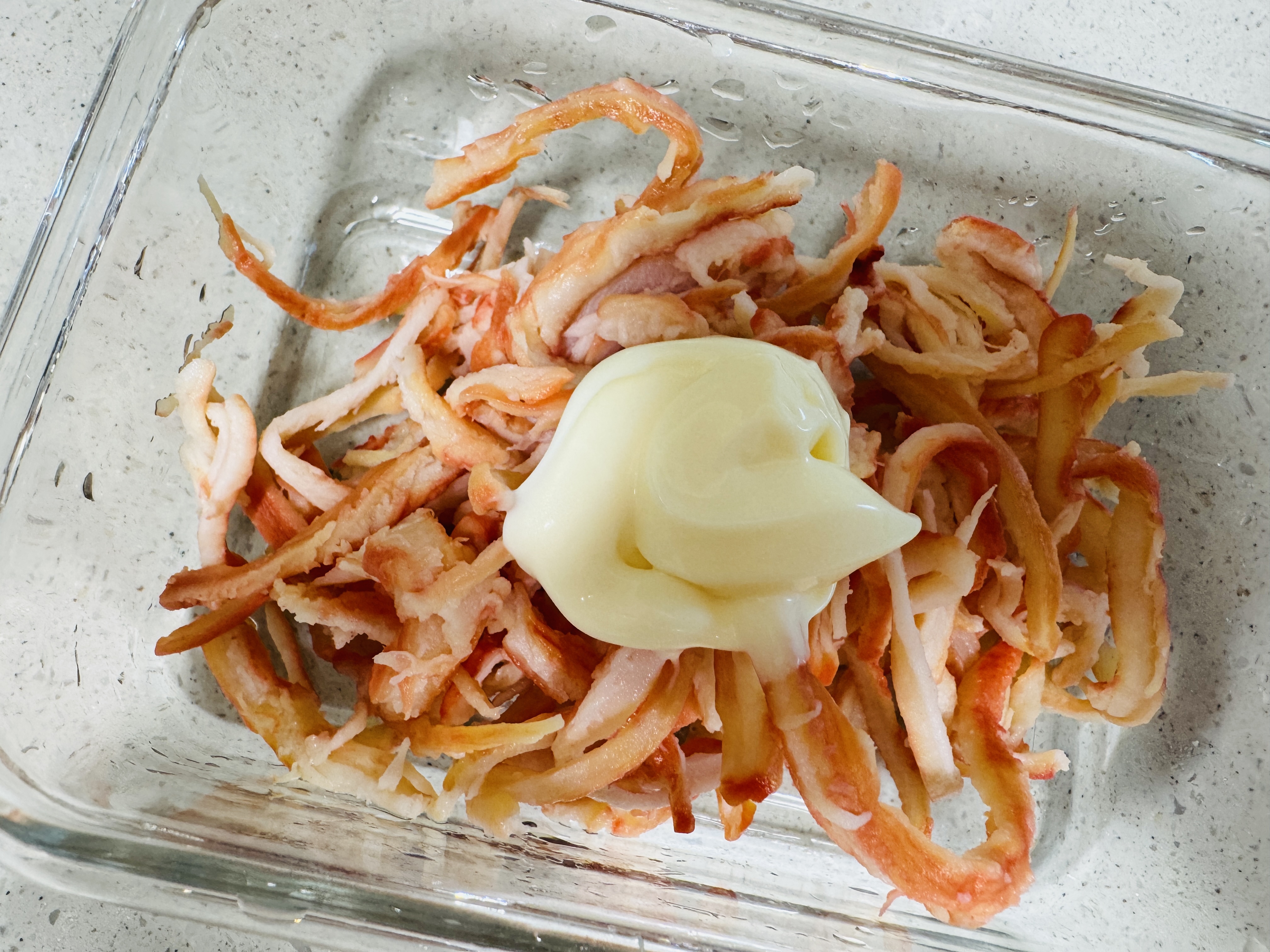 진미채가 촉촉해지면 물기를 꽉 짜고 마요네즈 1T 넣어 부드러워 지게 버무려 주세요.