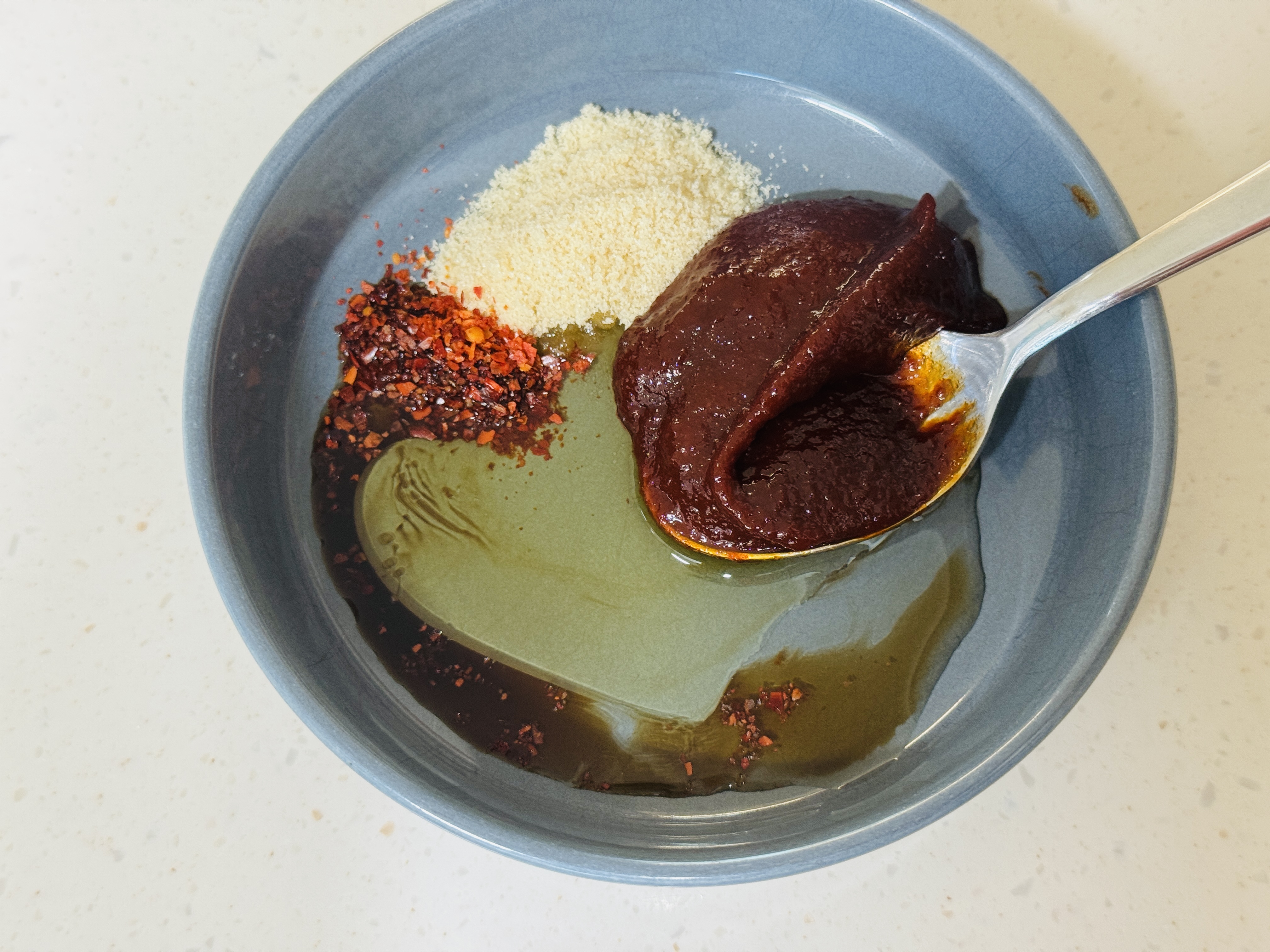 고추장 1T, 고춧가루 1/4T, 설탕 1/2T, 알룰로스 1T, 진간장 1/2T, 참기름 1T, 물 2T 섞어 양념장 만들어 주세요.