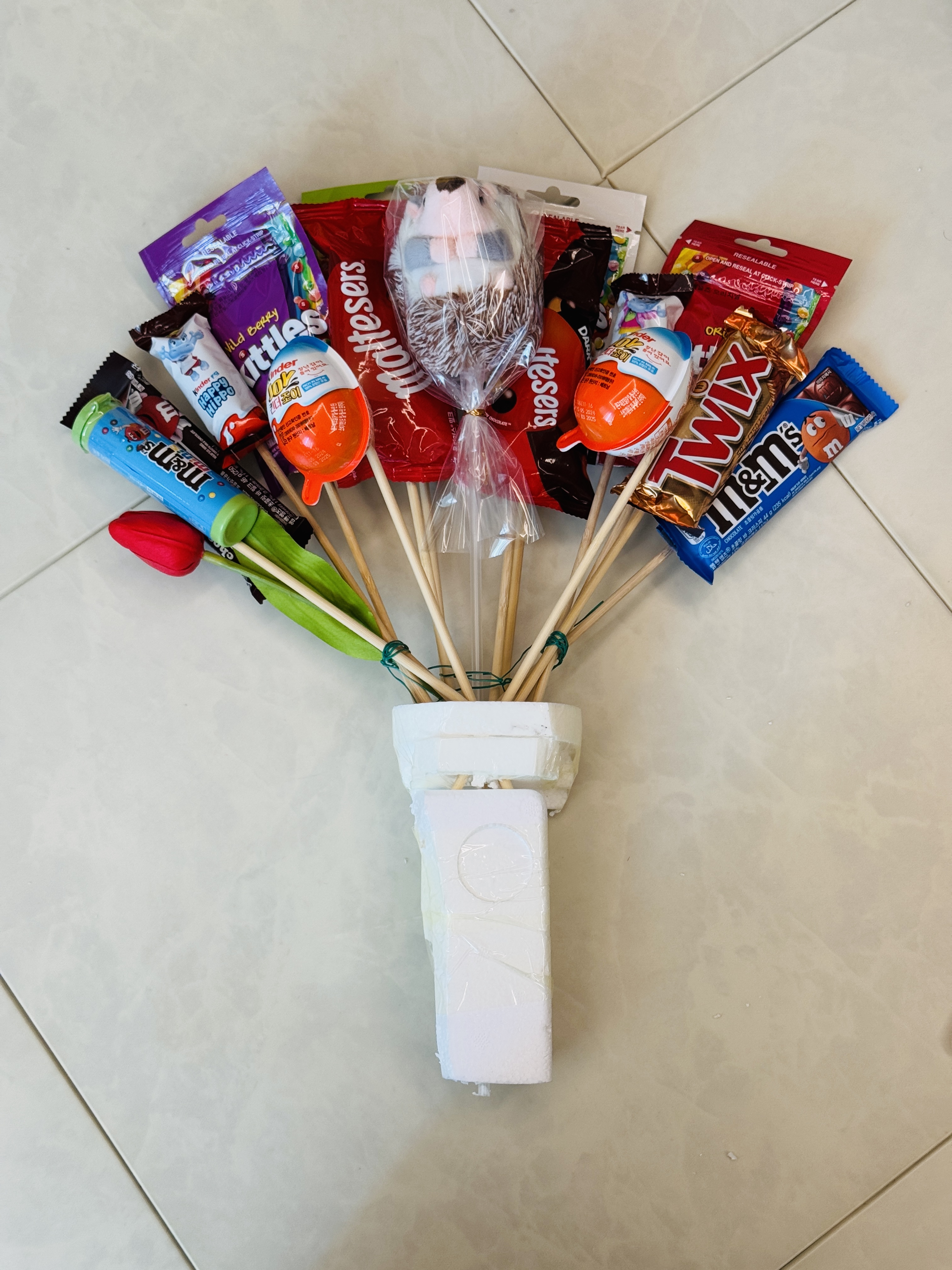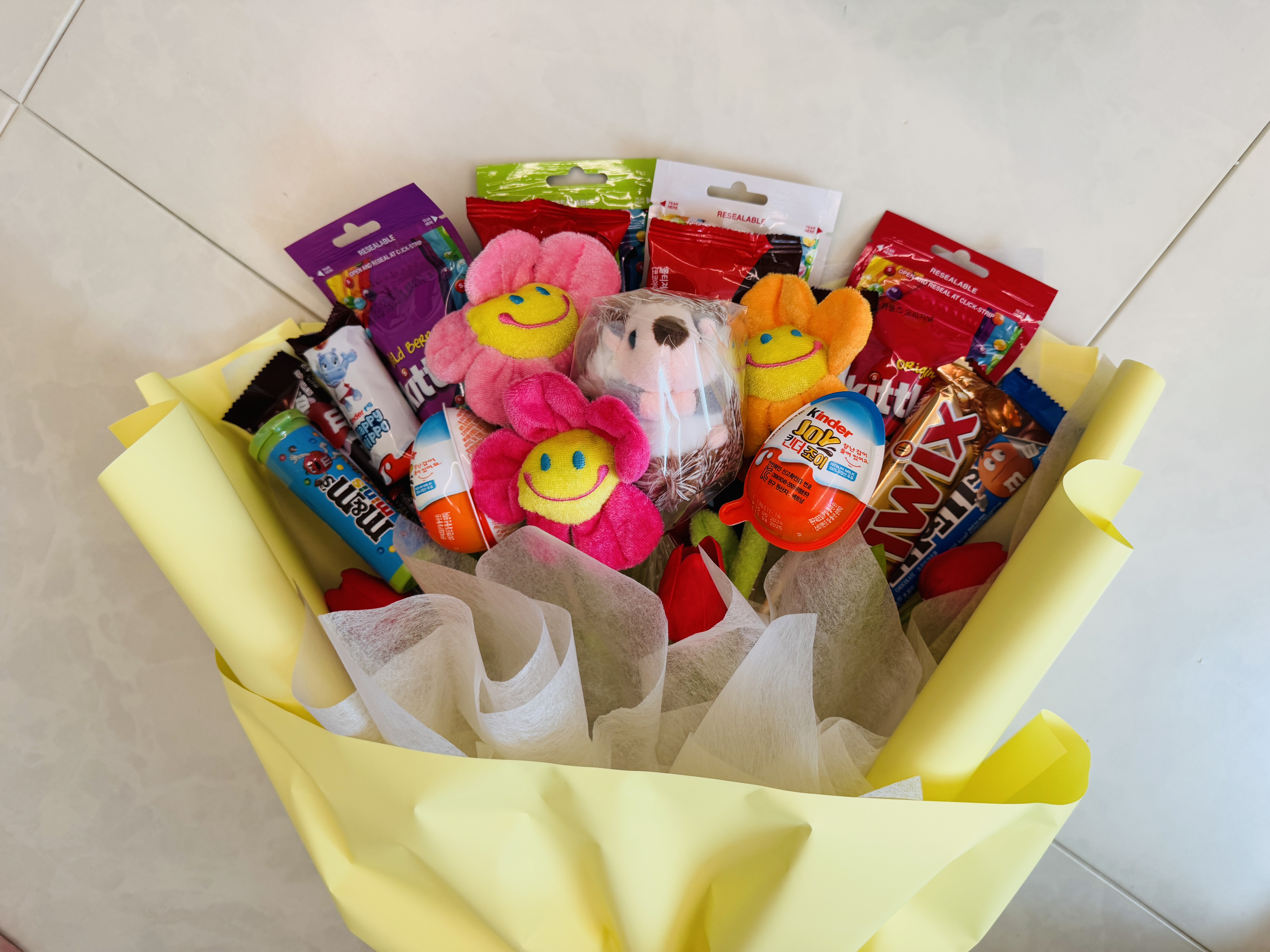 간식 가득 꽃다발 완성이예요:) 허술하지만 몇번의 발표회를 거치다 보니 엄마의 만족도 보단 아이가 좋아하는 꽃다발이 최고더라고요.. 초반엔 저도 제 눈에 이뻐보이는 고가의 꽃다발을 구매하곤 했는데 다 소용 없어요ㅎ 먹는게 남는것ㅎㅎ 입니다ㅎ
