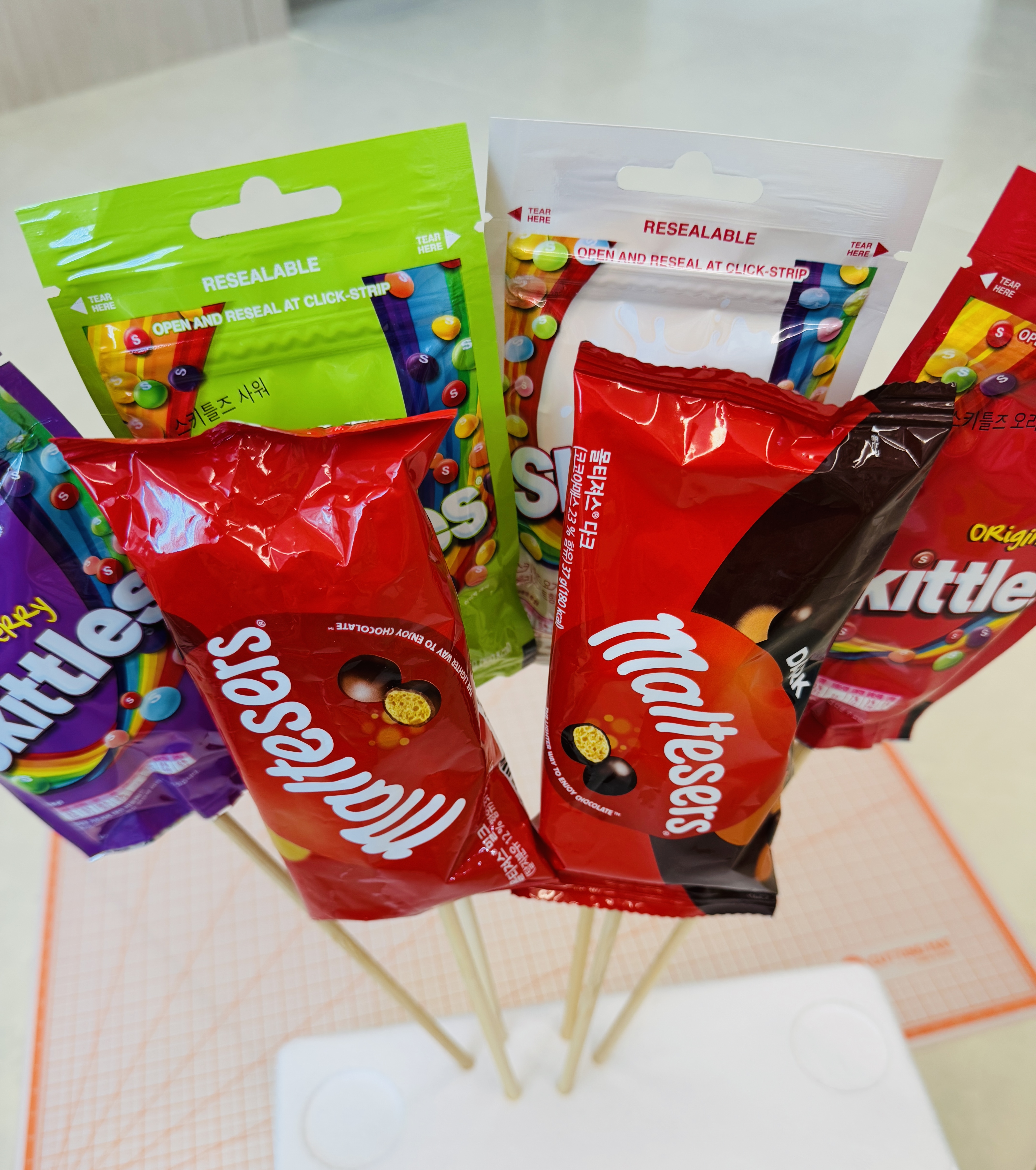 준비된 간식에는 대나무 꼬치를 테이프를 이용해 붙여주세요. 스트로폼레 꽂을 예정이러 뾰족한 부분이 아래로 가도록 붙여주었어요.