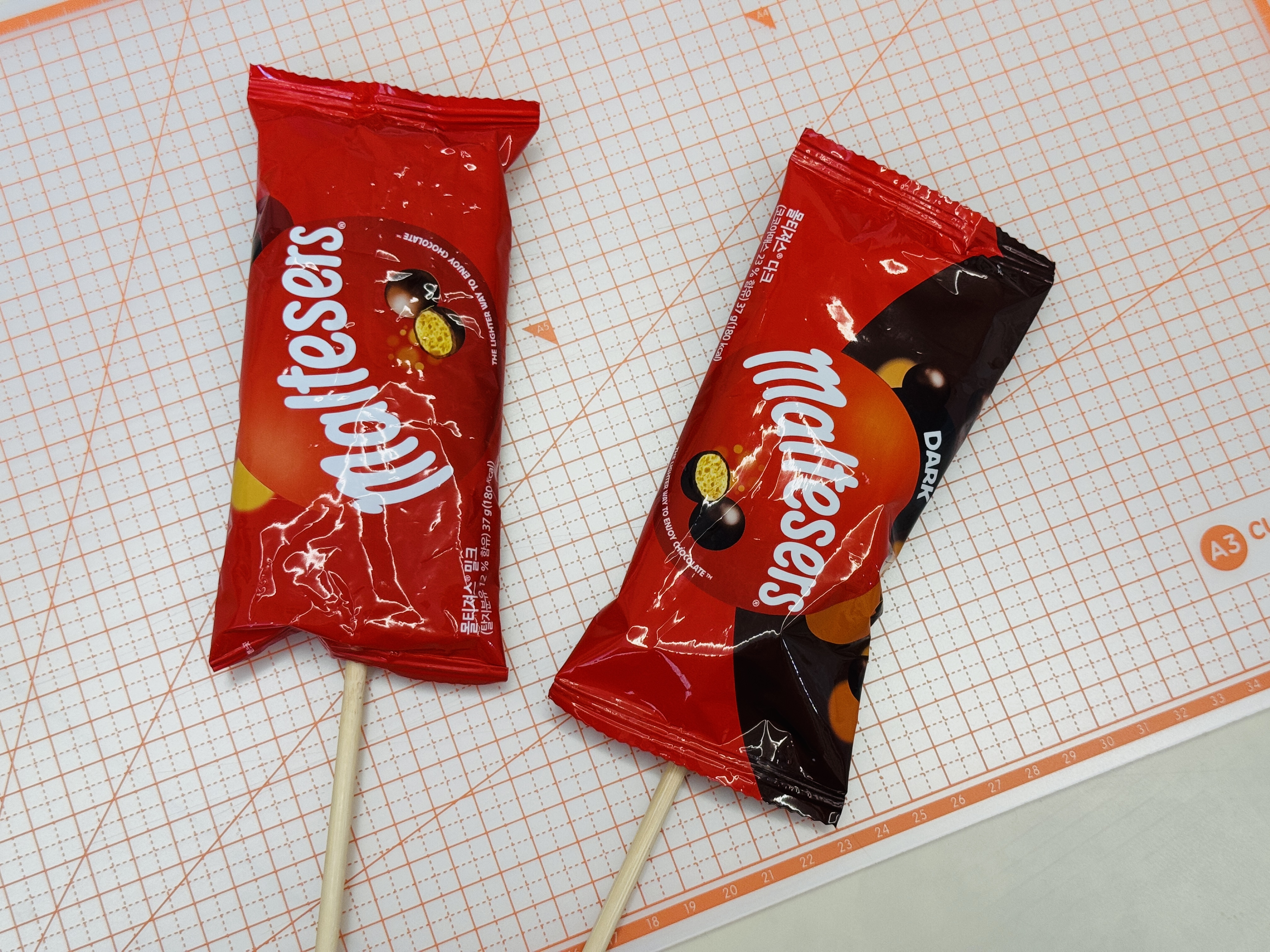 준비된 간식에는 대나무 꼬치를 테이프를 이용해 붙여주세요. 스트로폼레 꽂을 예정이러 뾰족한 부분이 아래로 가도록 붙여주었어요.
