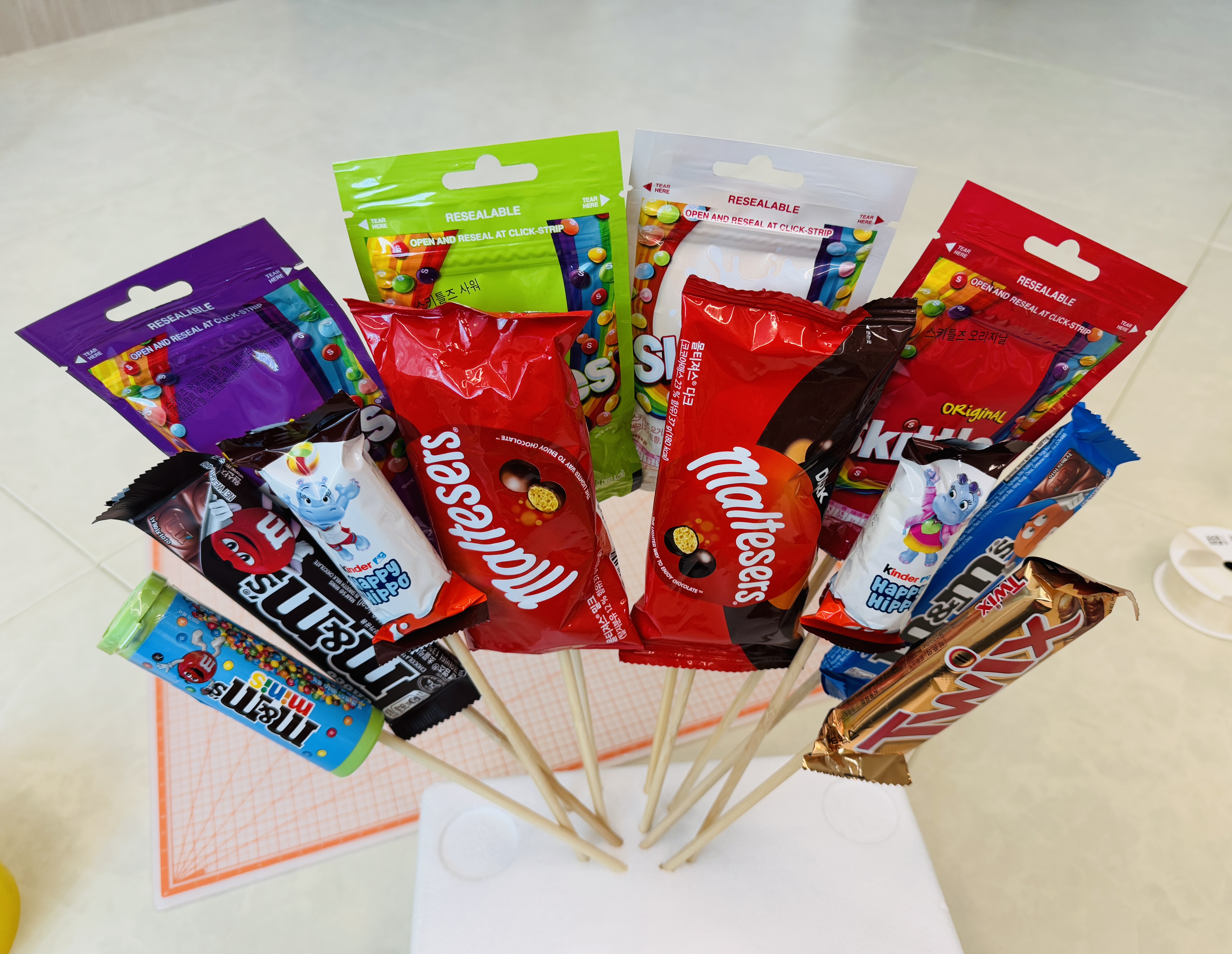 간식 가득 꽃다발 완성이예요:) 허술하지만 몇번의 발표회를 거치다 보니 엄마의 만족도 보단 아이가 좋아하는 꽃다발이 최고더라고요.. 초반엔 저도 제 눈에 이뻐보이는 고가의 꽃다발을 구매하곤 했는데 다 소용 없어요ㅎ 먹는게 남는것ㅎㅎ 입니다ㅎ