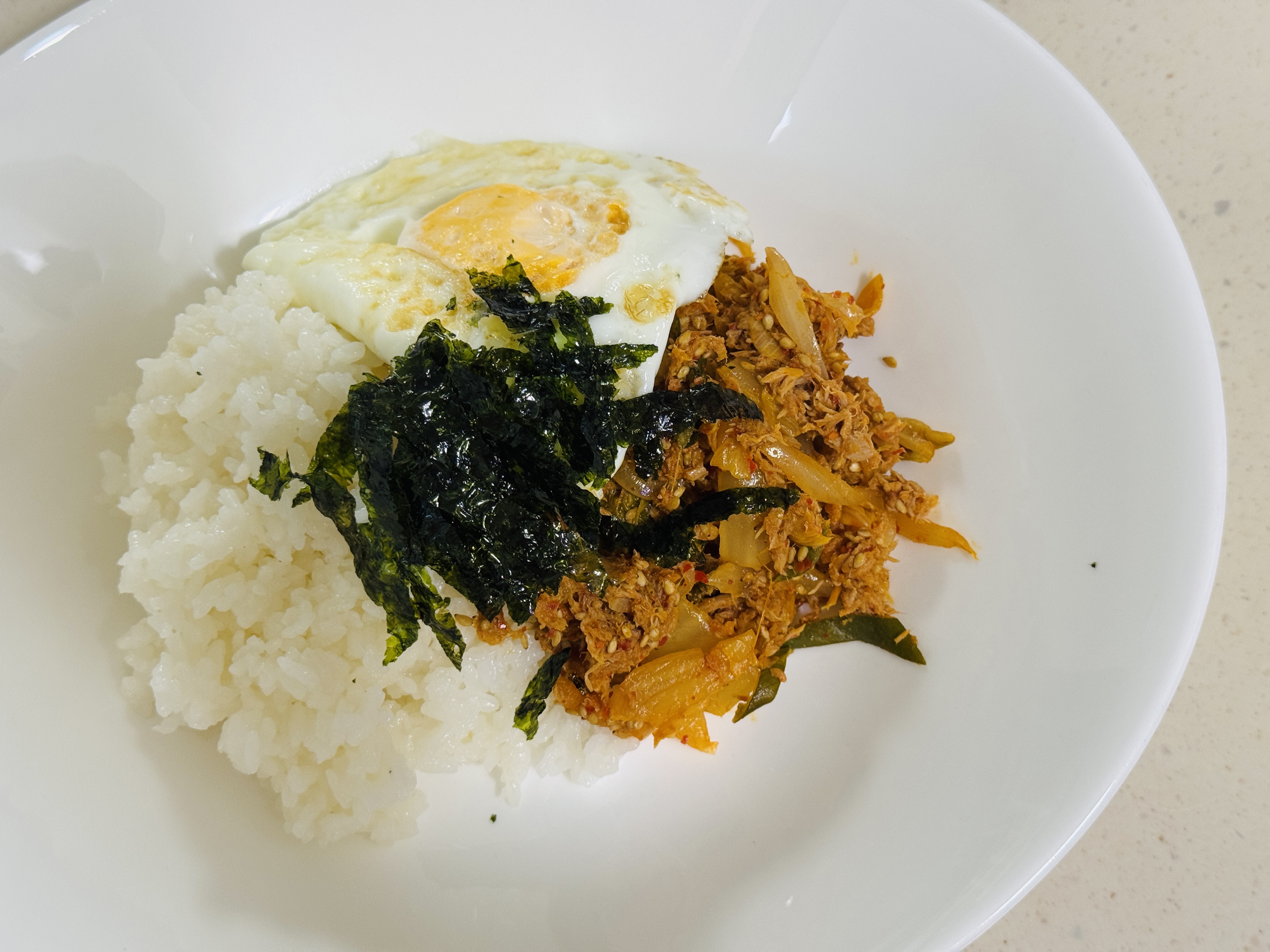 밥 1공기에 달걀프라이 올리고 참치 김치 볶음올린뒤 조미김 잘라 올려주면 완성입니다:)