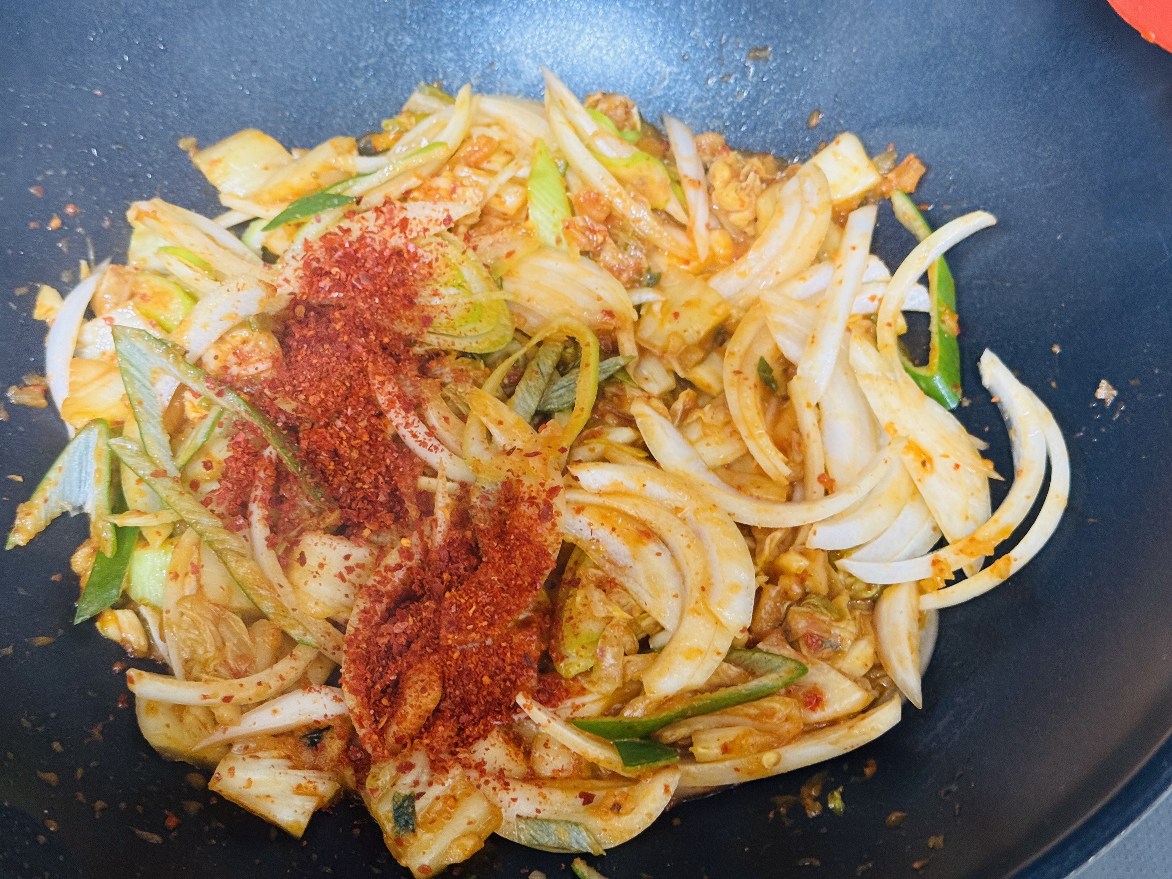 김치가 적당히 볶아지면 양파와 파를 넣어 볶아주세요.