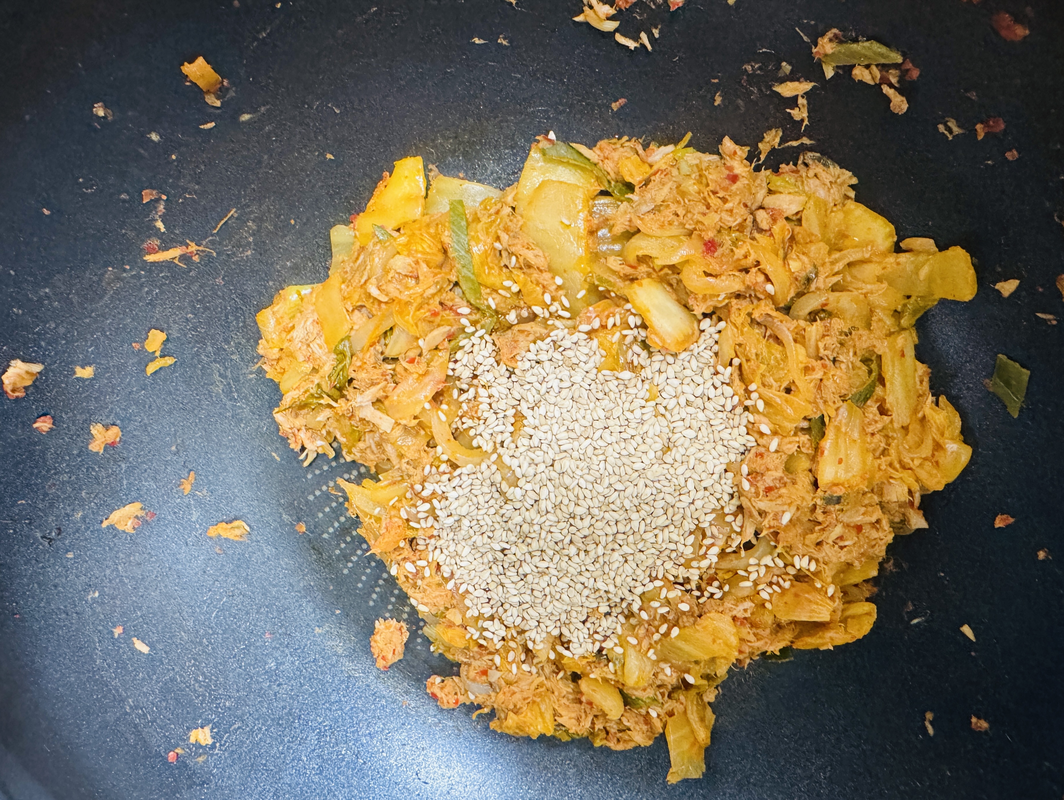 달군 펜에 참치 기름을 3T넣고 김치 넣어 중약불에서 볶아 주세요. 김치를 잘 볶아야 맛있어요.