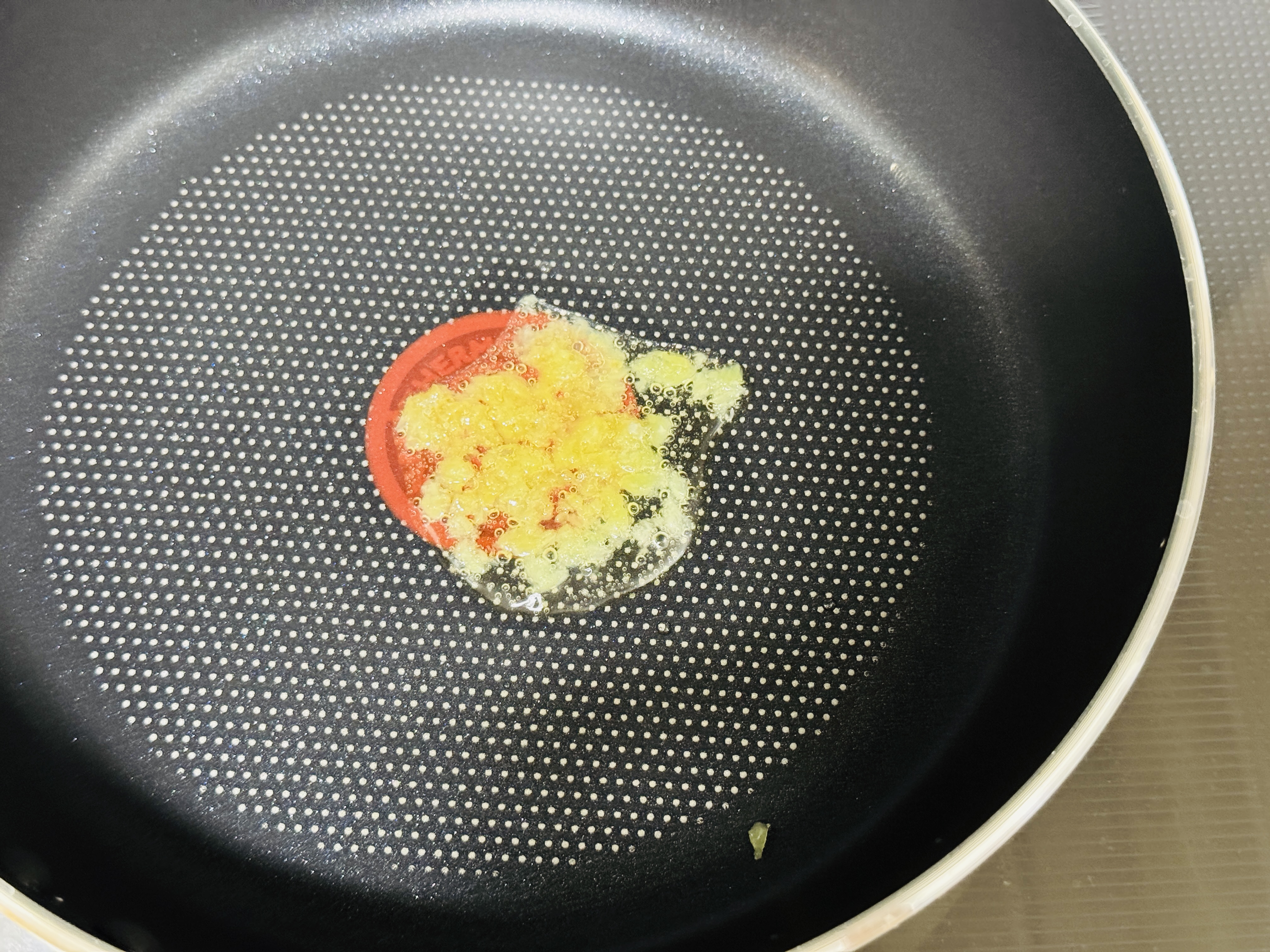 팬에 기름을 두르고 다진 마늘 넣어 약한 불에서 볶아주세요.