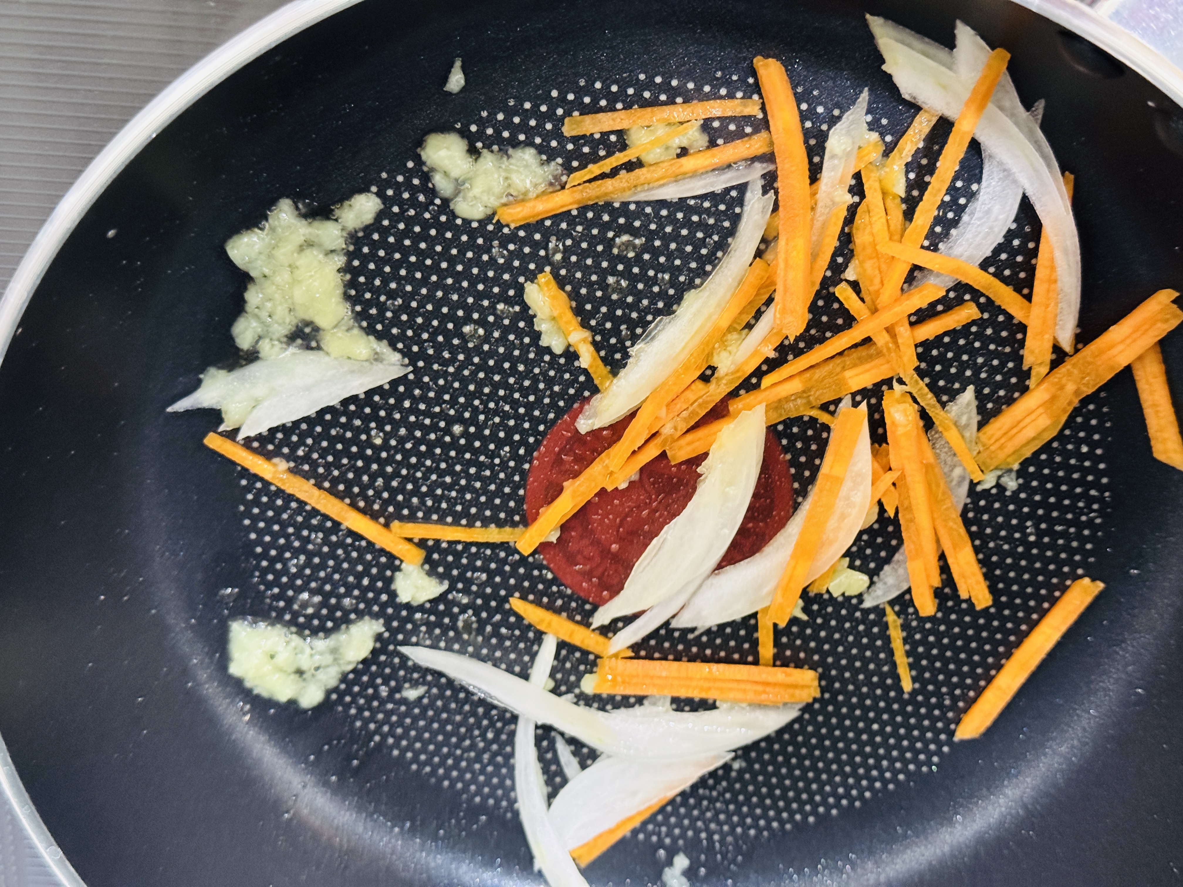 마늘향이 올라오면 당근과 양파를 넣어 먼저 볶아주세요.