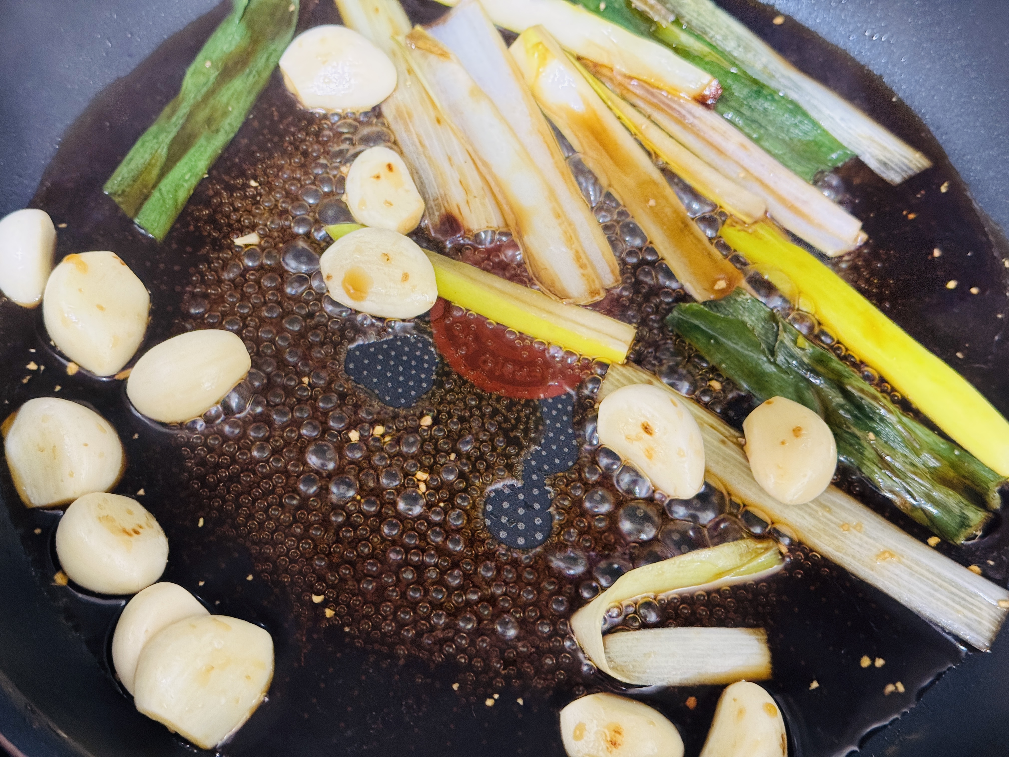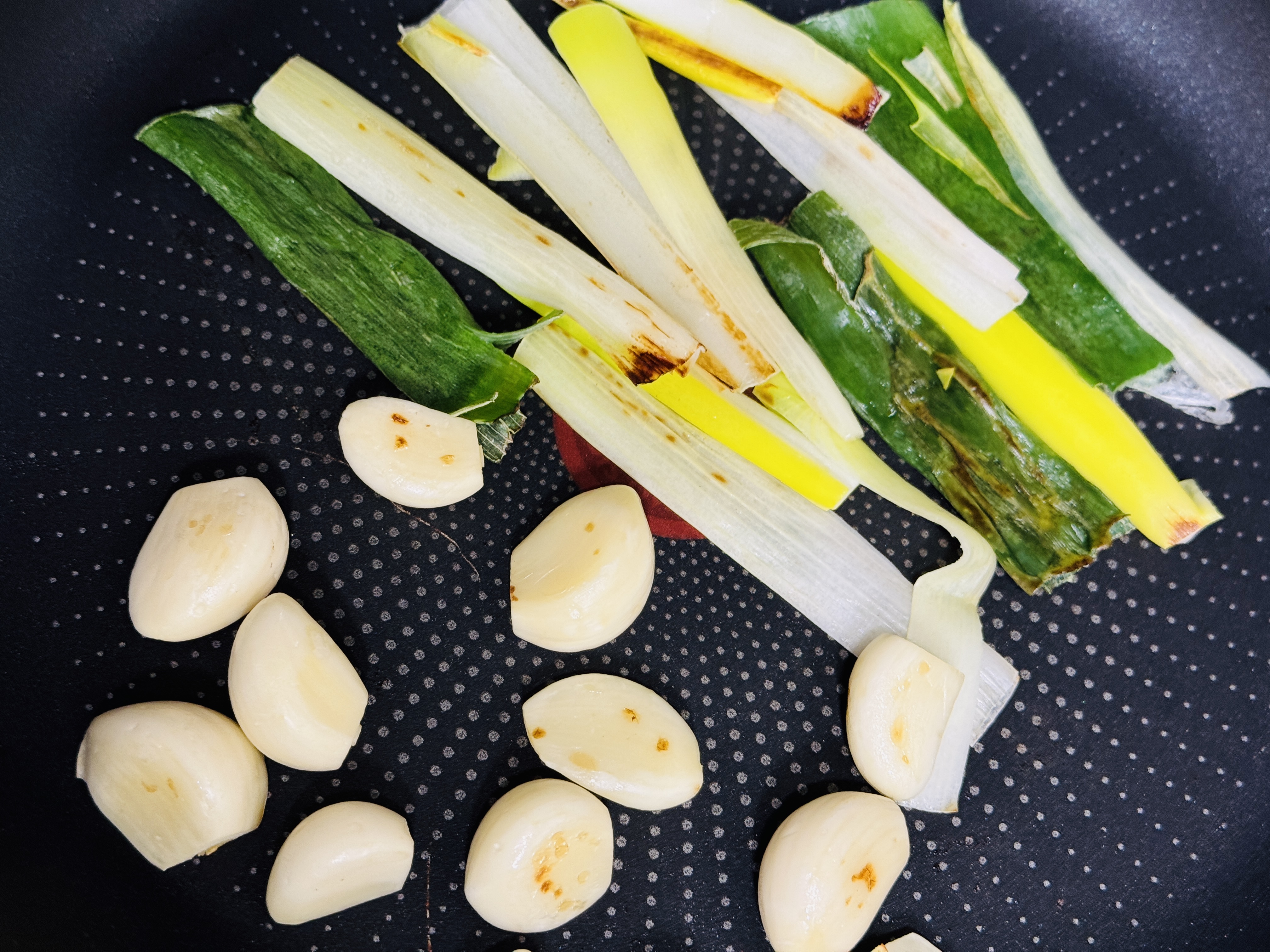 마른펜에 파와 통마늘을 넣어 노릇하게 구워주세요.