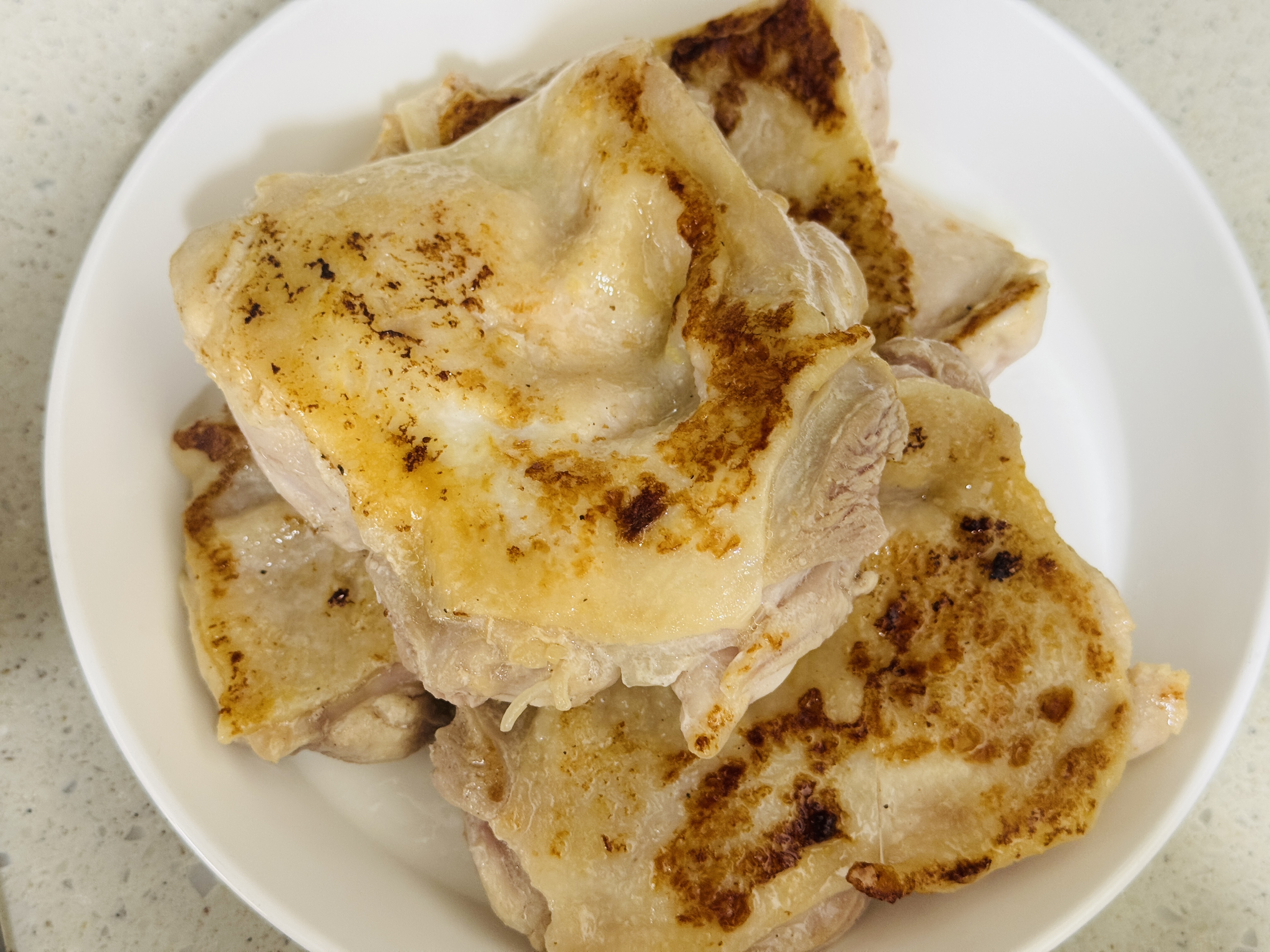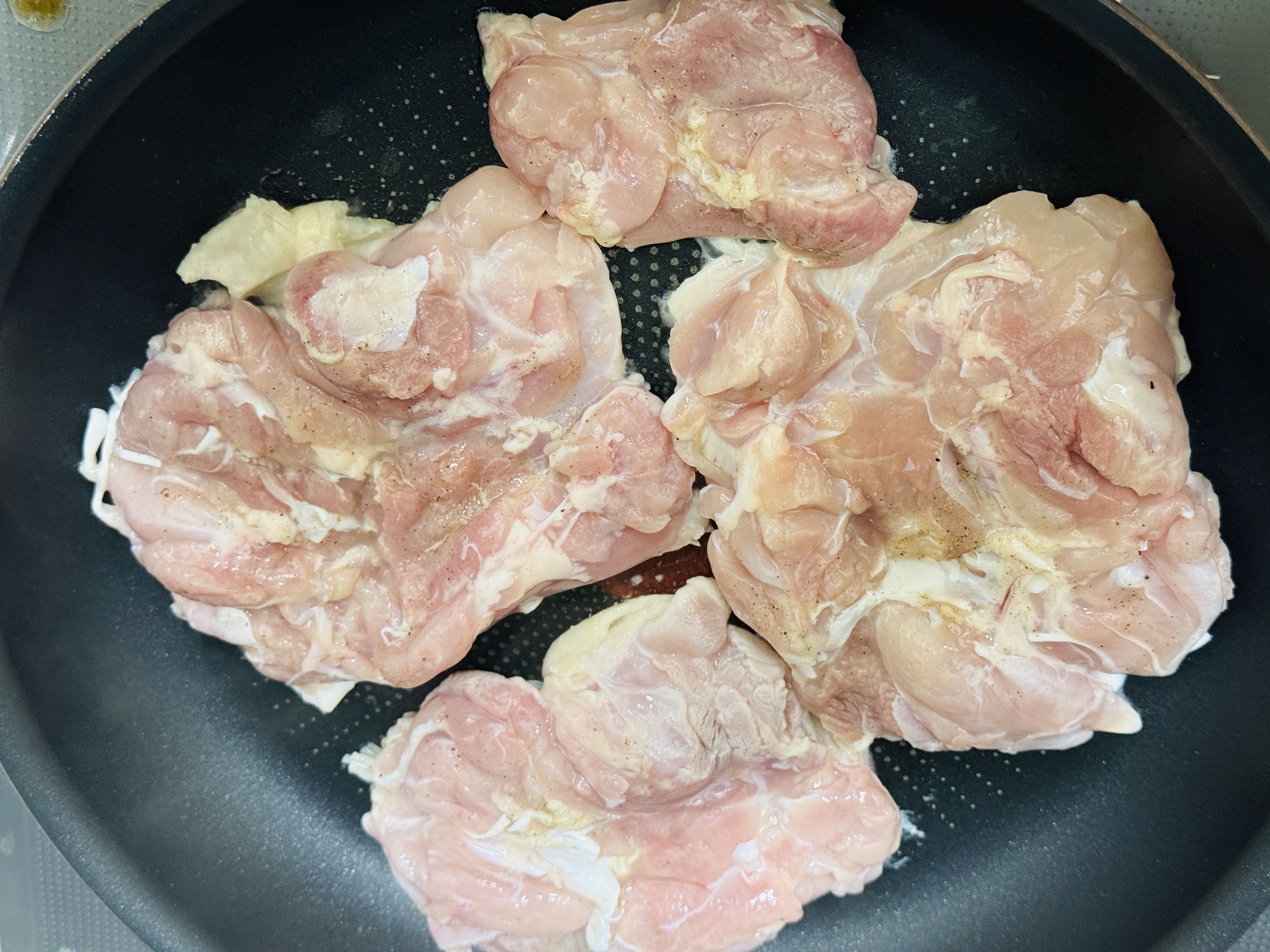 밑간해둔 닭다리살을 달군 펜에 올려 노릇하게 구워주세요. 닭 껍질 부분이 아래로 가도록 해서 구우면 고소한 기름이 나와 기름 없이 맛있게 구울 수 있어요.