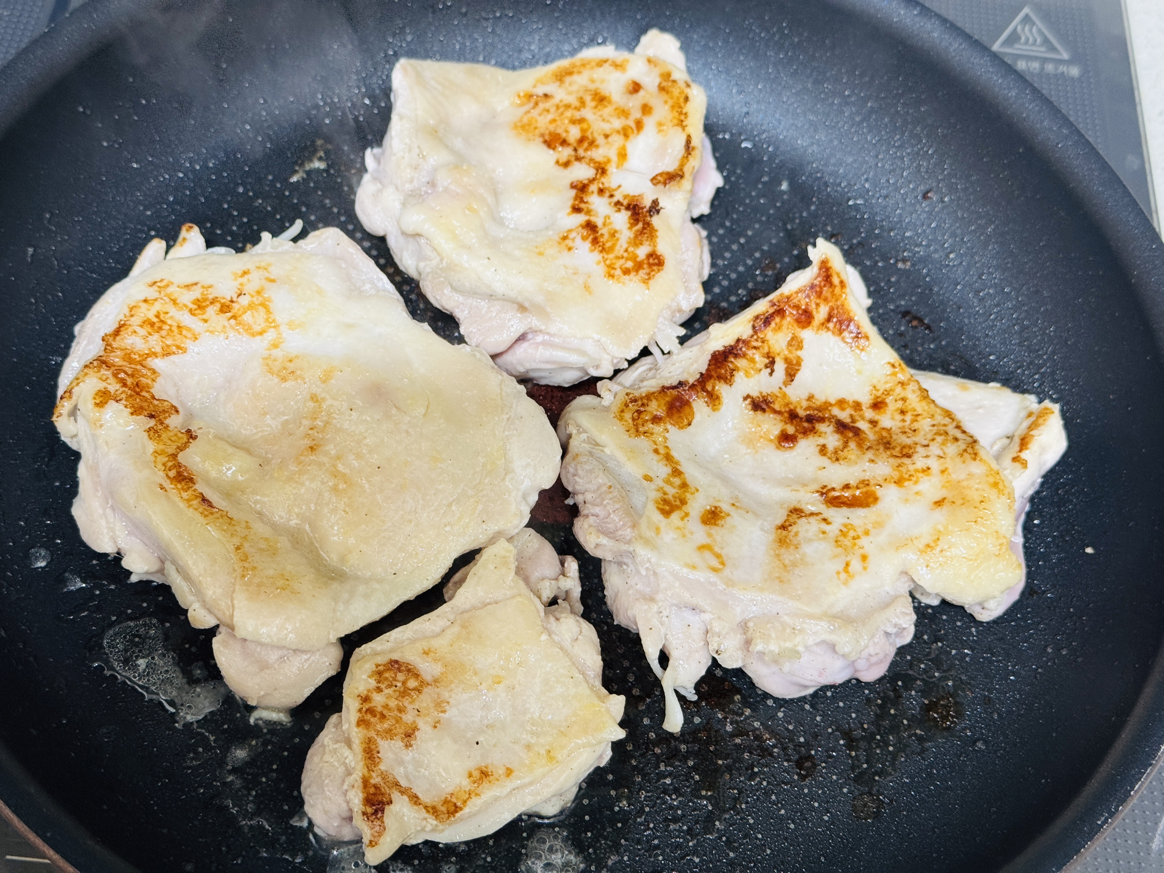 밑간해둔 닭다리살을 달군 펜에 올려 노릇하게 구워주세요. 닭 껍질 부분이 아래로 가도록 해서 구우면 고소한 기름이 나와 기름 없이 맛있게 구울 수 있어요.