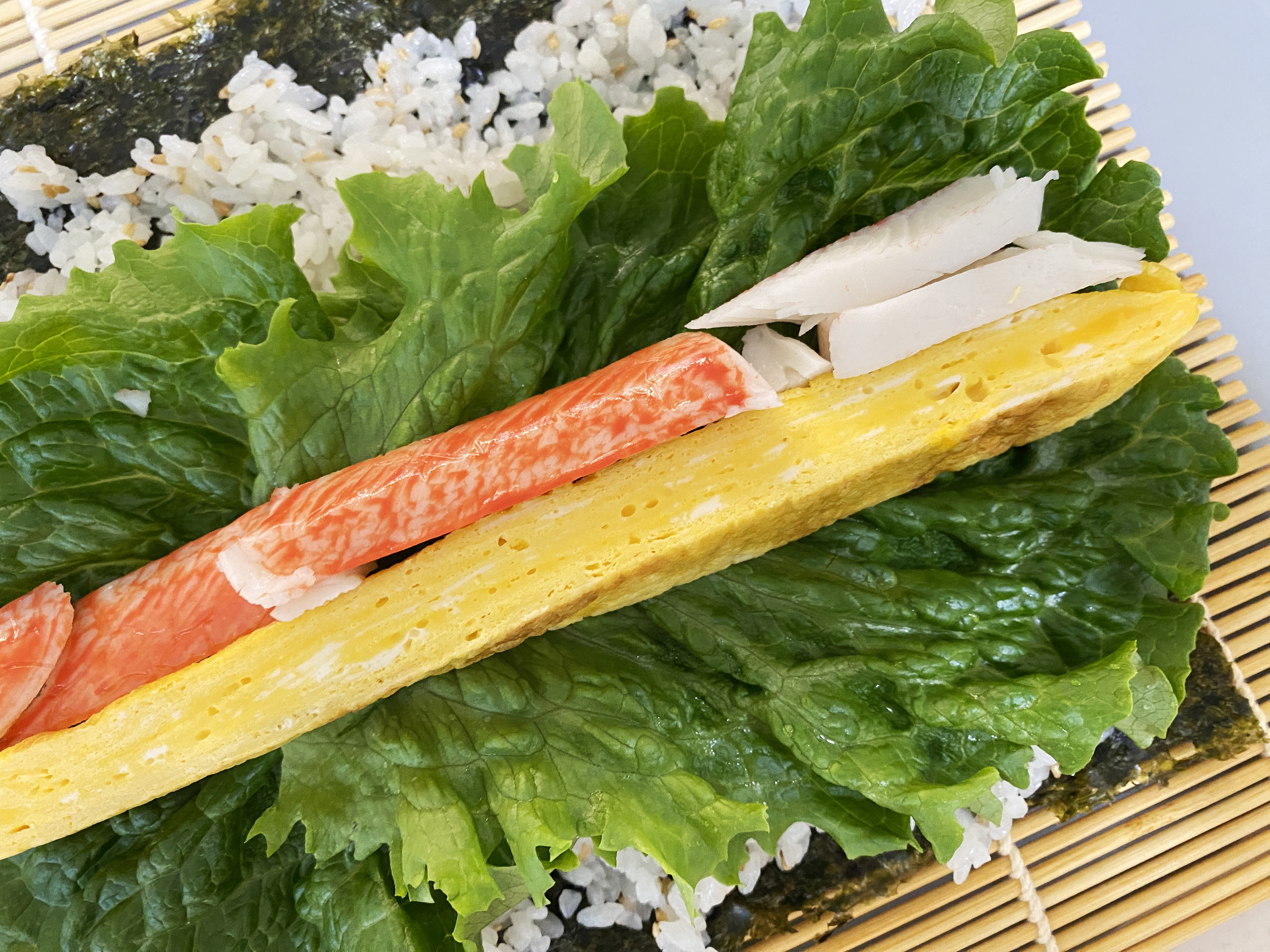 크래미도 미리 잘라 준비해 주었어요. 상추는 깨끗이 씻어 물기 털어 준비해 주세요.