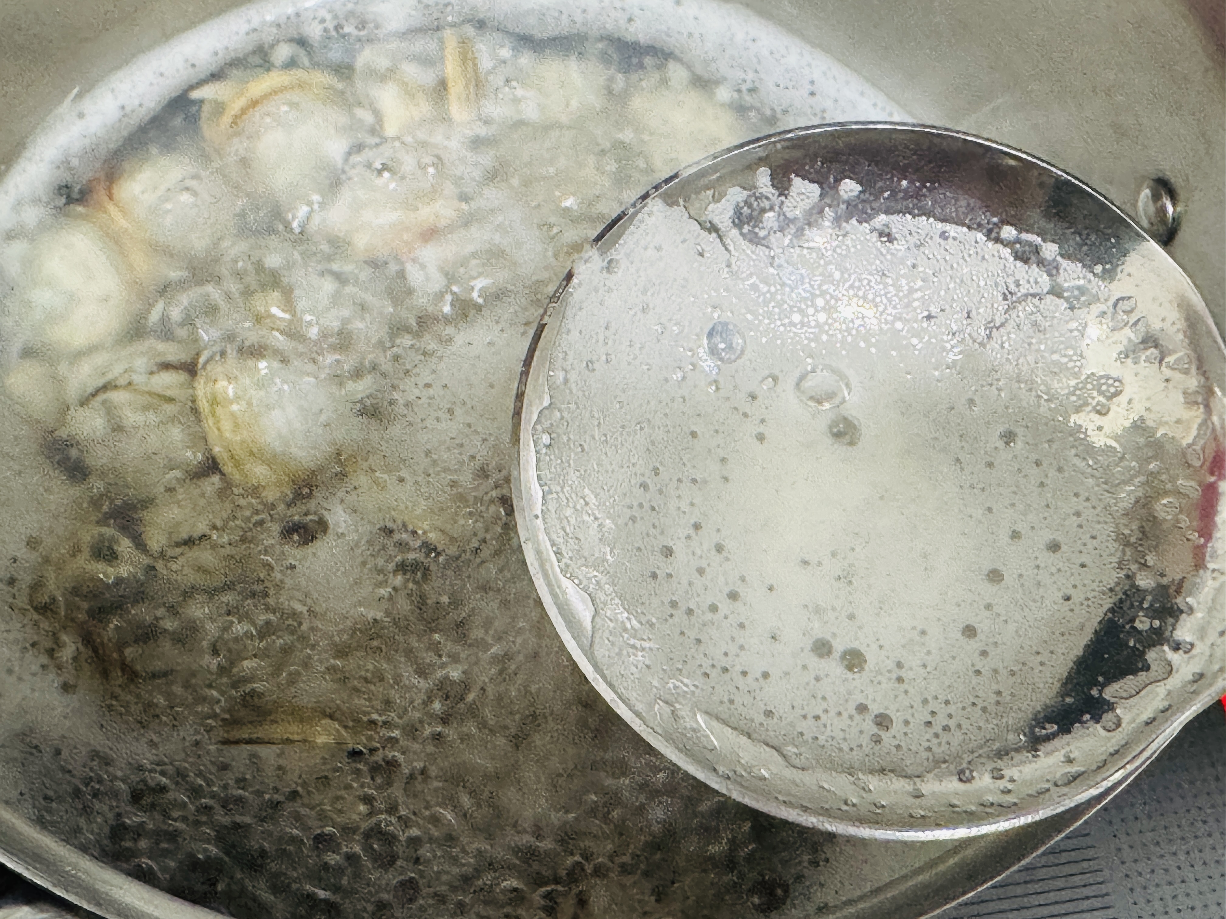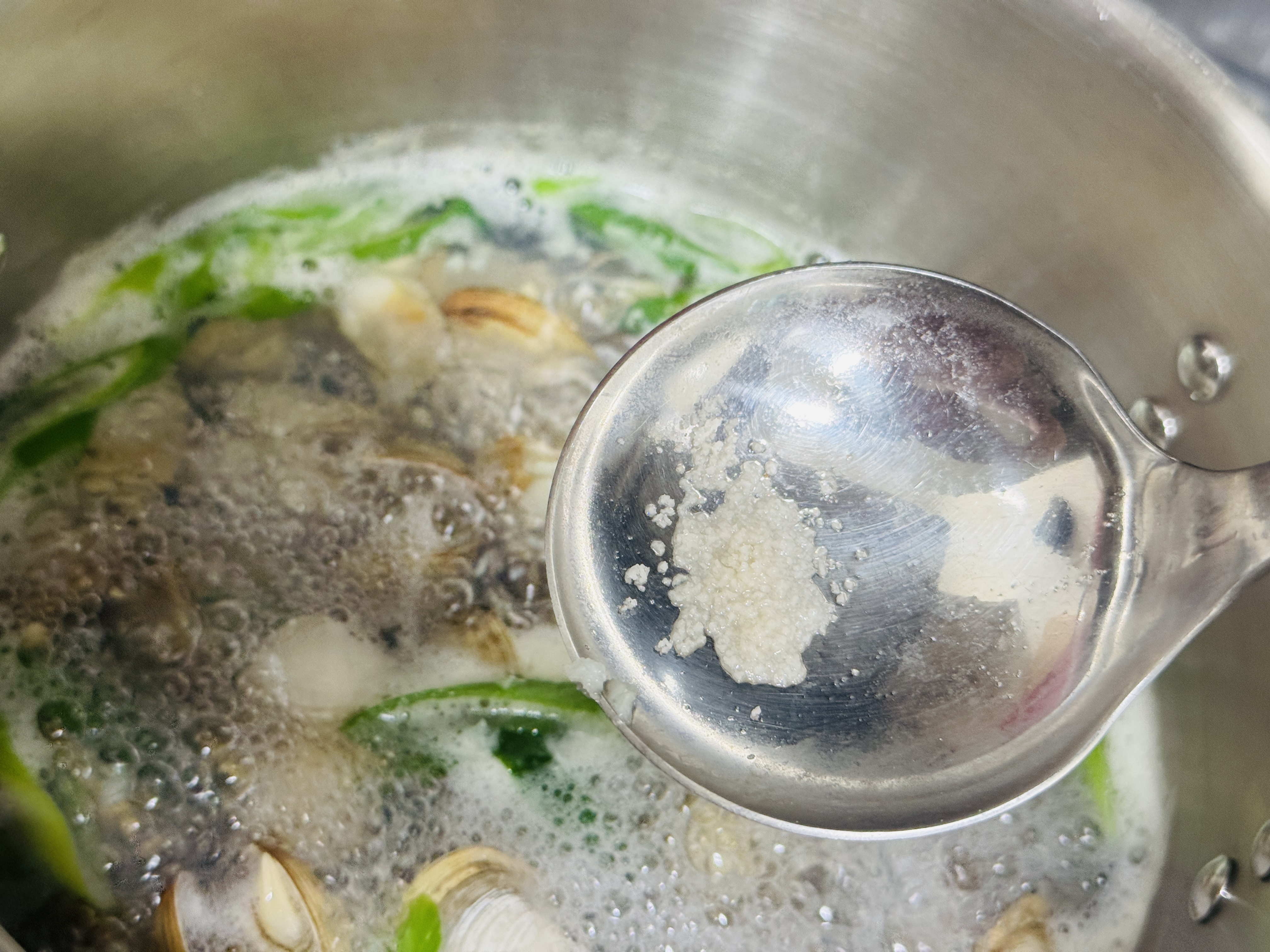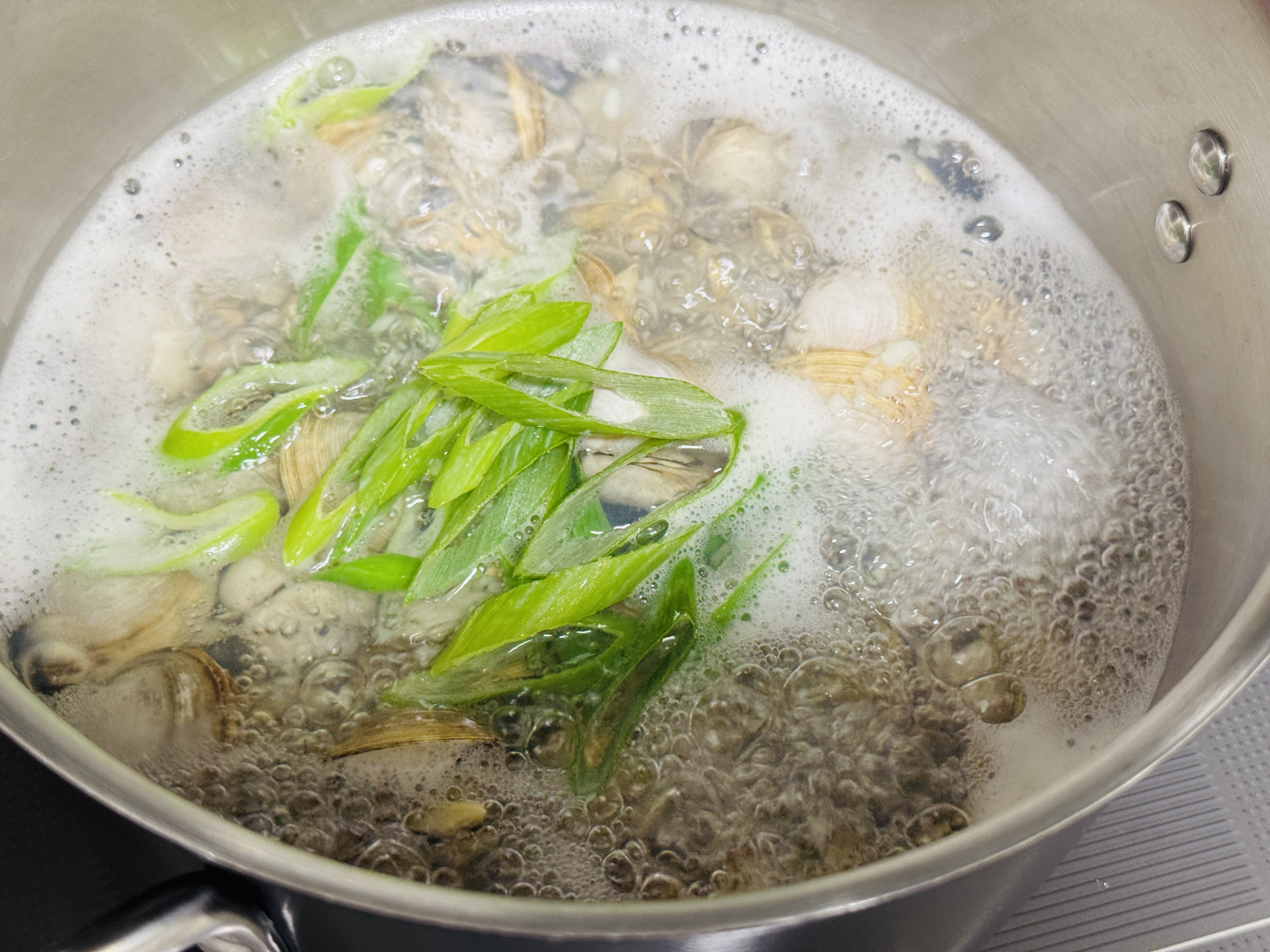 거품을 걷어내며 끓이다 조개가 입을 벌리면 파를 넣아 한소끔 더 끓여줍니다.