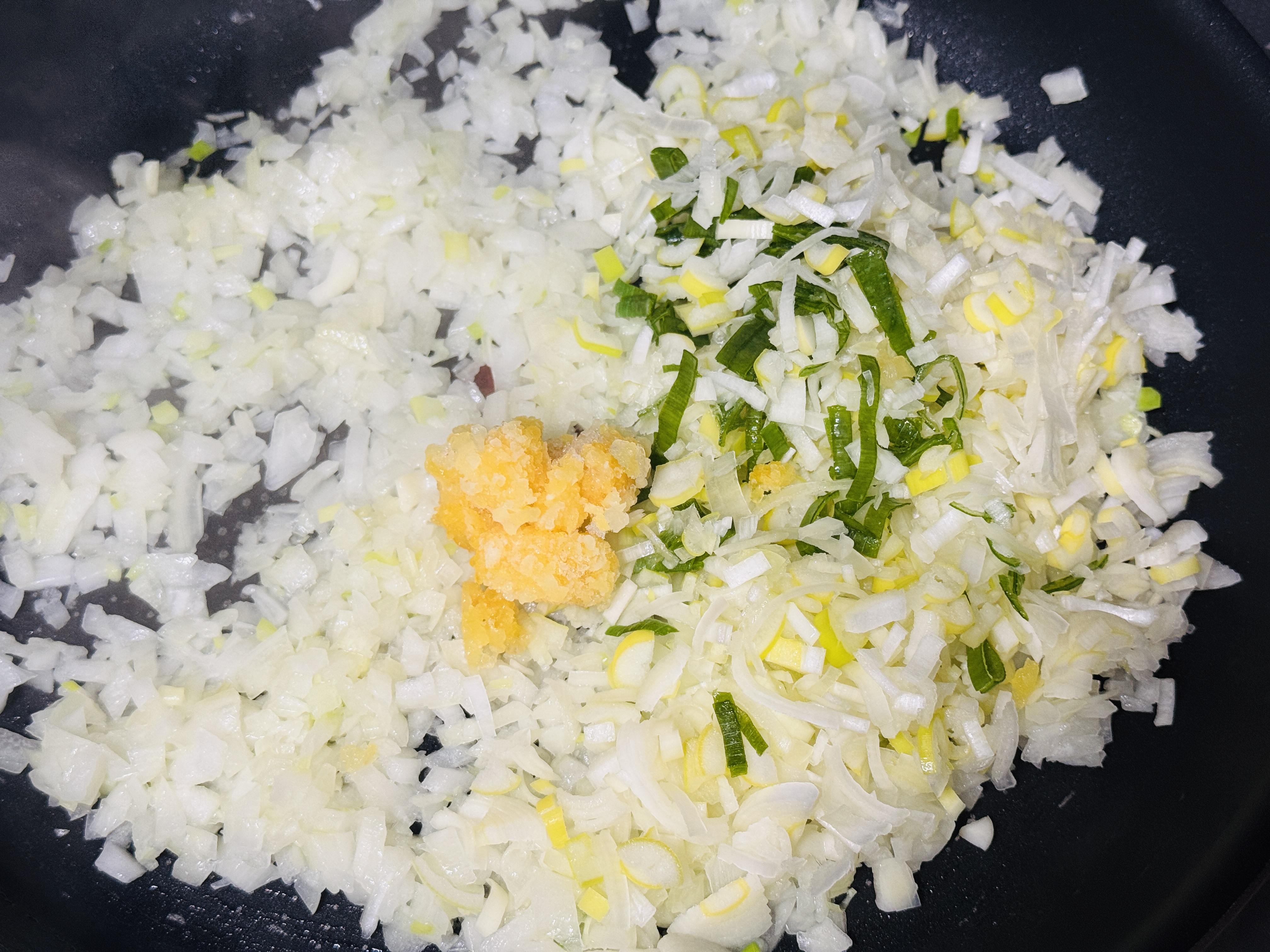 투명하게 볶아지면 대파와 마늘 함께 넣어주세요.