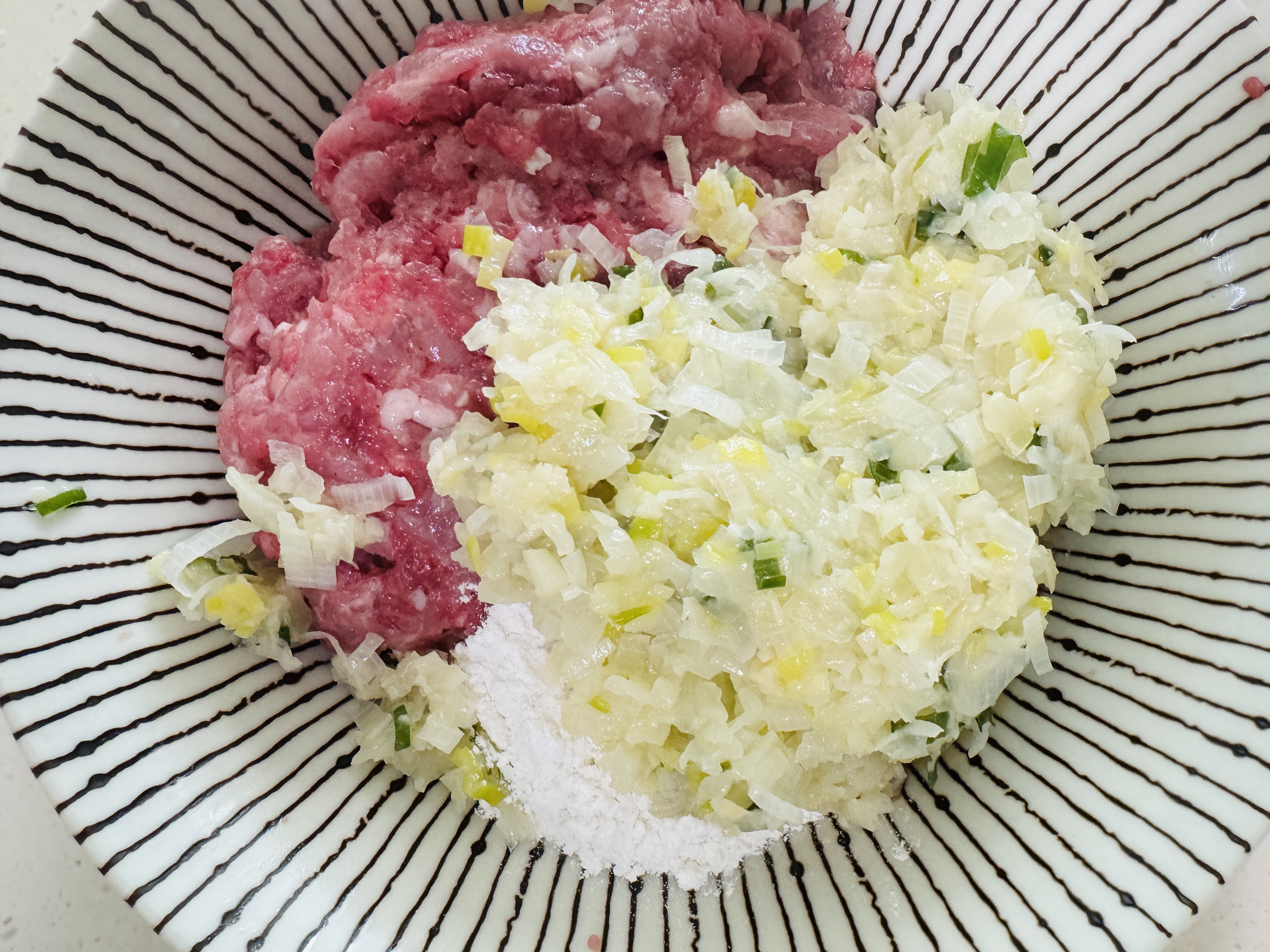 볶아서 식혀 놓았던 양파와 파를 함께 넣어 반죽해 주세요.