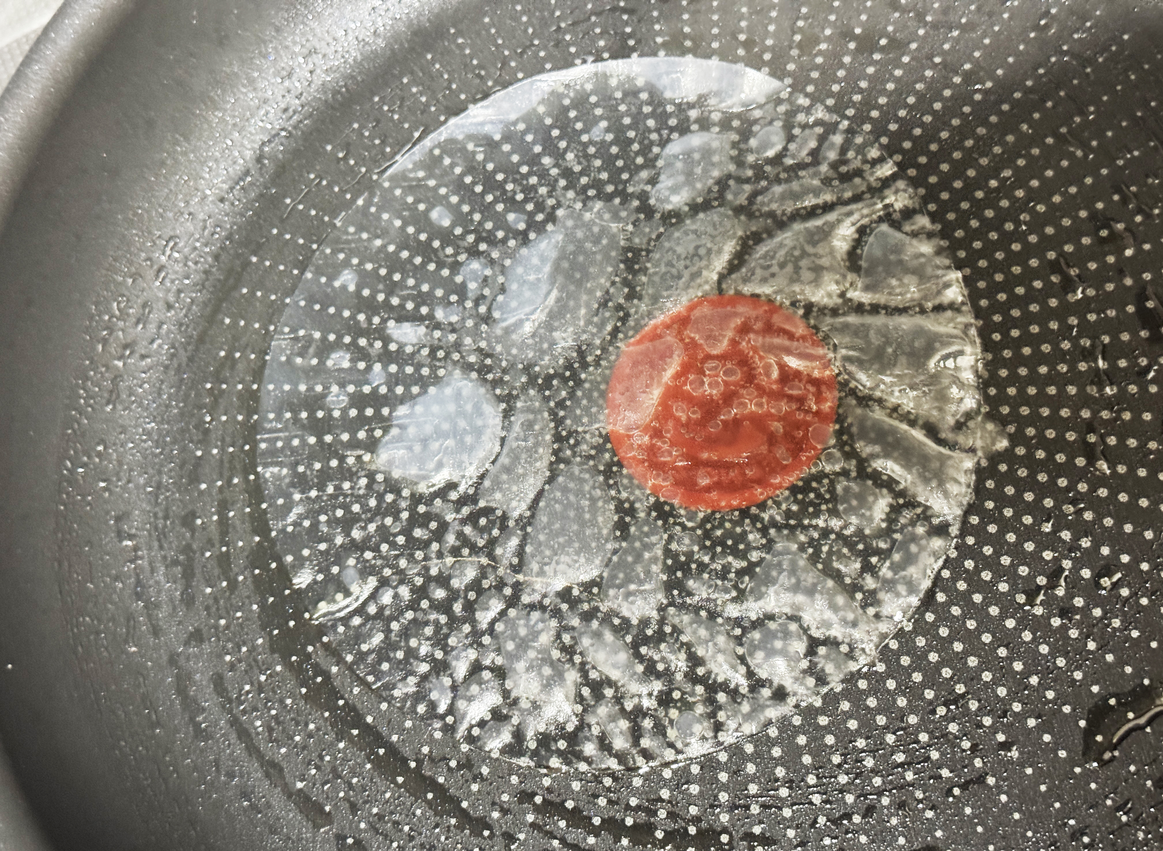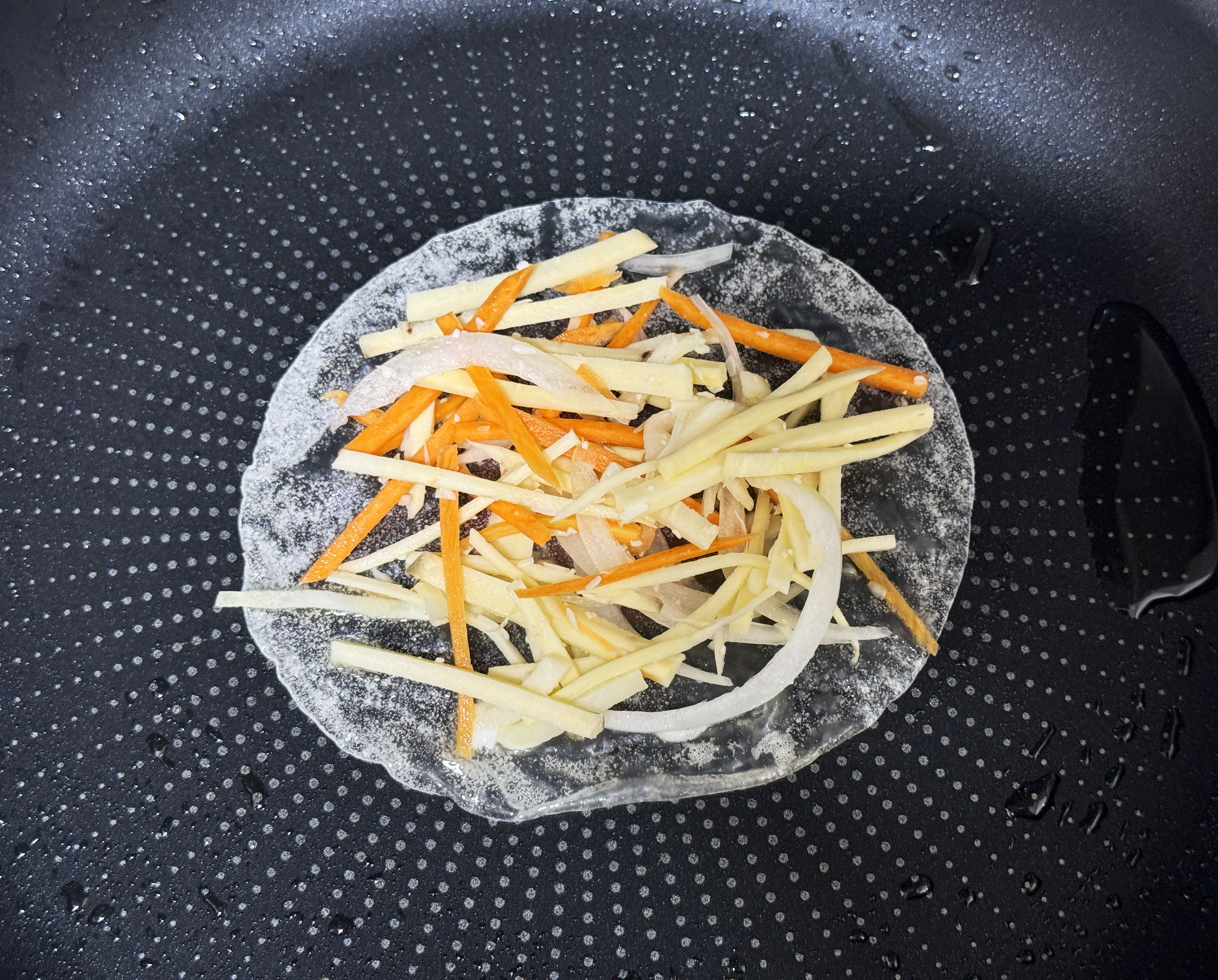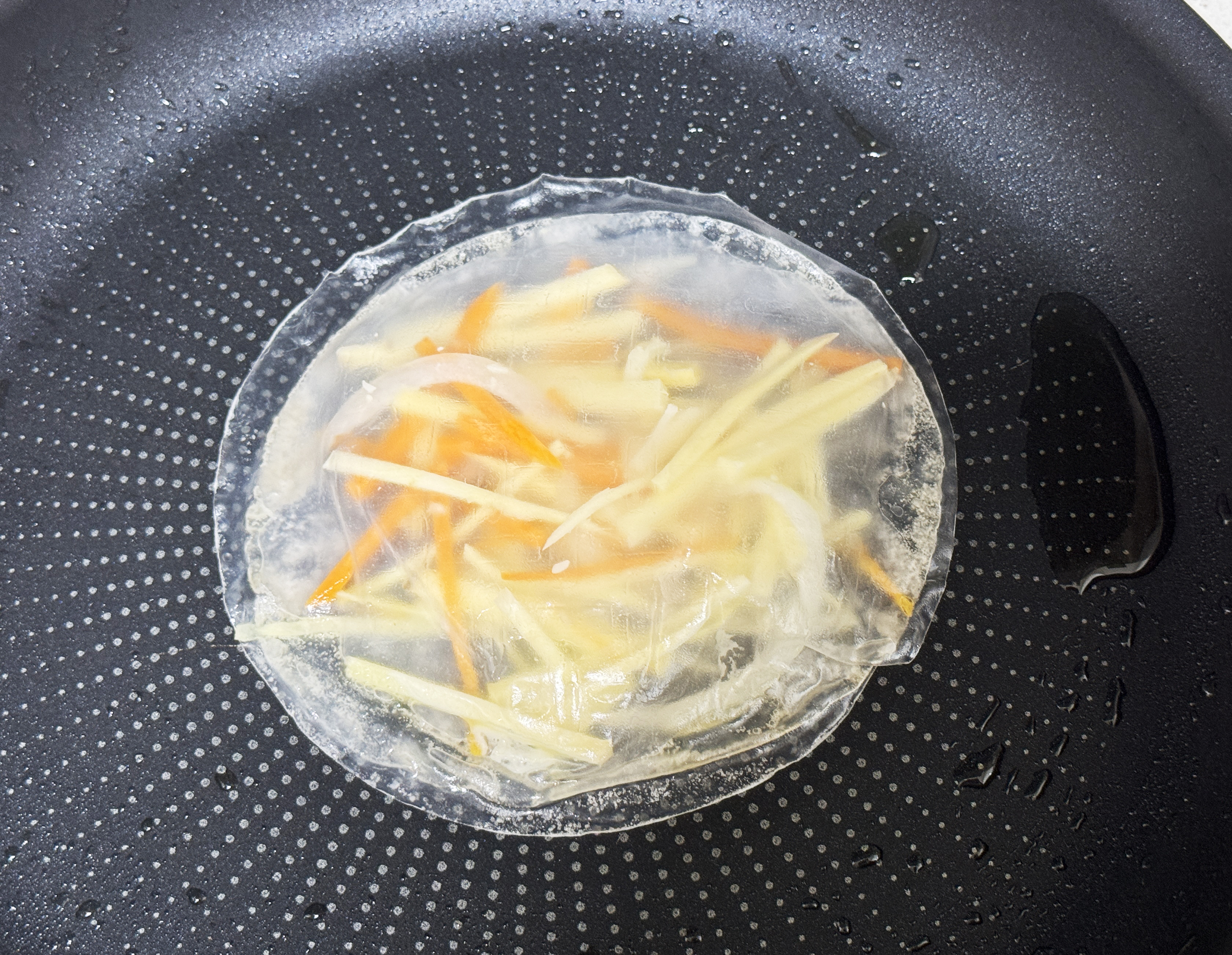 프라이펜에 기름을 두르고 달궈준 뒤 라이스 페이퍼에 물을 묻혀 올려 주세요.
