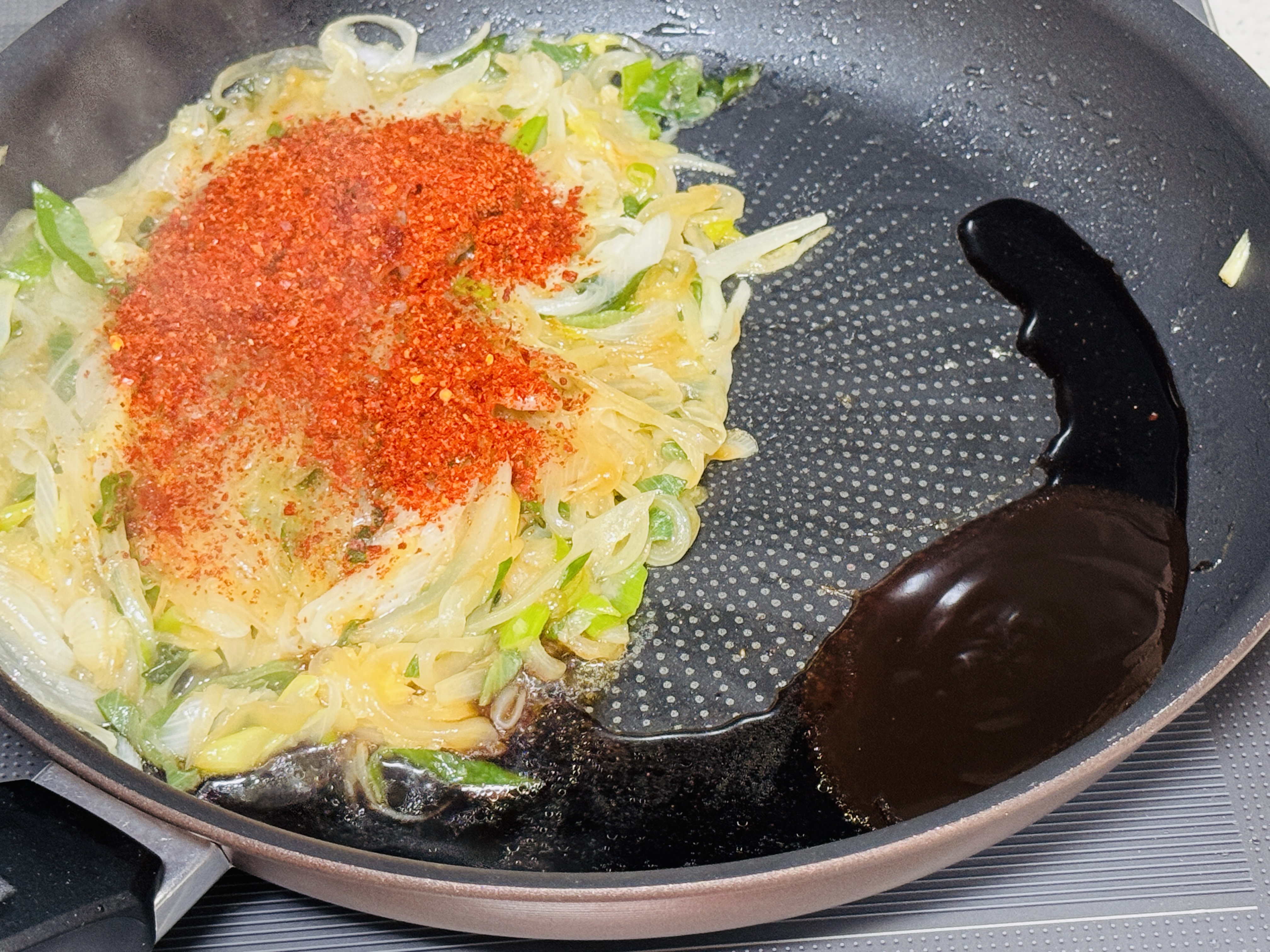 볶은 양파, 파를 옆으로 밀고 진간장2T 굴소스 2T 넣어 끓여주고 고춧가루 1T 야채위에 올려놓아 주세요.