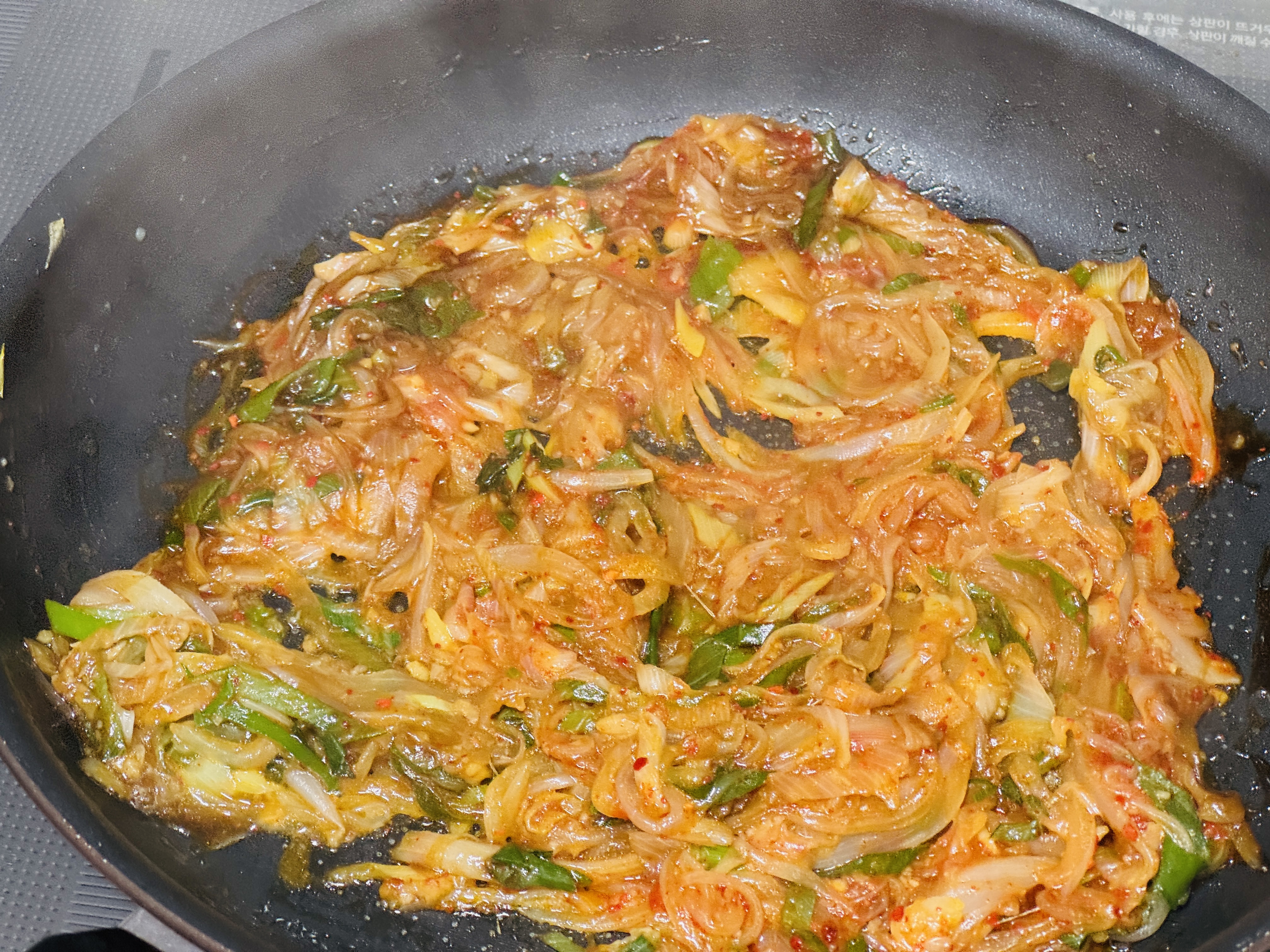 간장과 굴소스가 잘 끓으면 야채+고춧가루 함께 섞어주세요.