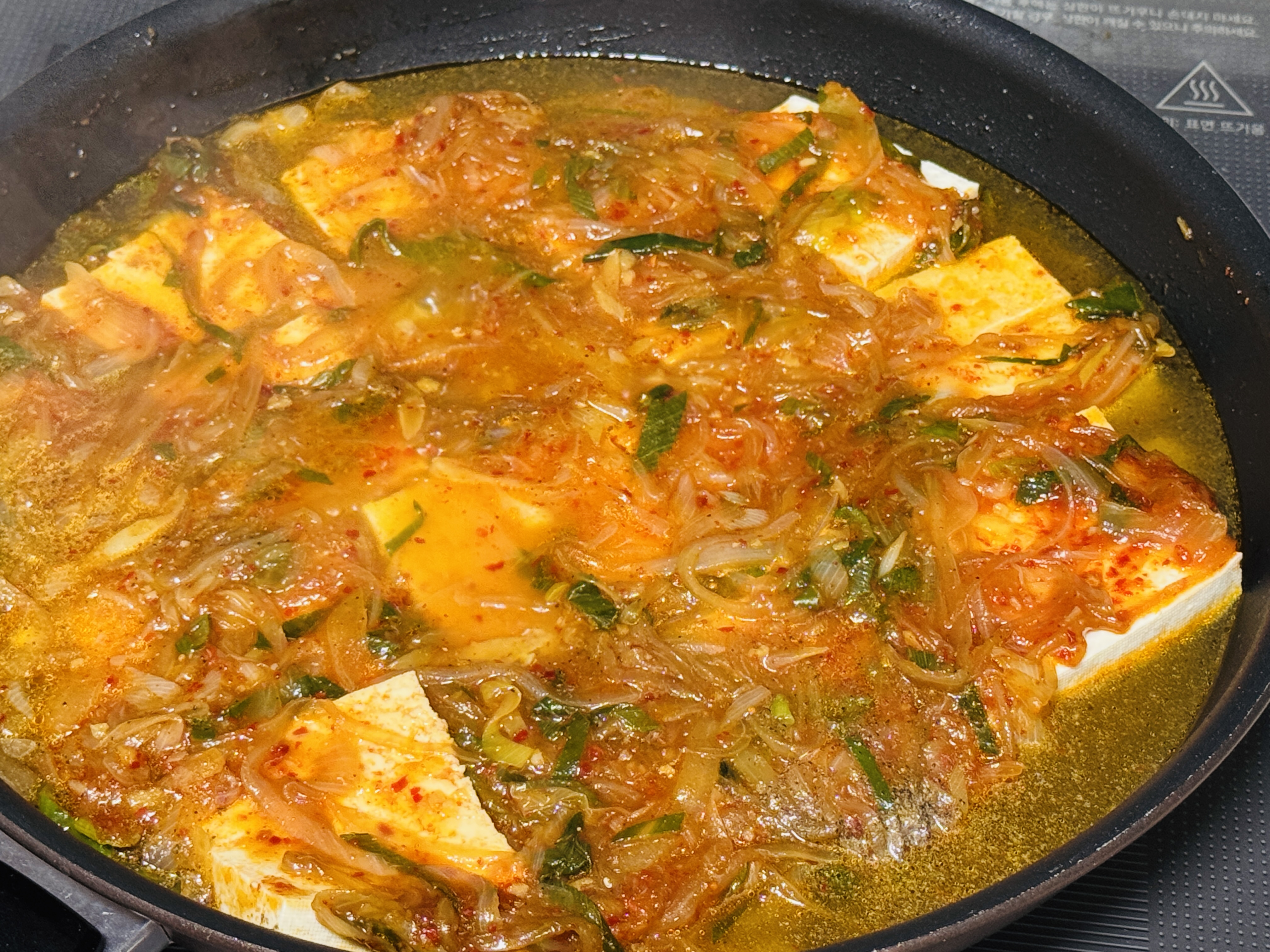 두부위에 야채를 모두 올린 후 물 200ml 넣어 중불로 끓여주세요. 중간 중간 두부를 살짝 들어 물이 바닥에 깔리도록 해주세요! 그냥 두면 두부 아래 물이 안들어라 조리는 과정에서 타기도 하더라고요..