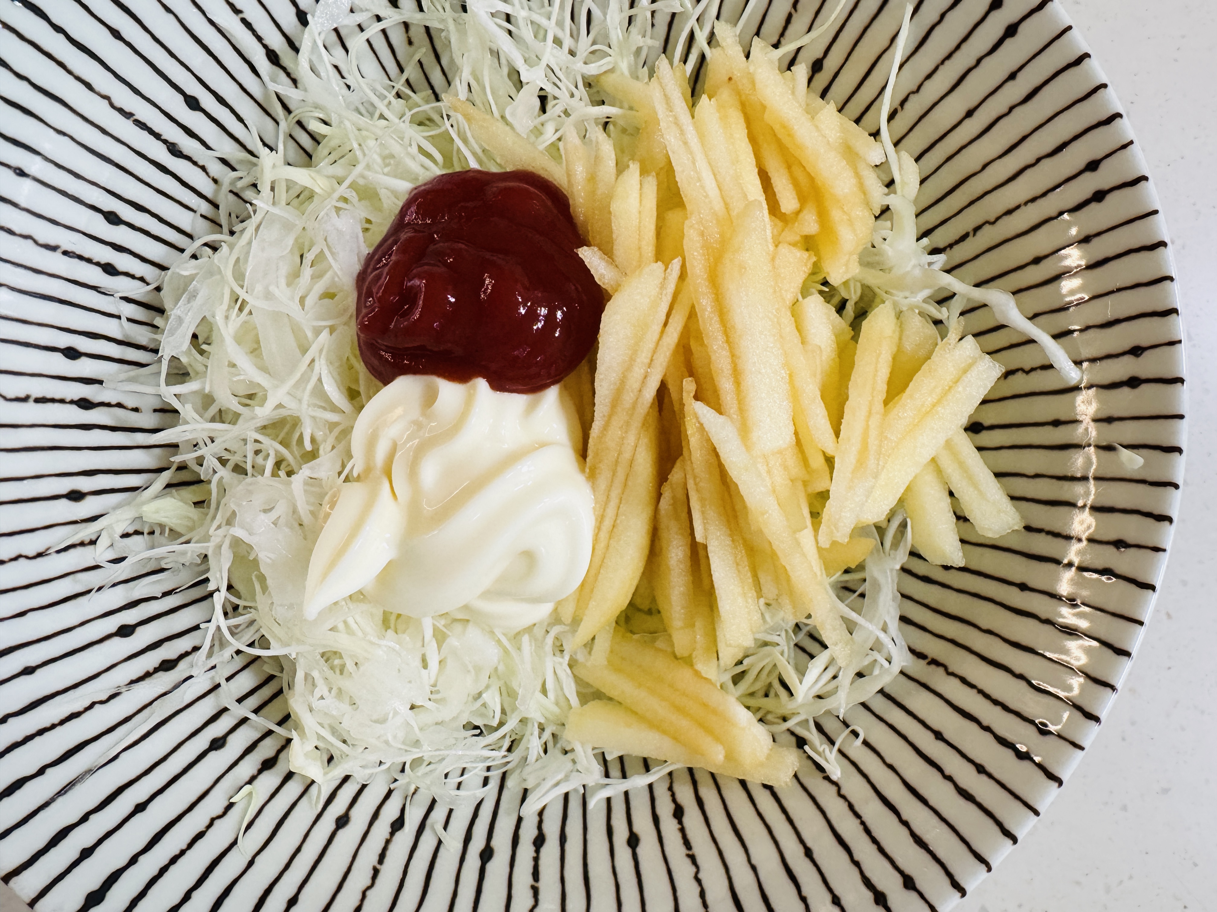 채썬 양배추에 사과, 마요네즈와 케첩 넣어 섞어주세요.