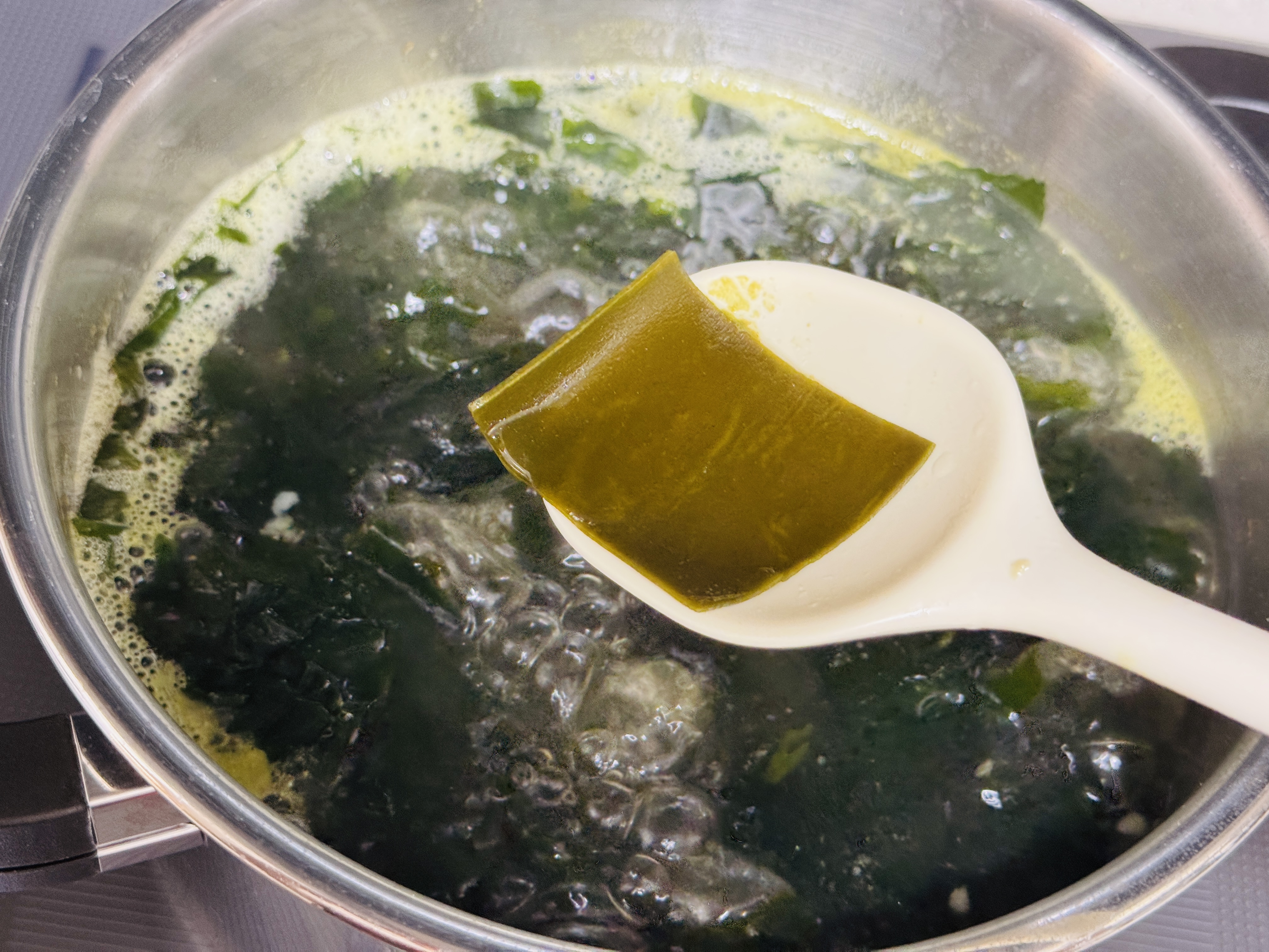 미역을 볶다가 물 1.5ml넣고 코인육수 3알과 조각 다시마 3장 넣어 강불에거 끓여주세요.