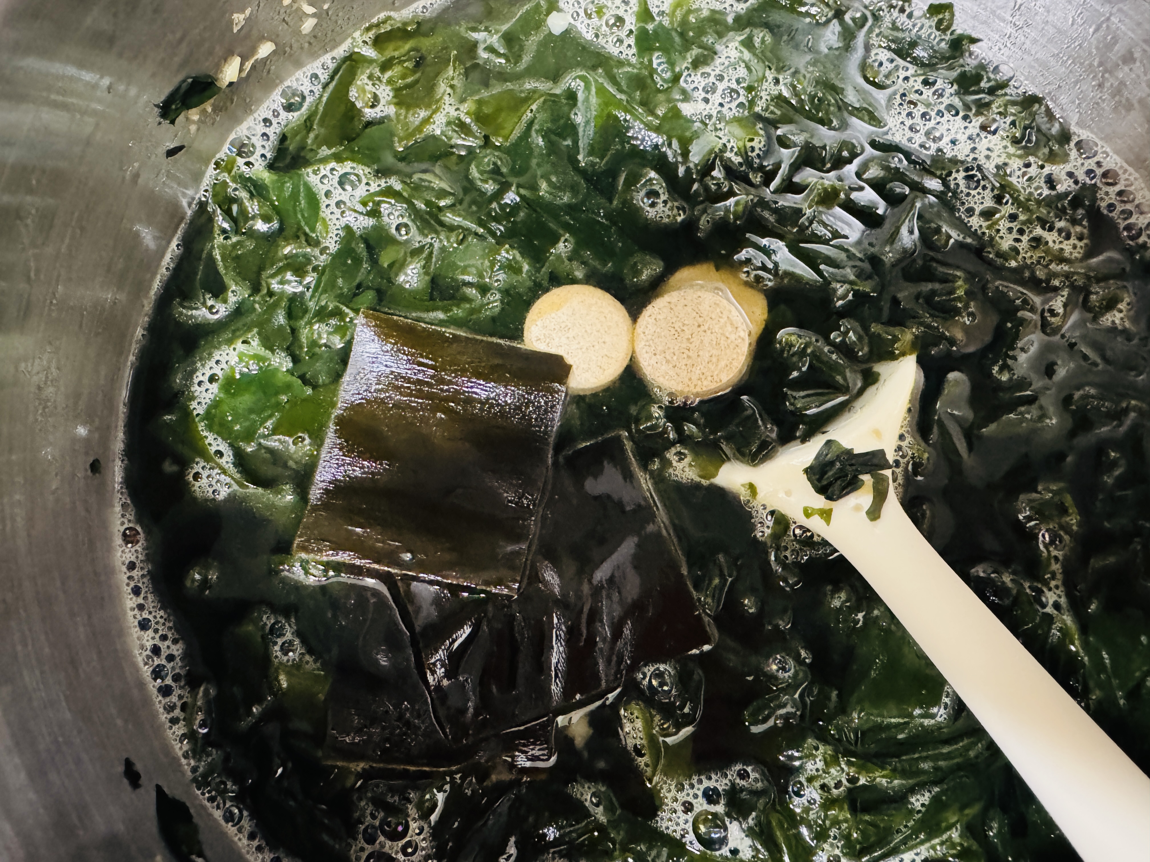 미역을 볶다가 물 1.5ml넣고 코인육수 3알과 조각 다시마 3장 넣어 강불에거 끓여주세요.