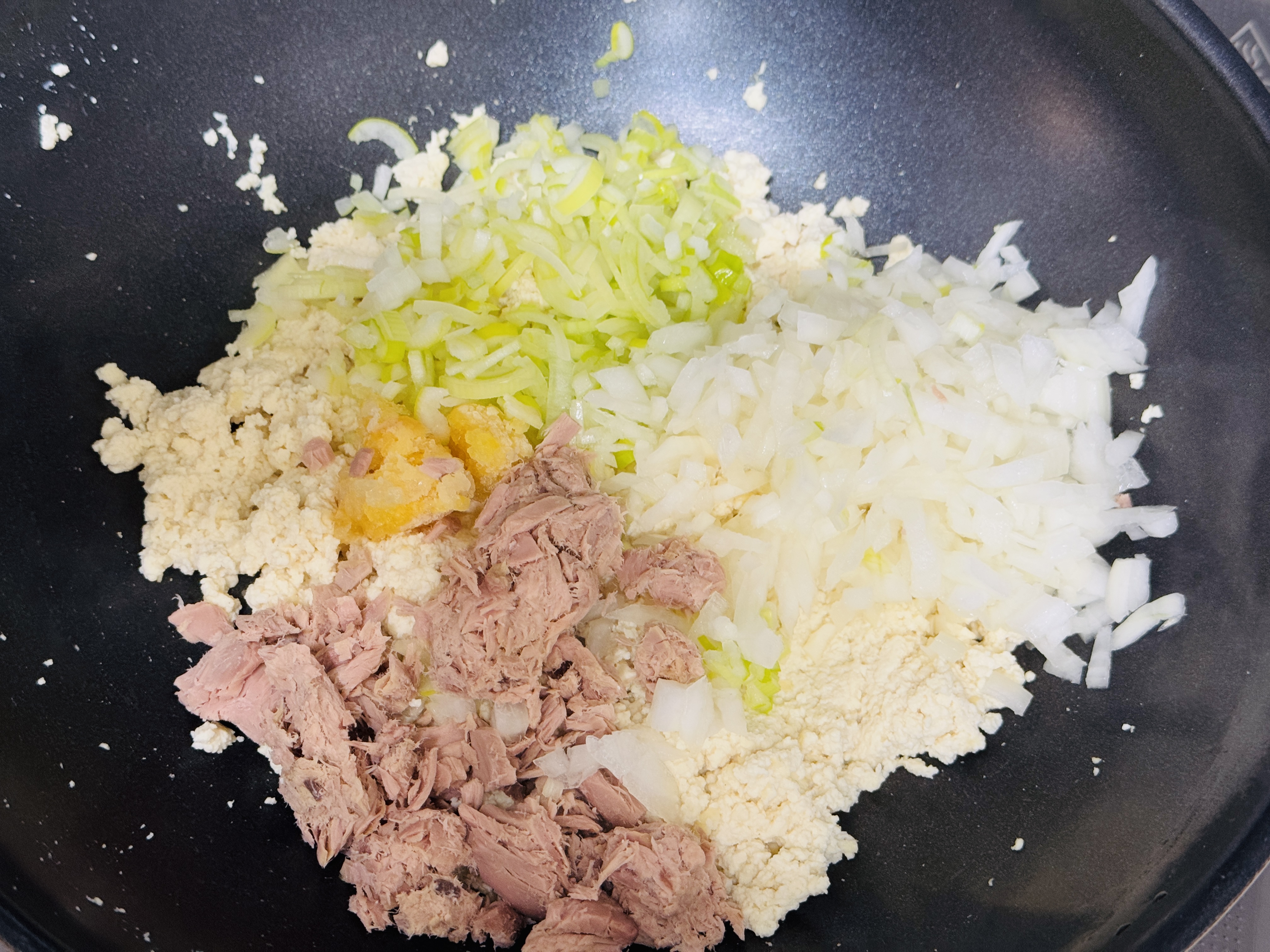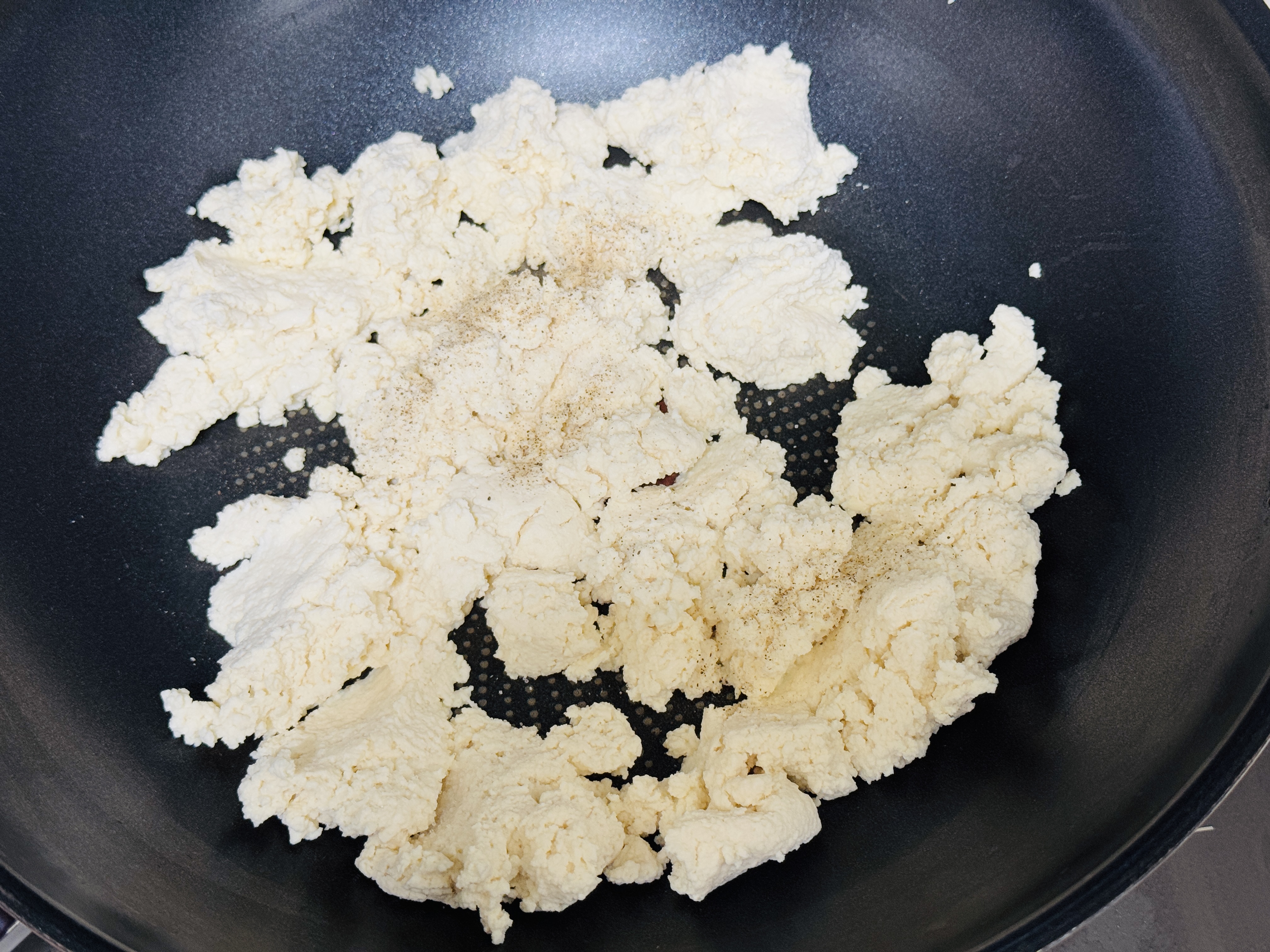마른펜에 두부를 볶아 수분을 완전히 날린다는 느낌으로 볶아주세요. 중불로 볶아주고 소금 약간 후추 약간 넣어 볶아주세요.