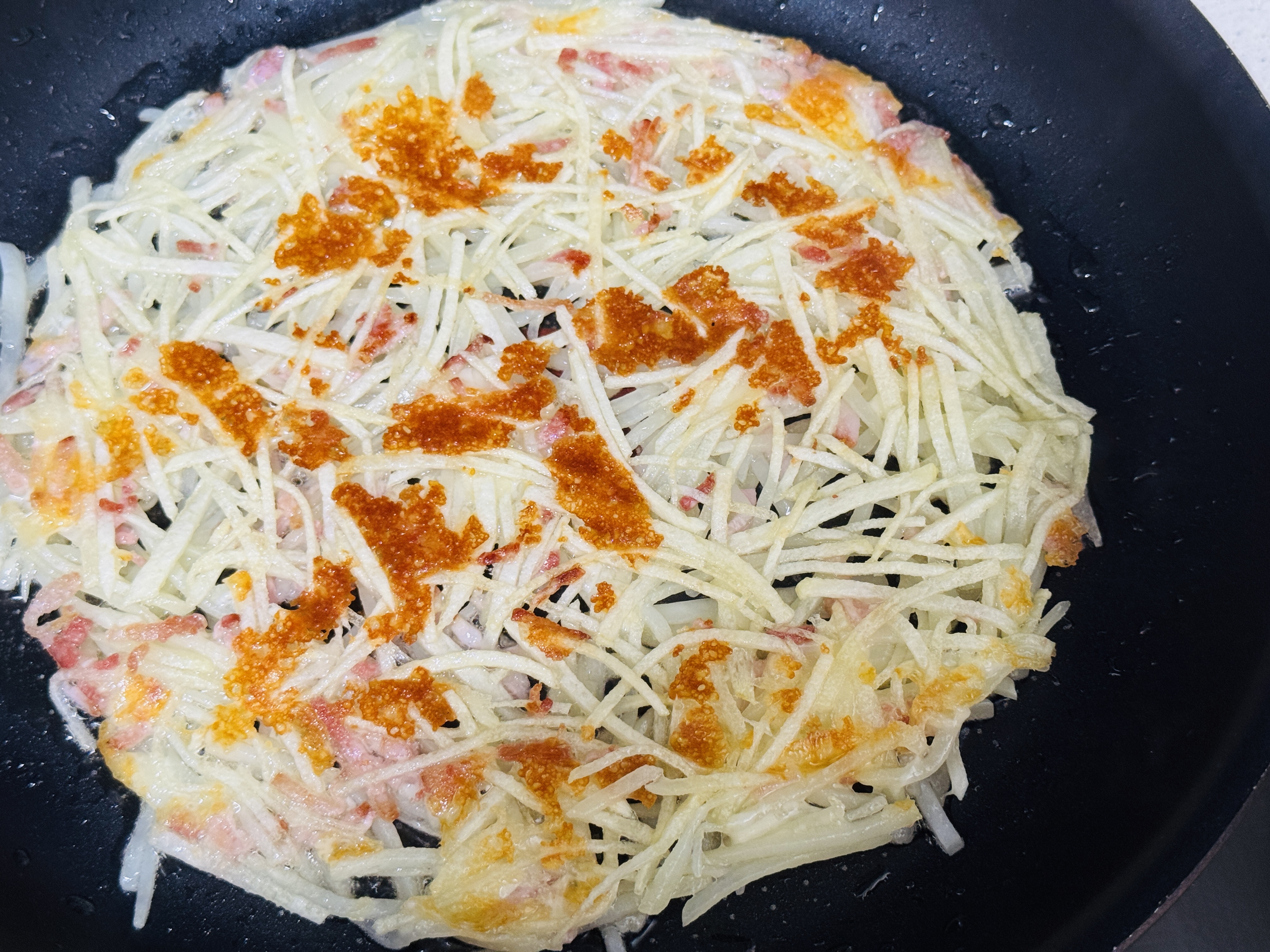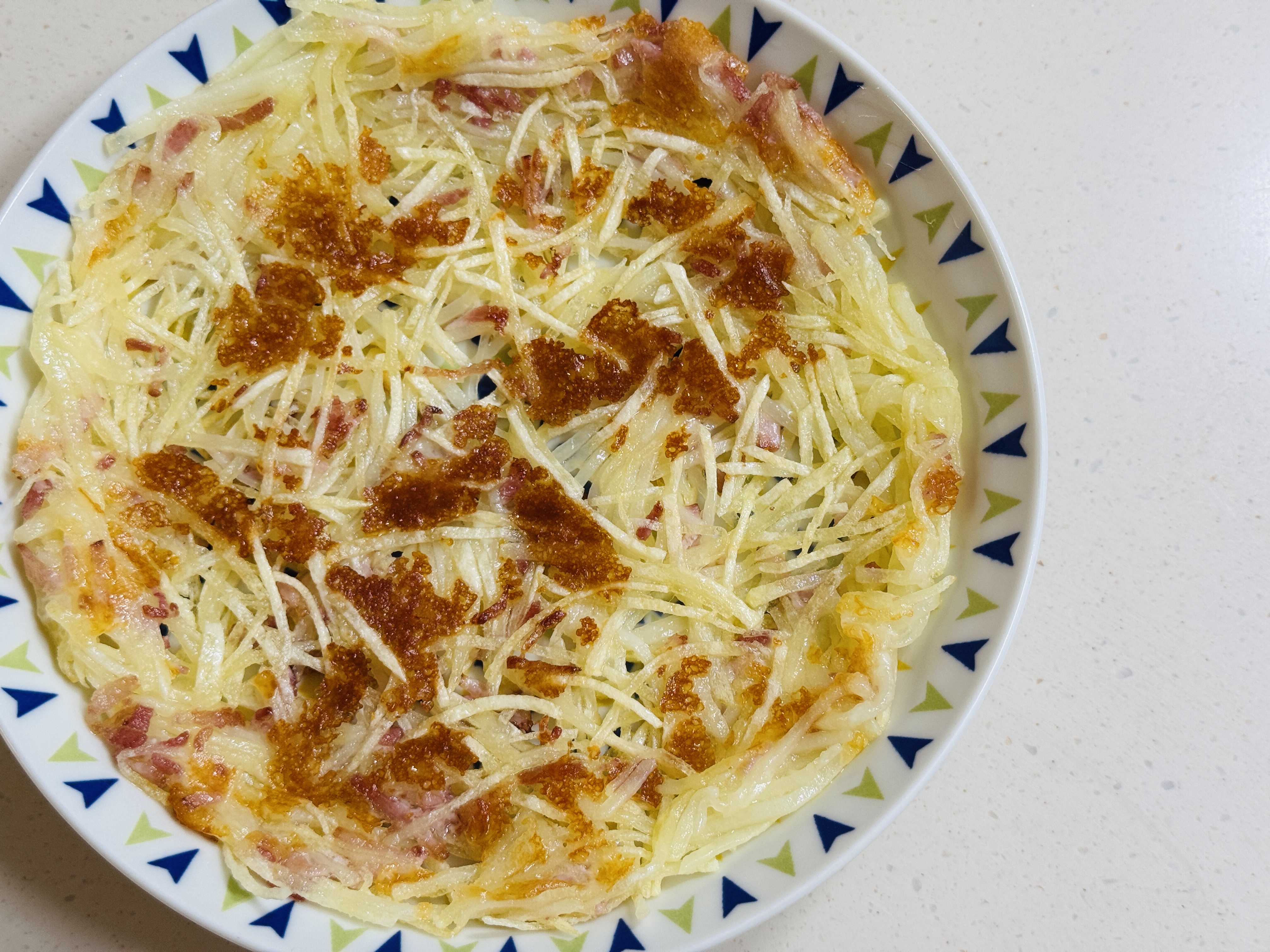 바삭한 감자전에 베이컨과 치즈가 짭짤한 맛을 더해주어 소스 없이도 맛있게 먹을수 있어요☺️