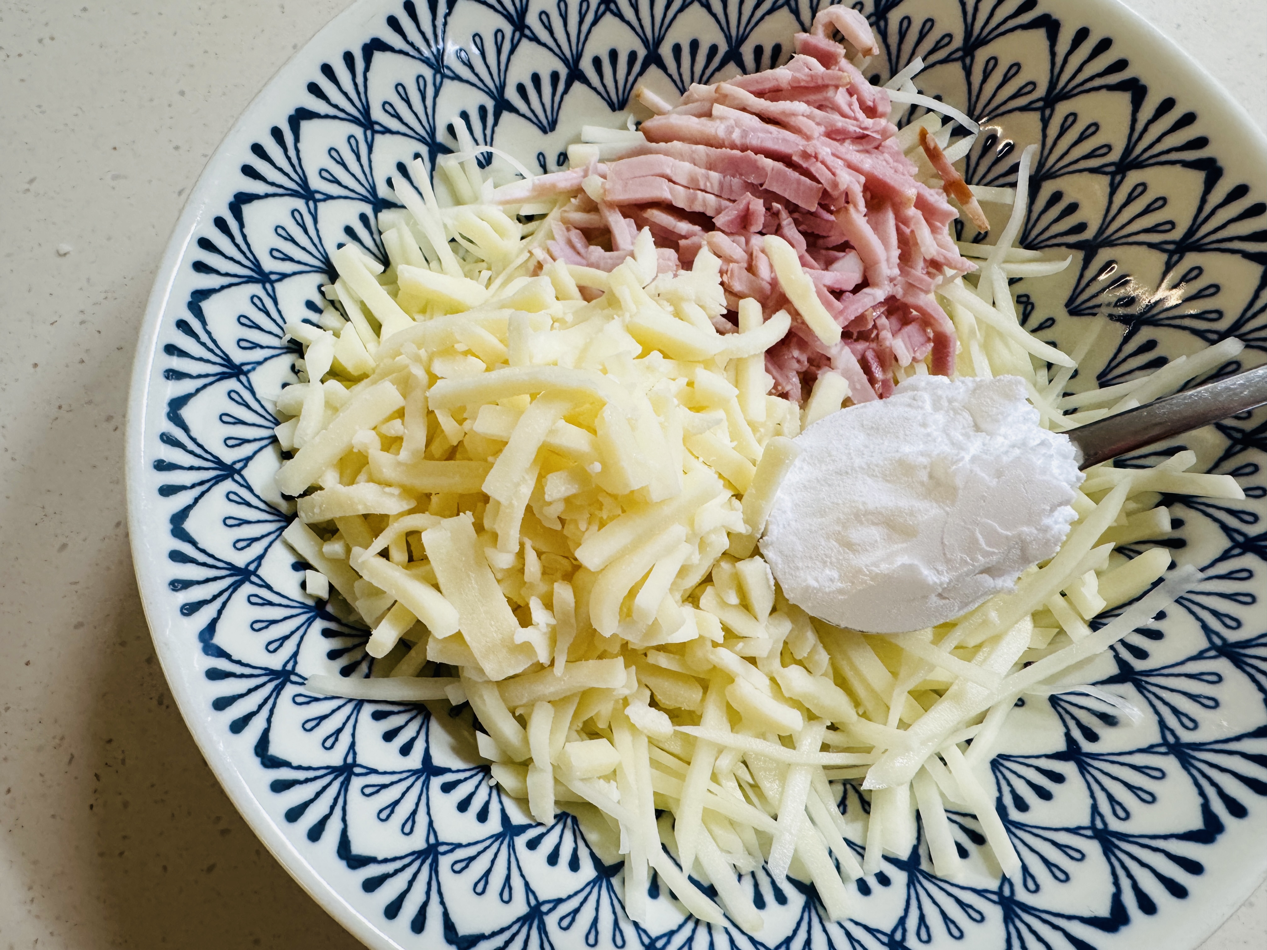 볼에 감자, 베이컨, 치즈, 감자 전분 넣어 잘 섞어주세요.