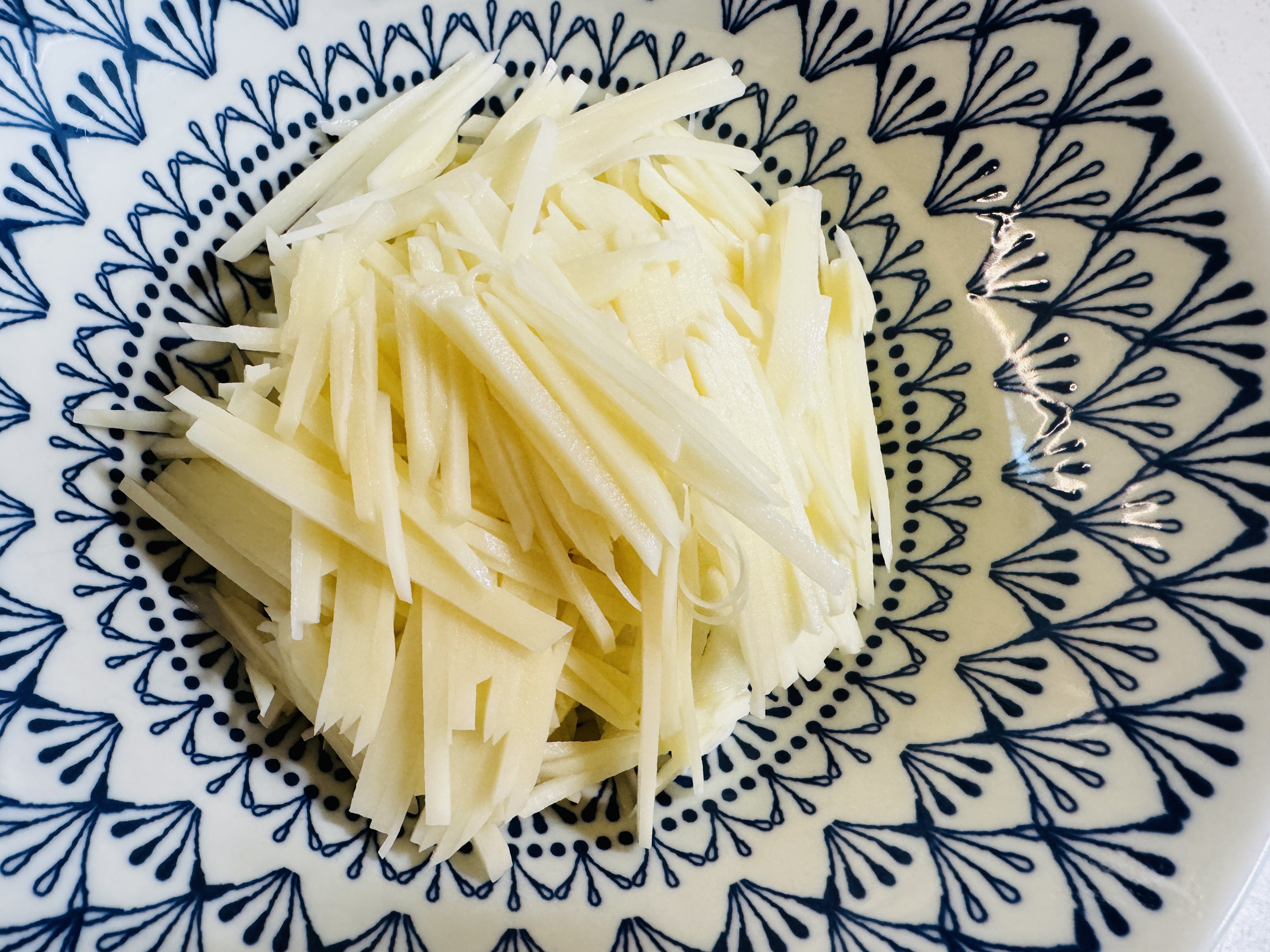 감자는 얇게 채썰어 물에 담궈 전부기를 제거해 주세요. 채에 받쳐 물기를 빼주고 중간 중간 뒤척여 물기 잘 날아가도록 해주세요. 키친타올로 꾹꾹 눌러 닦아주어도 좋아요:)