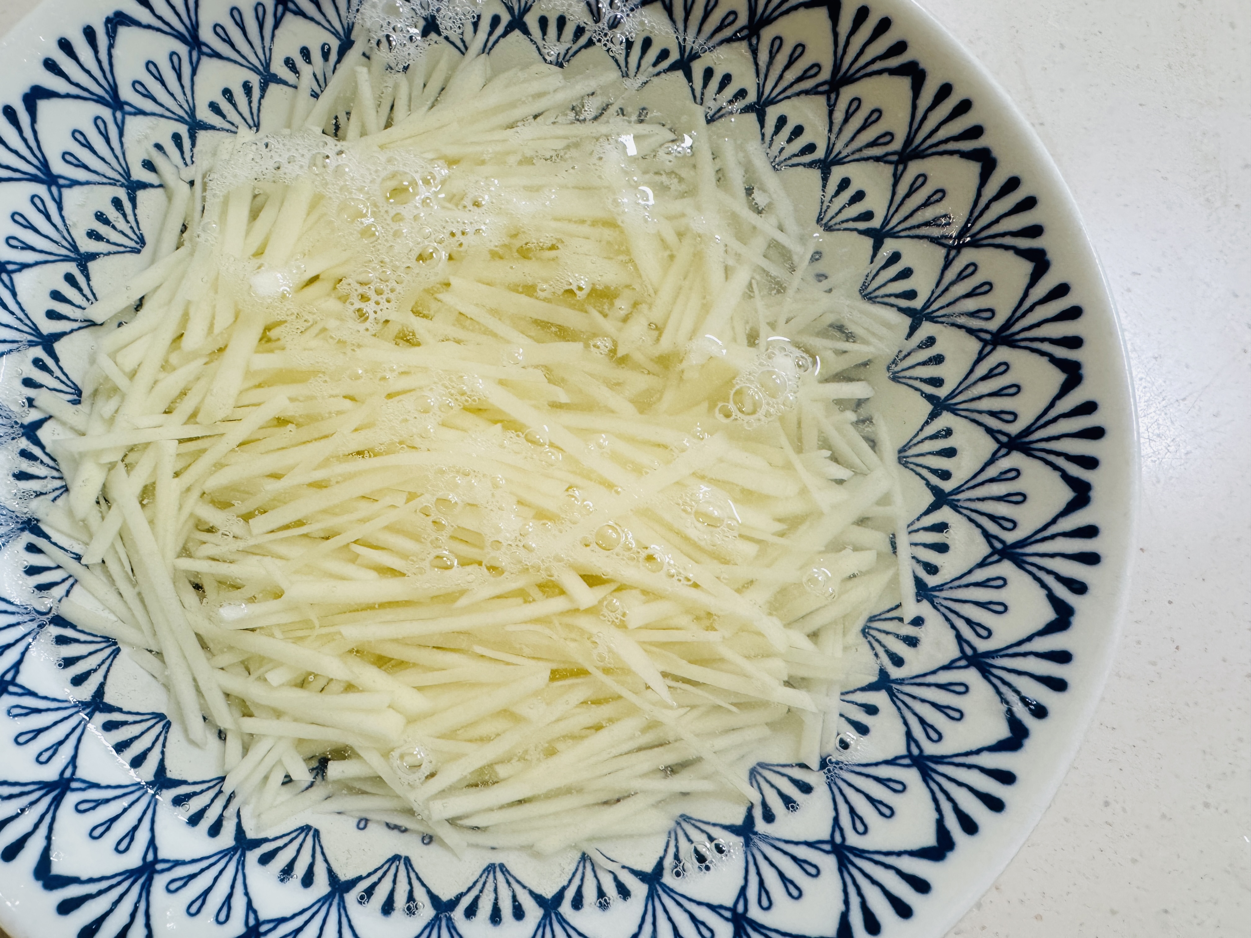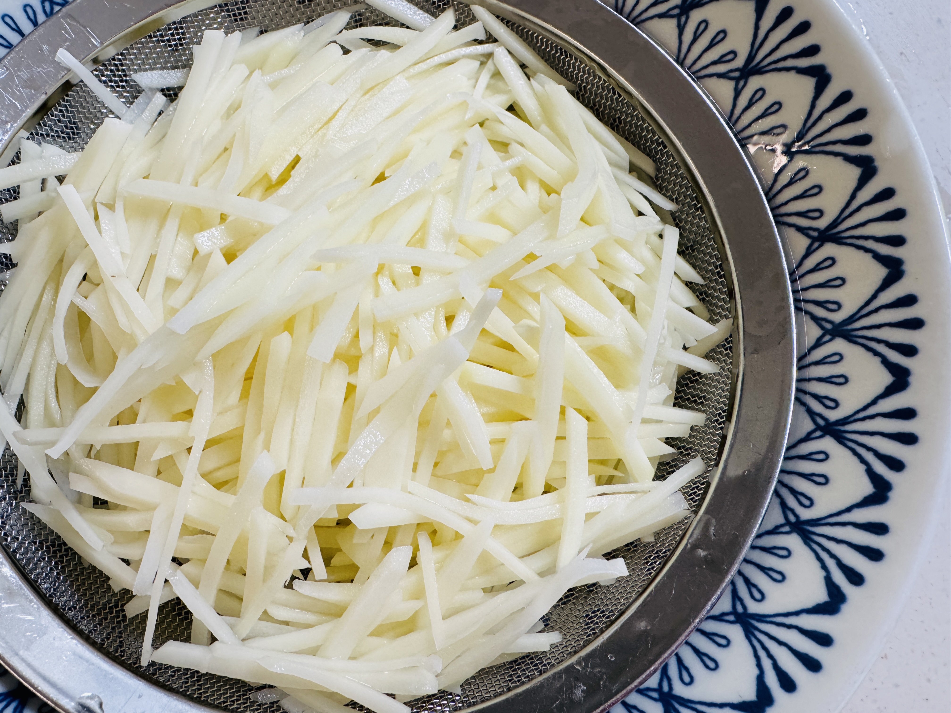 감자는 얇게 채썰어 물에 담궈 전부기를 제거해 주세요. 채에 받쳐 물기를 빼주고 중간 중간 뒤척여 물기 잘 날아가도록 해주세요. 키친타올로 꾹꾹 눌러 닦아주어도 좋아요:)