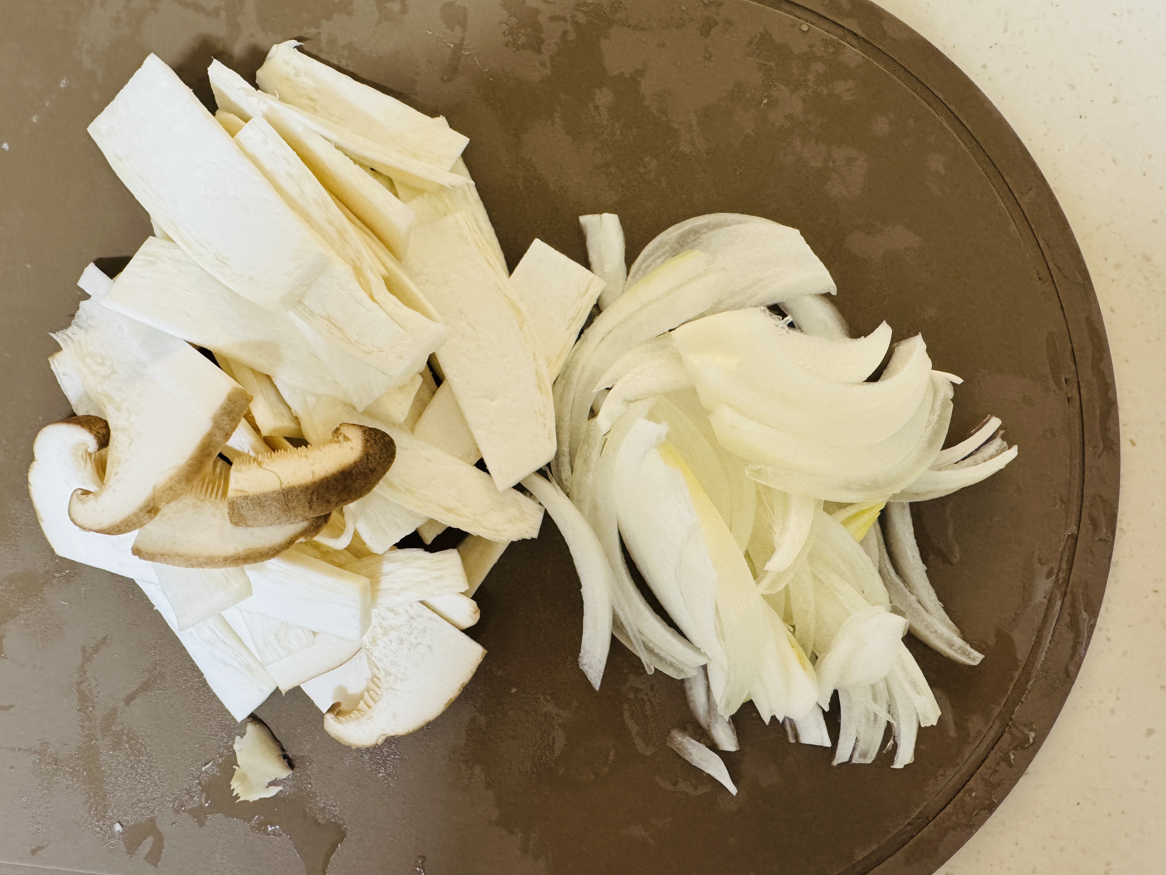 양파는 채썰고 버섯은 납작하게 잘라주세요.