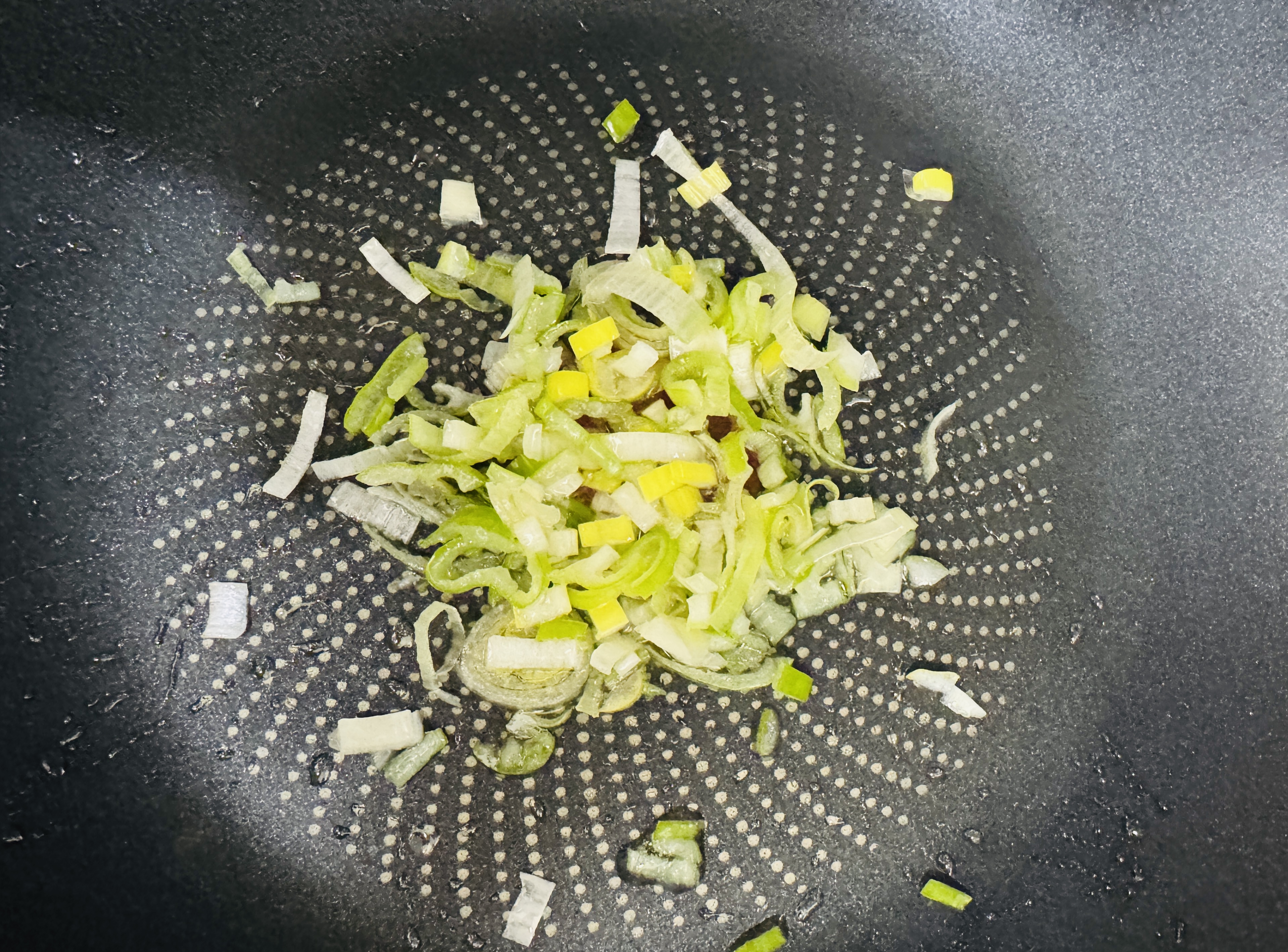 펜에 기름을 두르고 파를 넣어 약불로 파기름 내주세요.