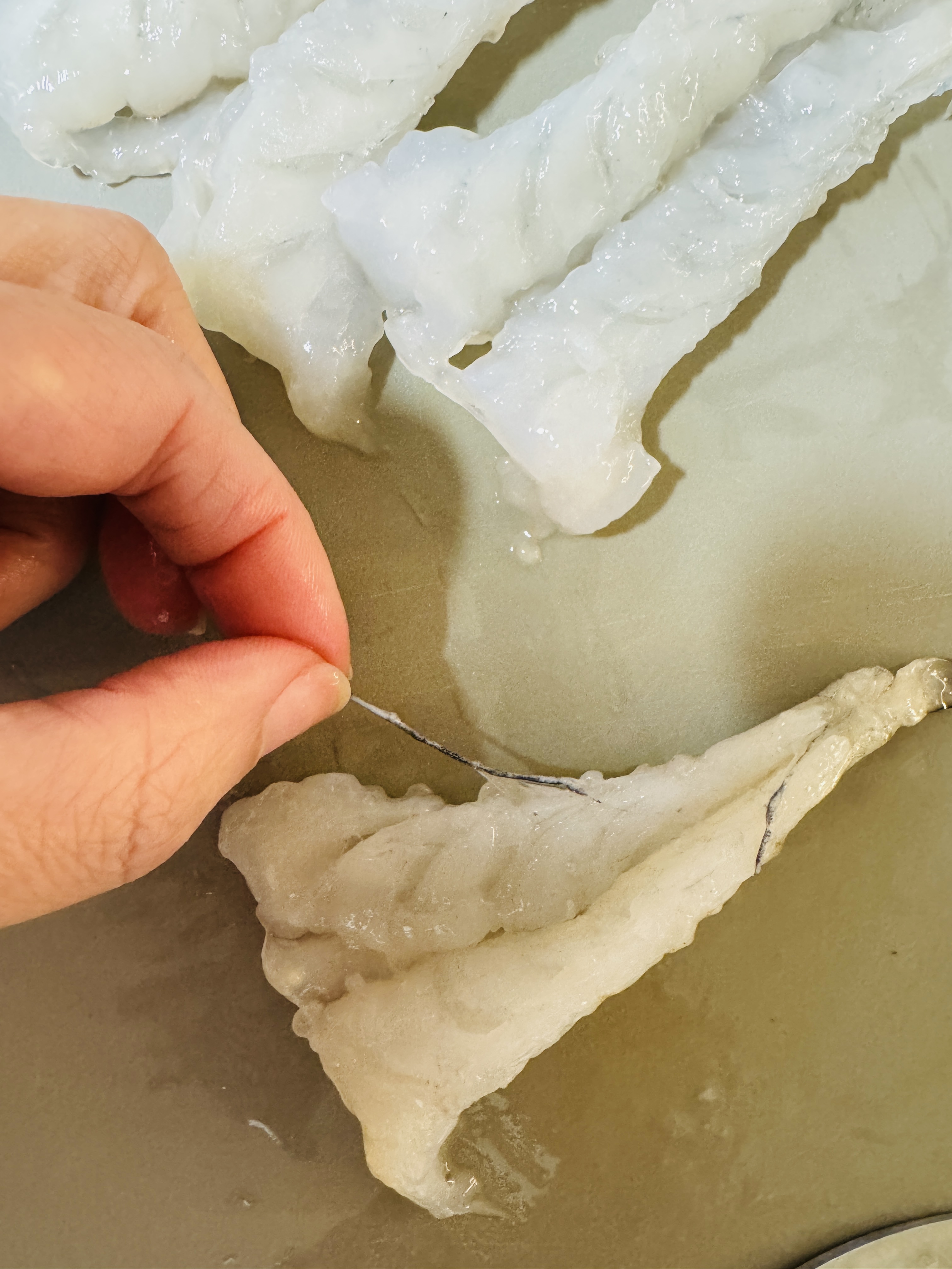 해동된 새우는 반으로 잘라 내장 제거해 주세요.