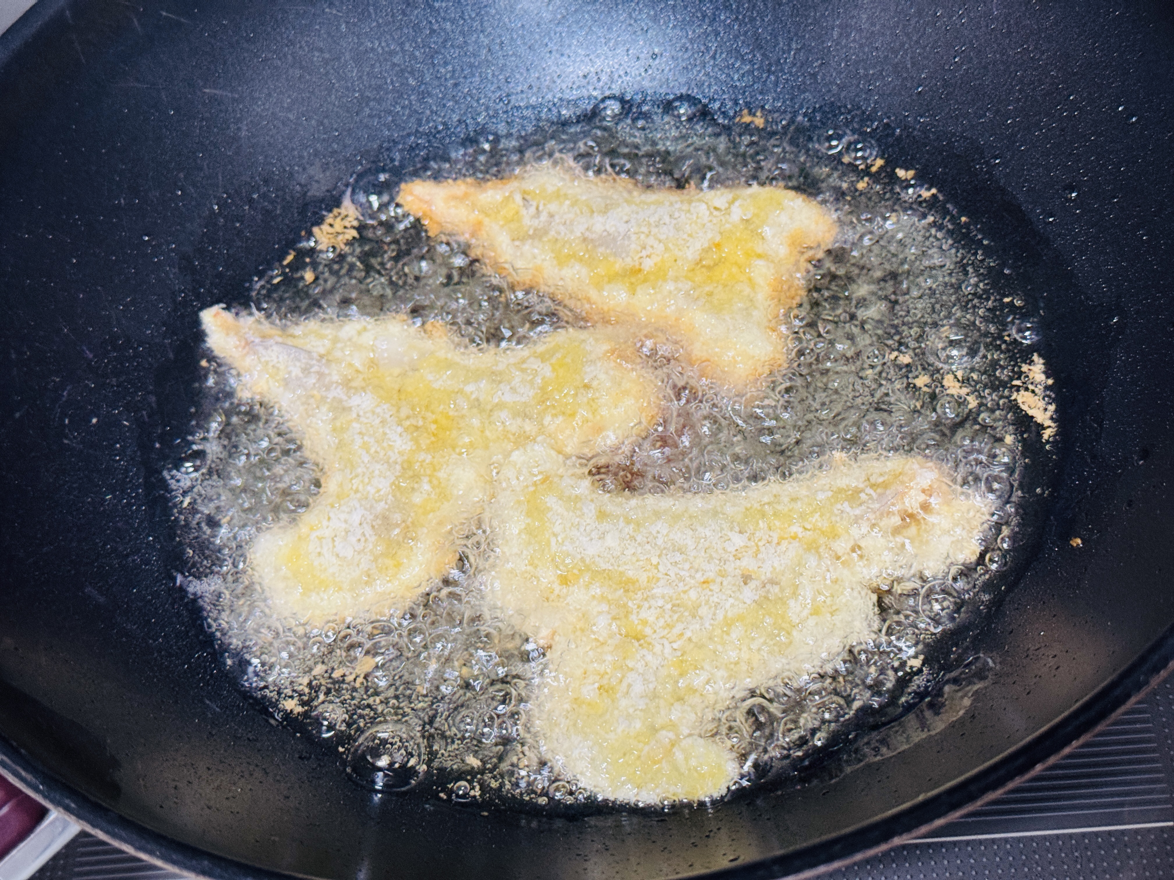 웍에 튀김이 반 잠길 정도만 기름 부어 달궈지면 새우튀김 넣어 노릇하게 튀겨냅니다.