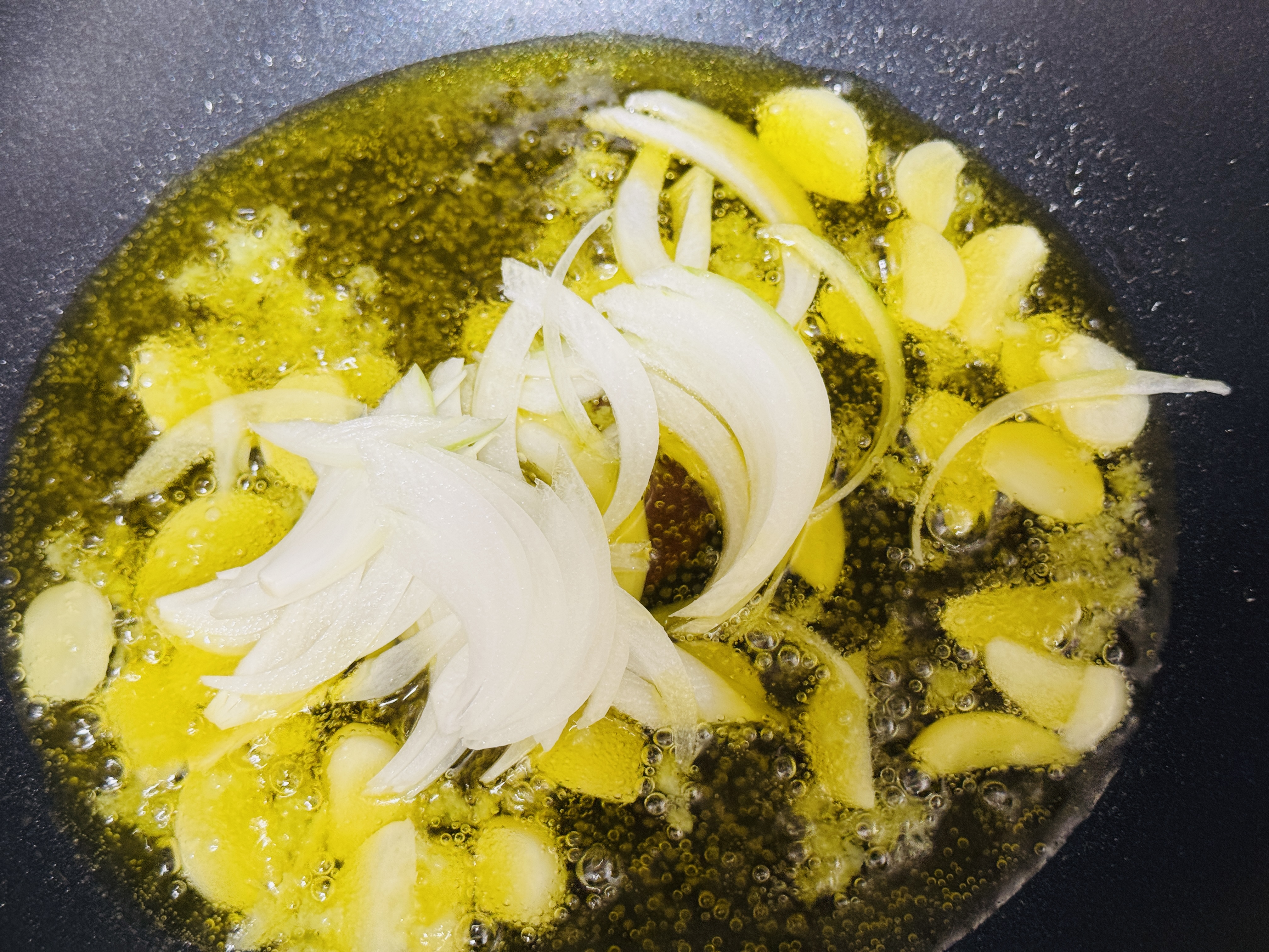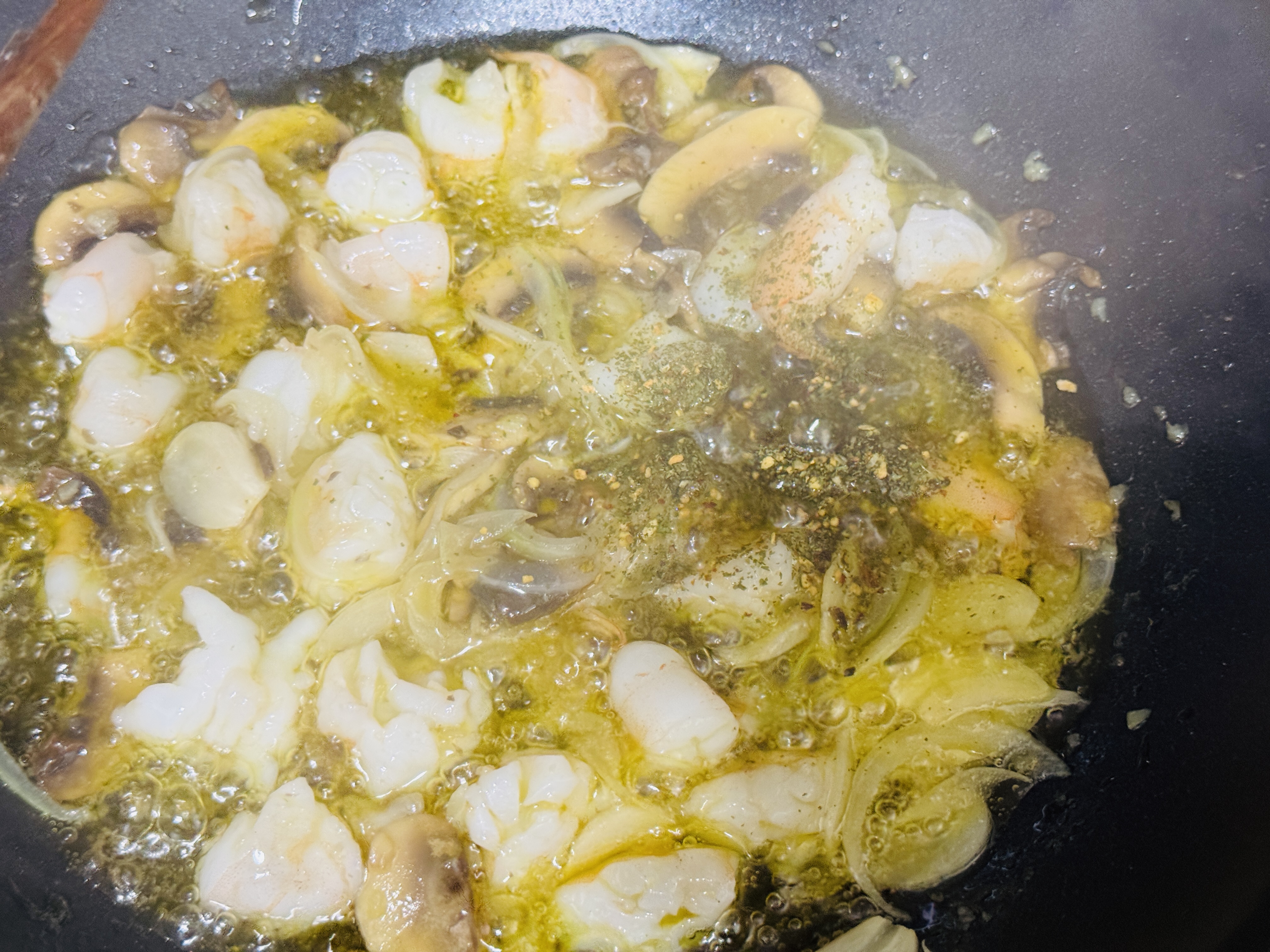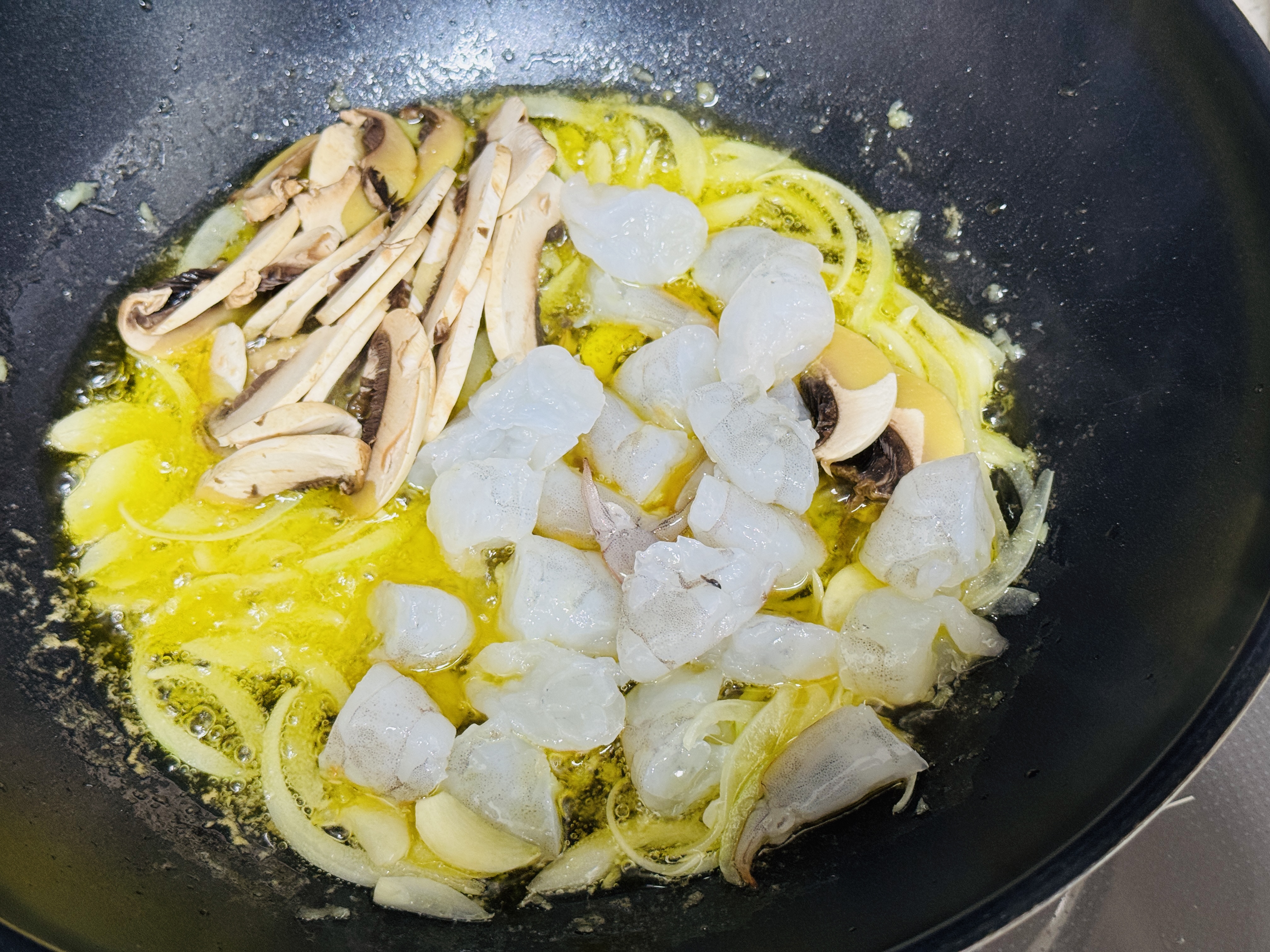 마늘향이 올라오면 양파를 넣어주고 버섯, 새우도 바로 넣어주세요.