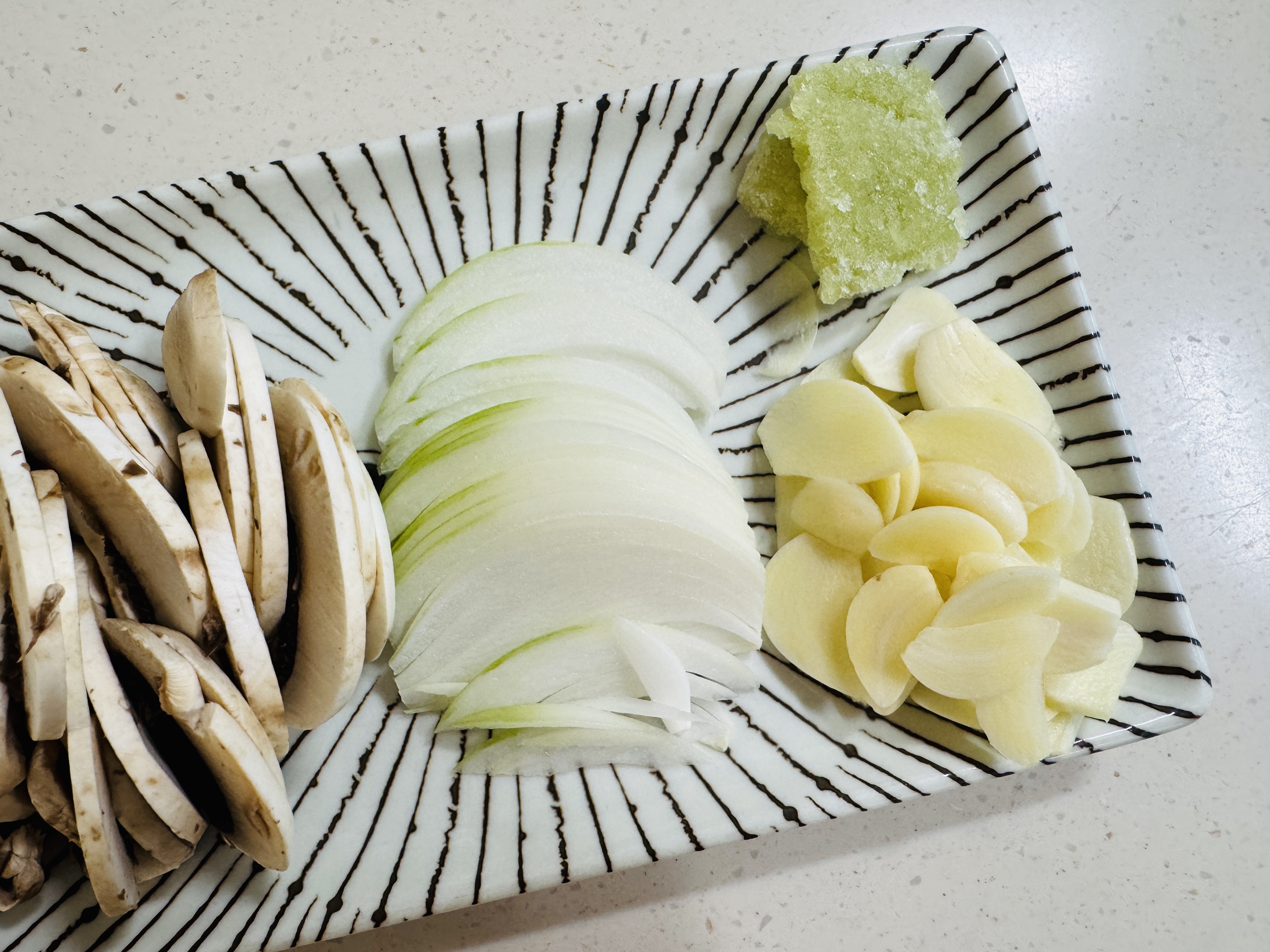 마늘은 얇게 저미고 양파와 버섯도 얇게 잘라 준비해 주세요.