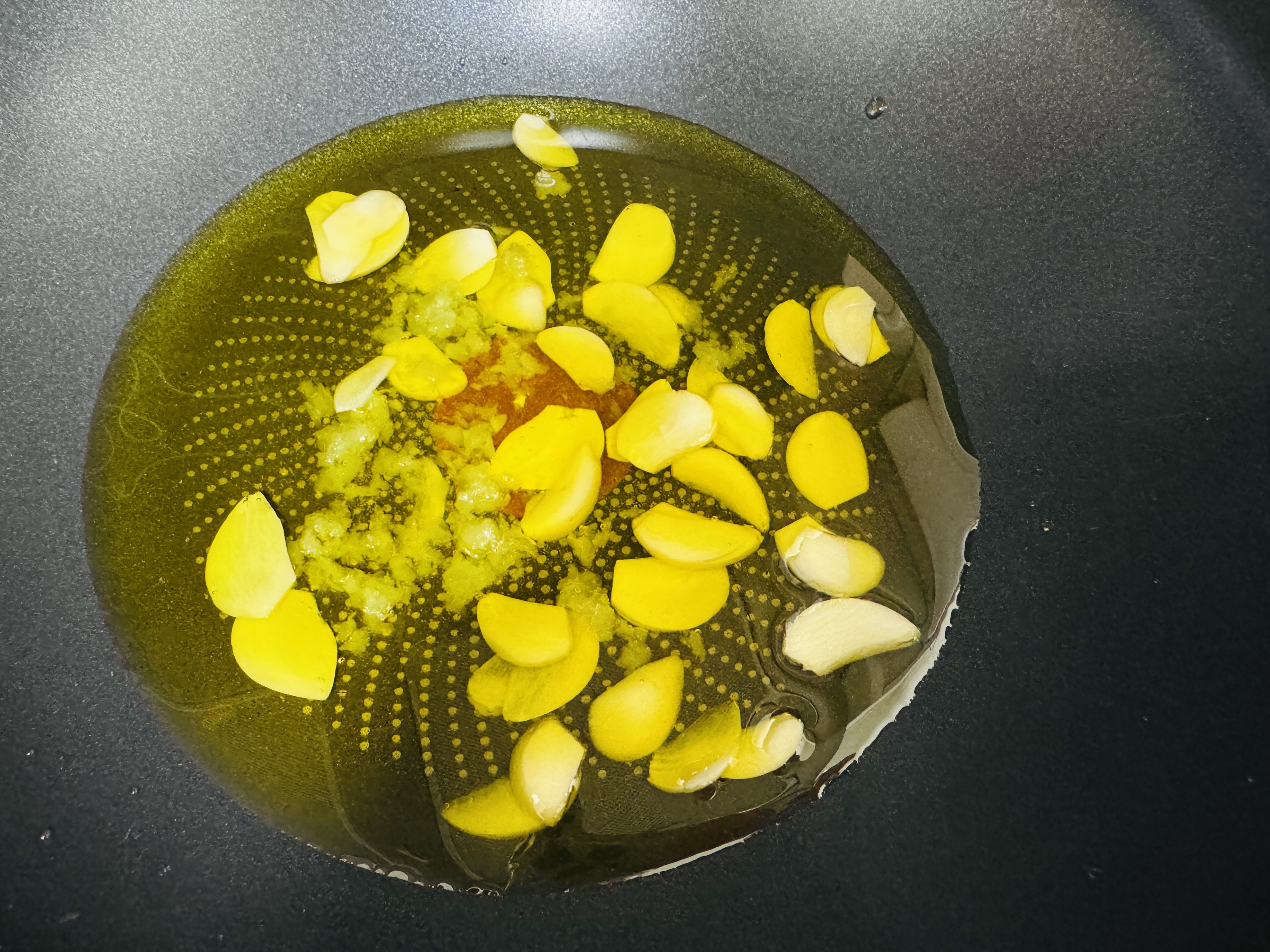 올리브 오일 반컵에 다진마늘과 저민마늘 같이 넣어 약불로 끓여주세요.