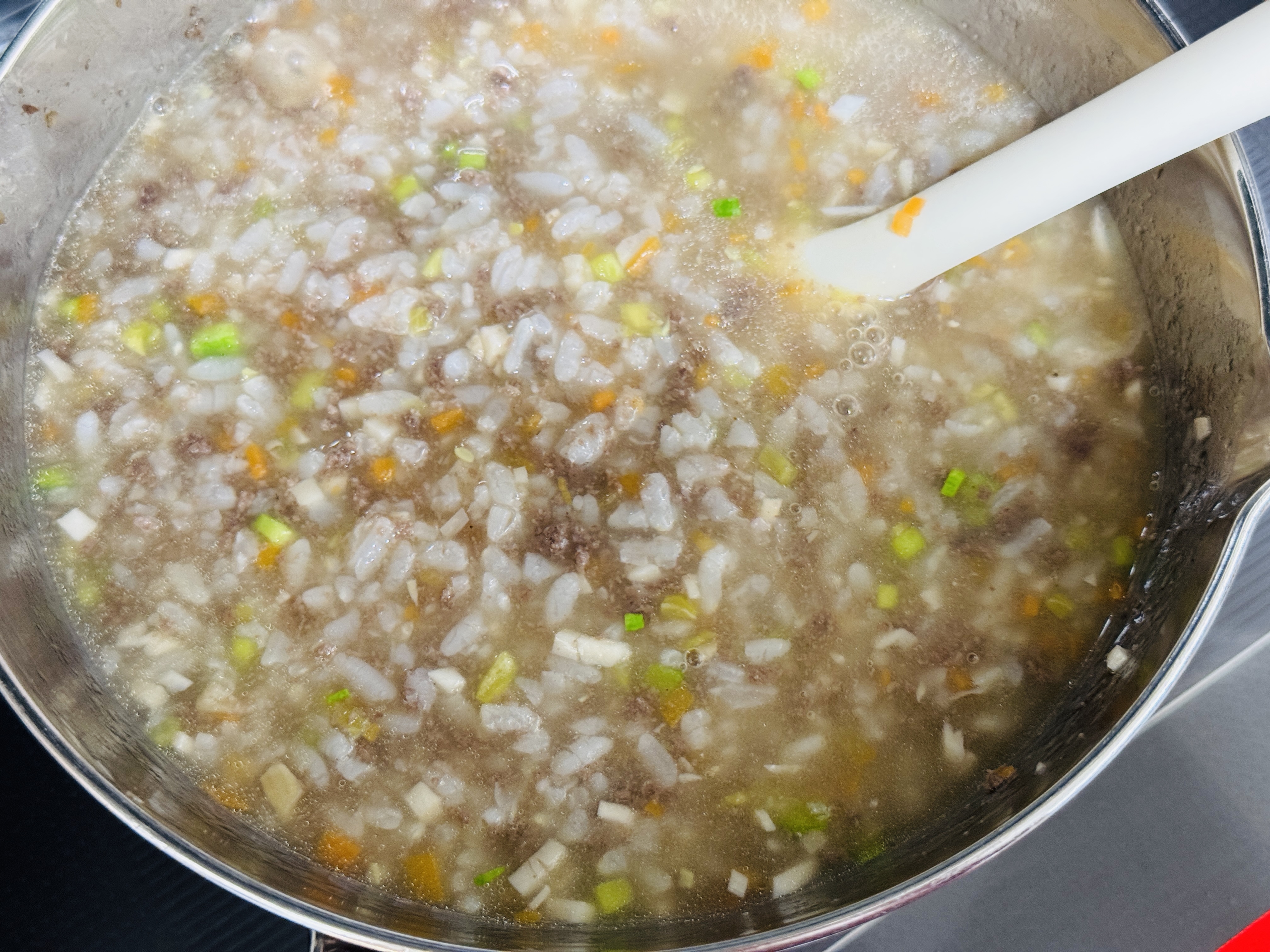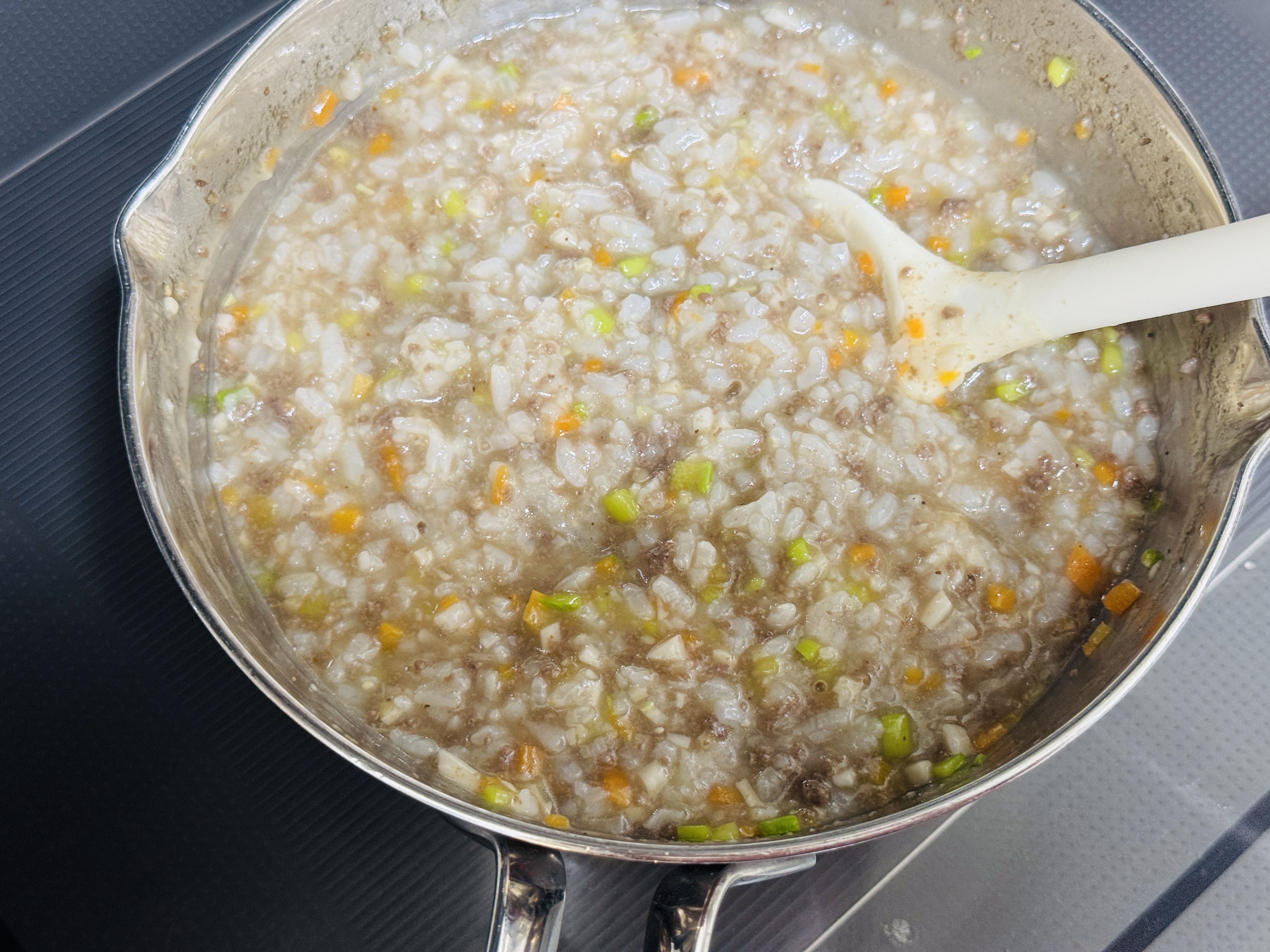 어제 아들램이 갑자기 열이 나서 밥을 잘 못먹어 냉장고 남은 재료로 소고기 야채죽 끓였어요🥲