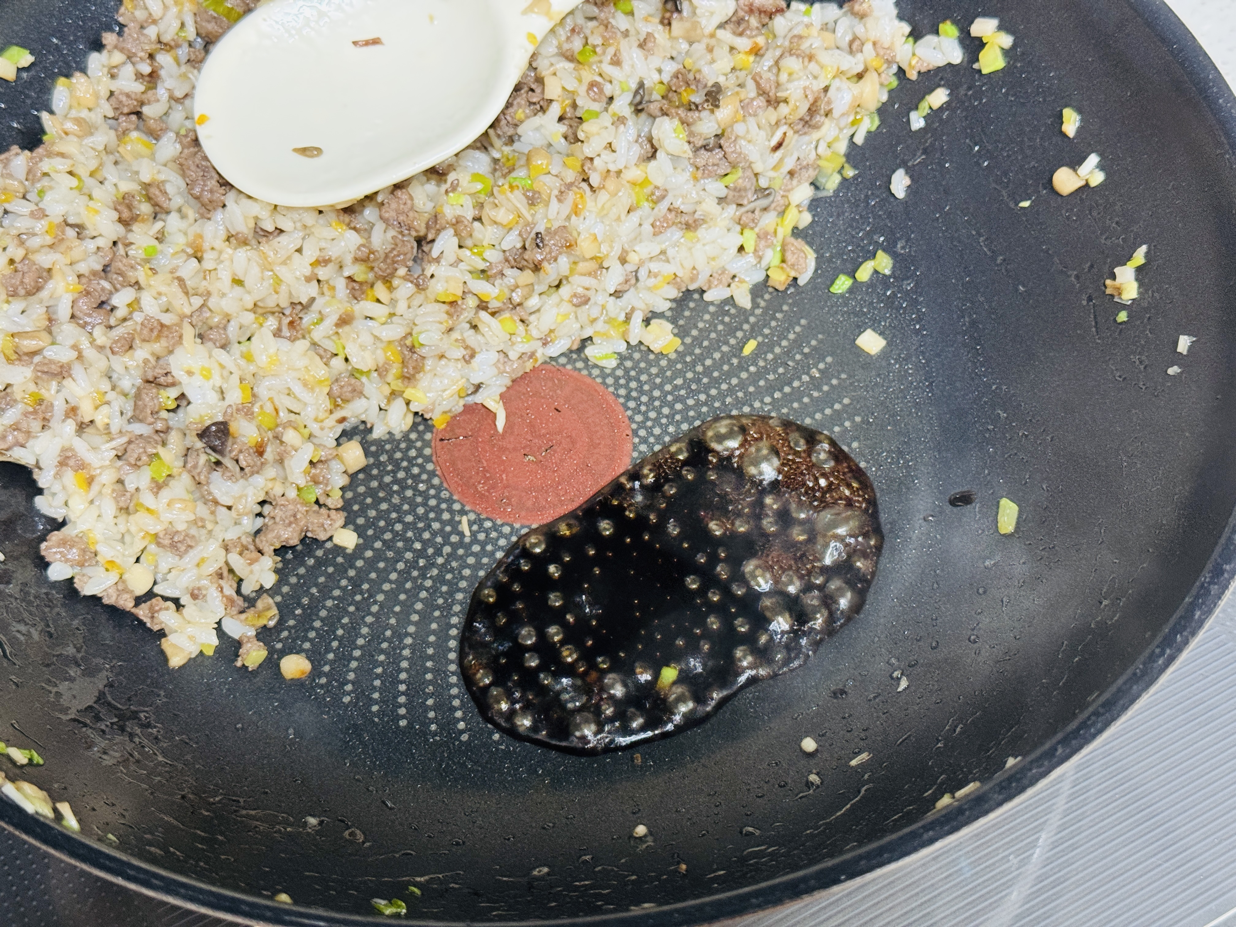 볶음밥을 한쪽으로 몰고 빈곳에 간장1T넣어 끓여 같이 볶아줍니다.