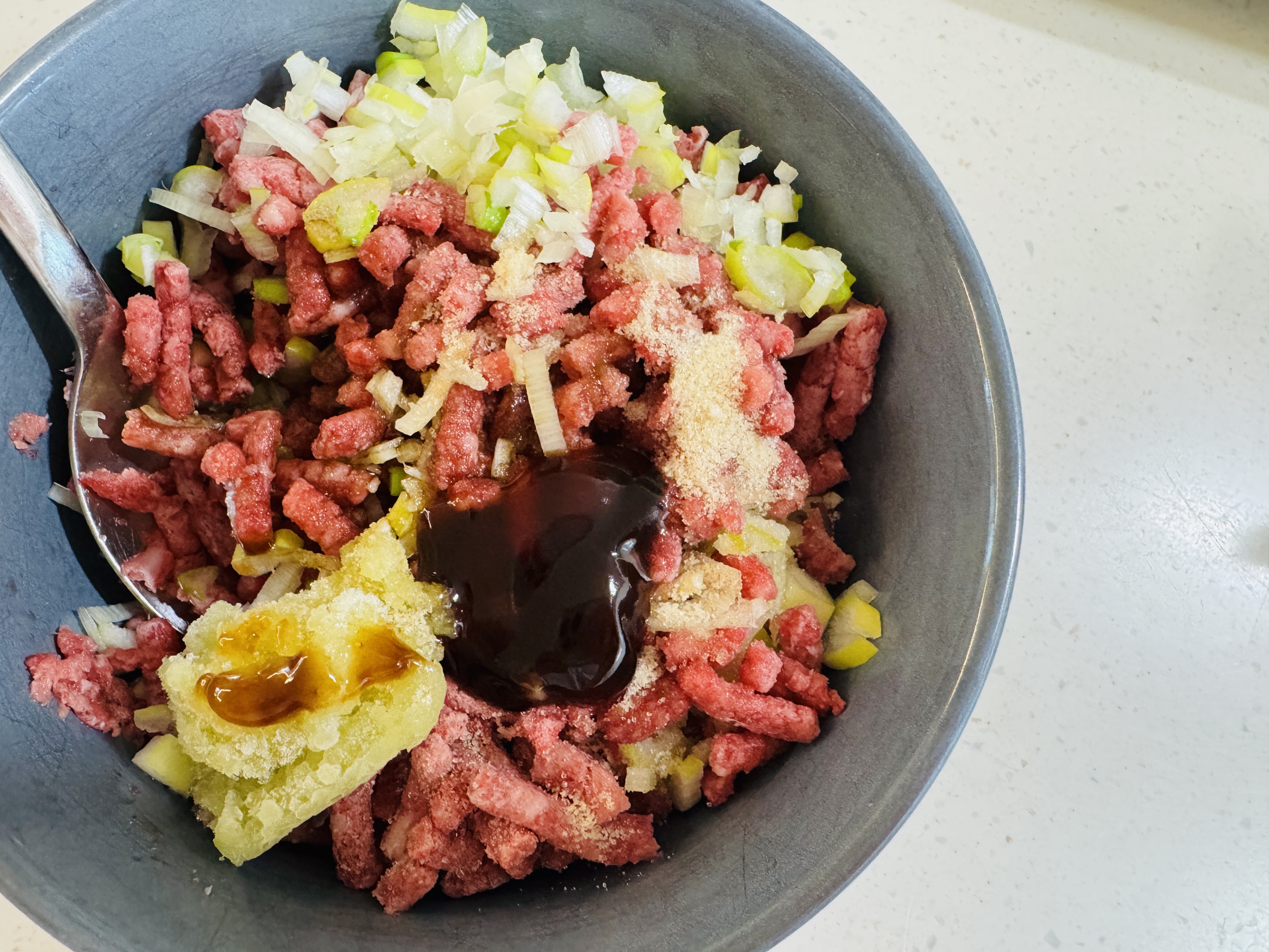 소고기 다짐육에는 진간장 1T, 설탕 1/2T, 다진마늘 1/2T, 굴소스 1/2T, 다진파 1T, 후추약간 넣어 잘 섞어 잠시 놔둡니다.