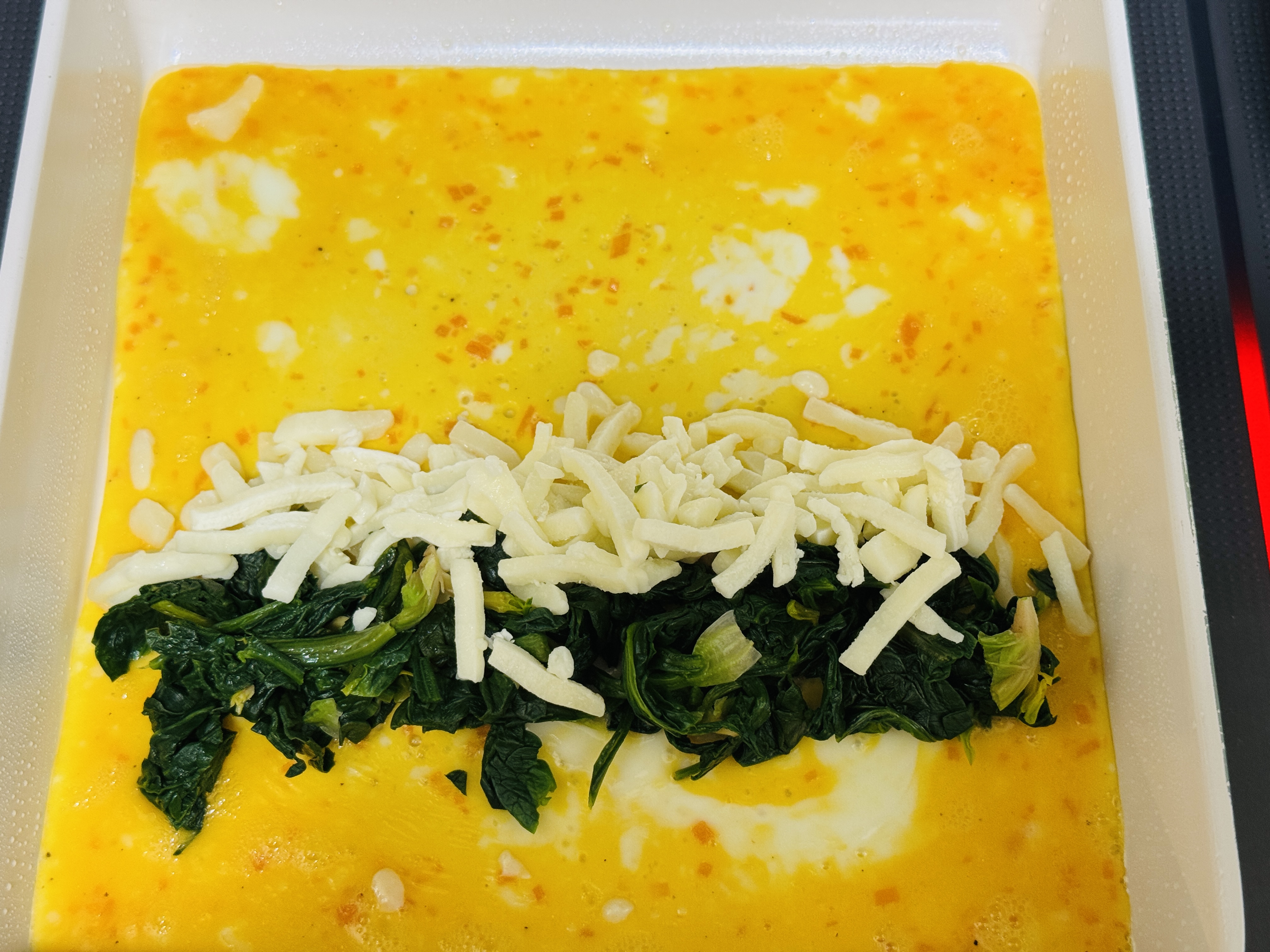 달걀이 반정도 익으면 시금치와 치즈 올려주세요.