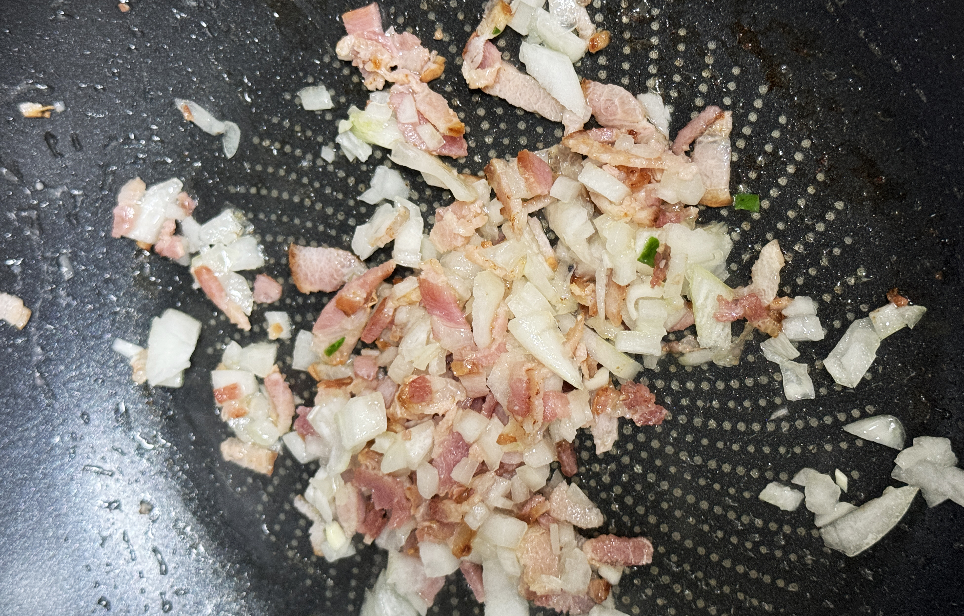펜에 베이컨이 노릇해 질때까지 볶다 다진 양파를 넣어 볶아주세요.