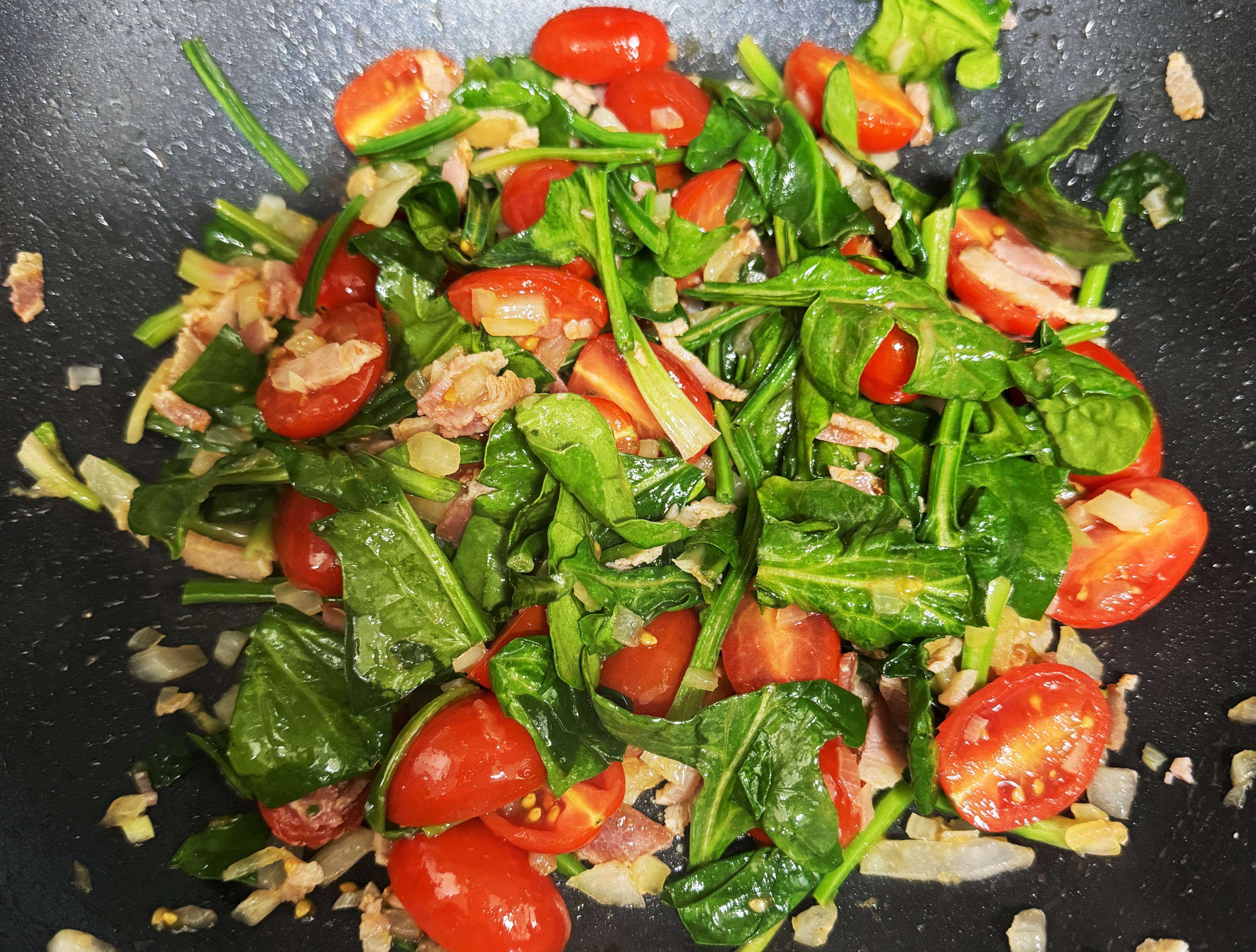 양파가 투명해 지면 시금치와 방울토마토를 넣어 숨이 죽을때까지 살짝 볶아주세요.